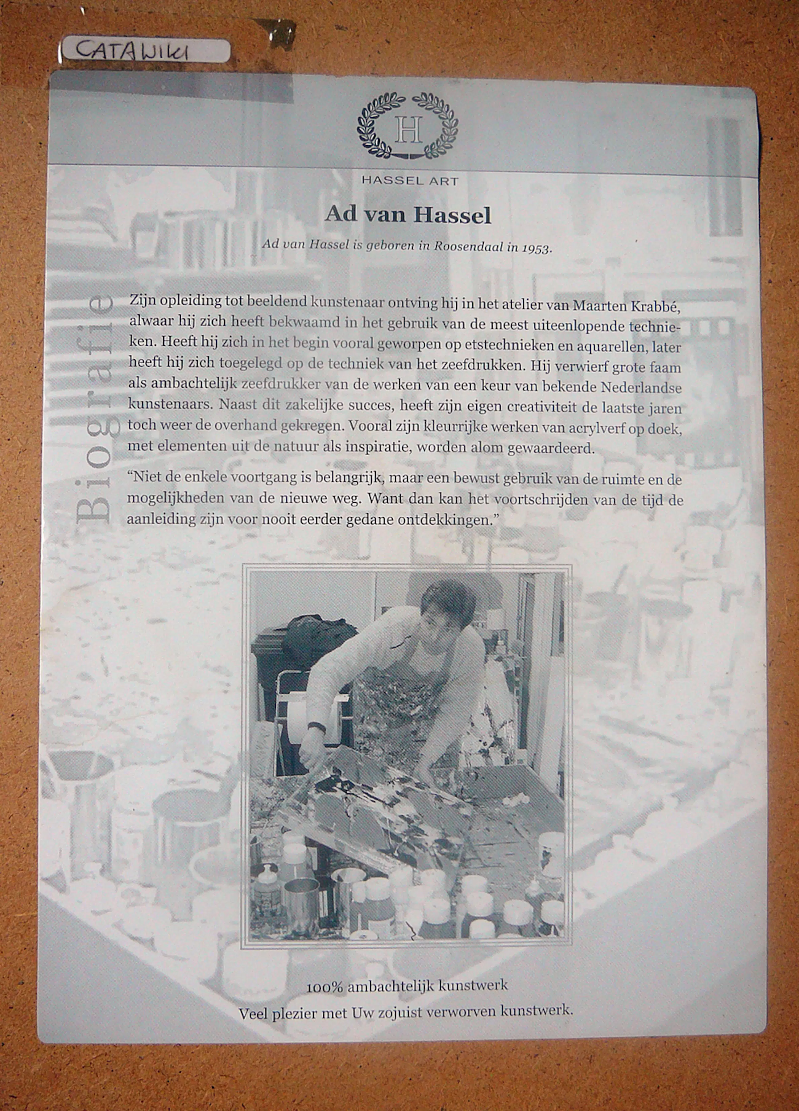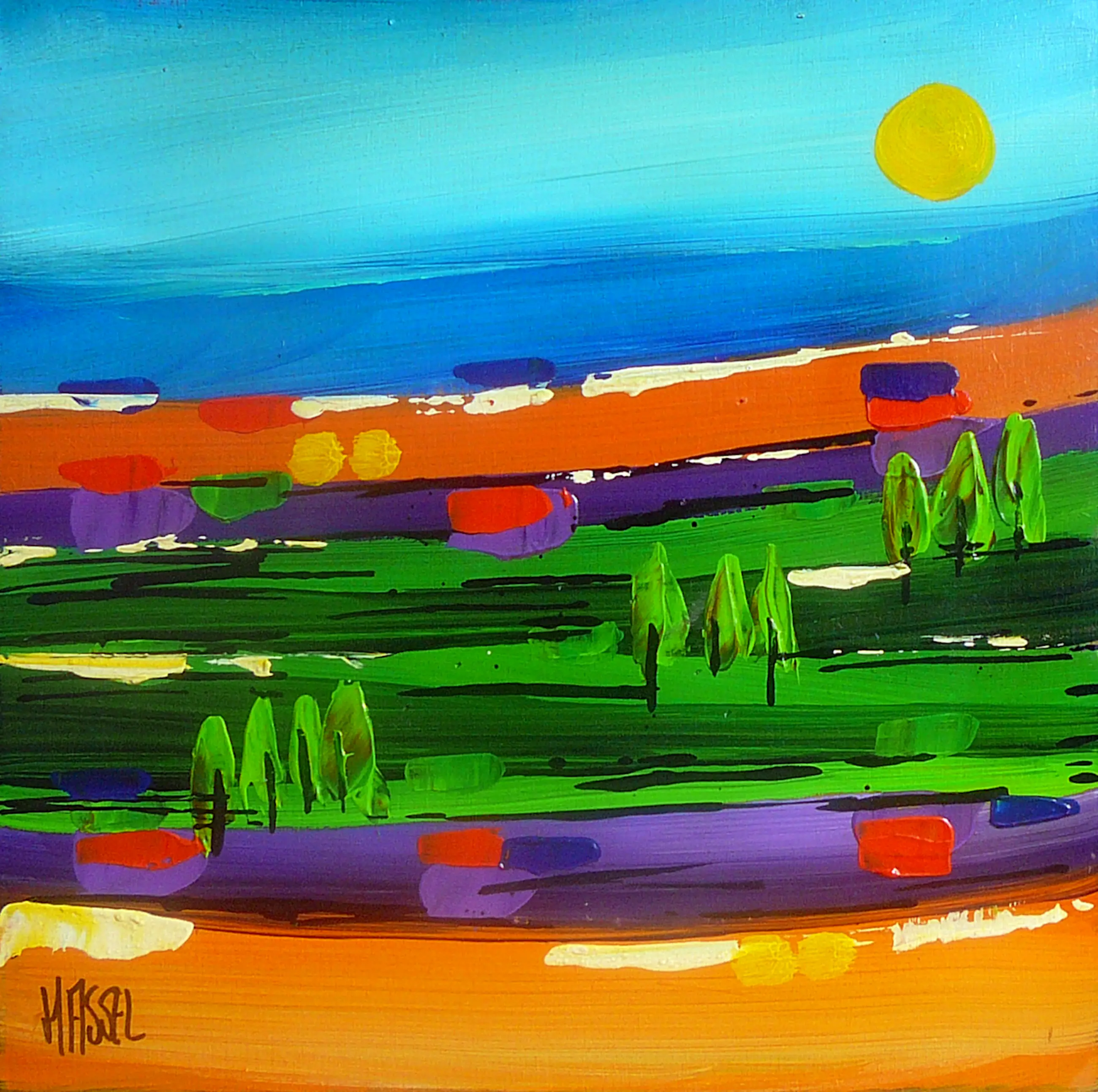 Kleurrijk werk van Ad van Hassel in zijn kenmerkende stijl. Acryl op 'zwevend'paneel in 3d-lijst. Links-onder gesigneerd en in zeer goede staat.