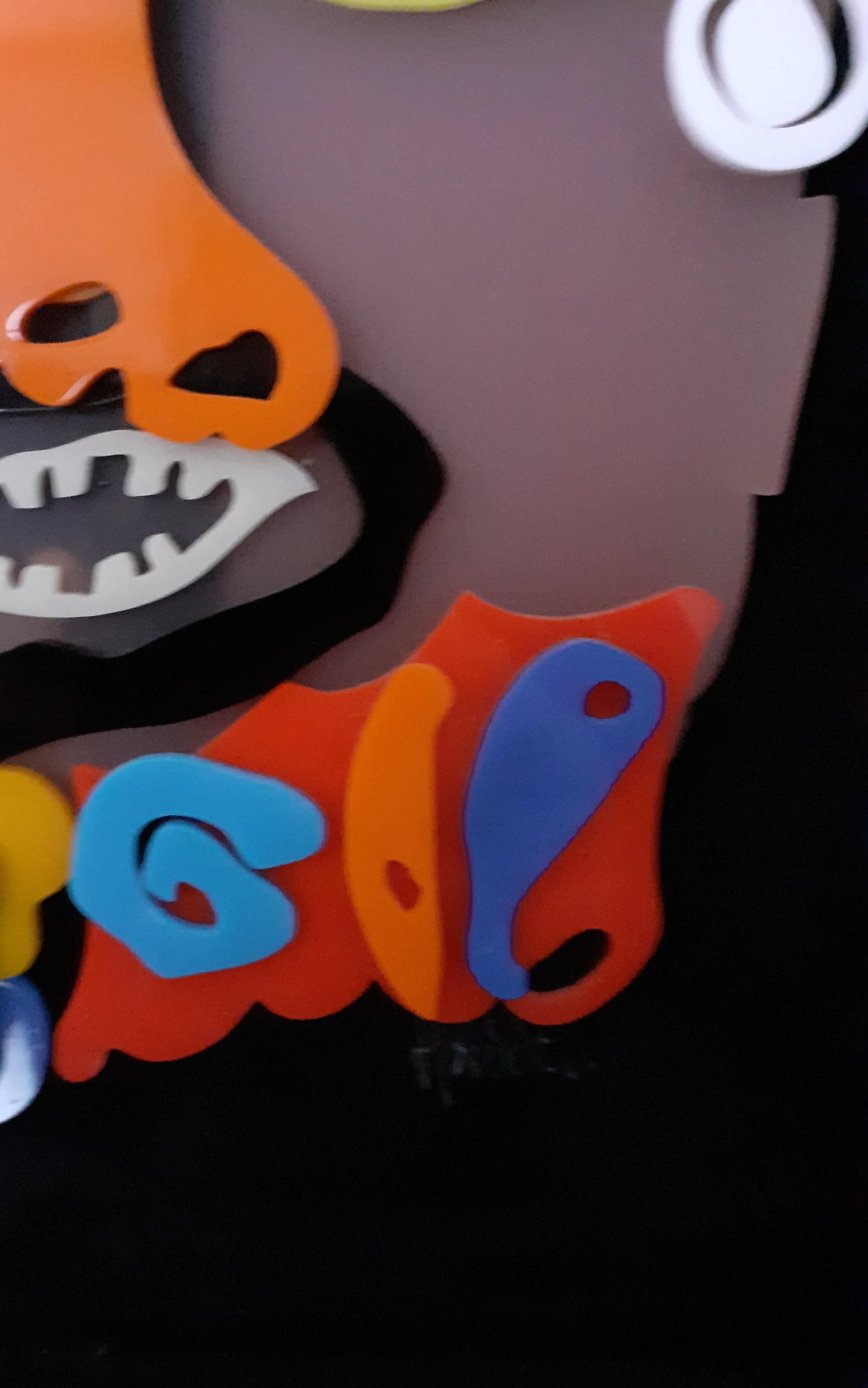 Laser gesneden perspex in verschillende kleuren aan elkaar geassembleerd. Prachtig ingelijst in zeer luxe baklijst.