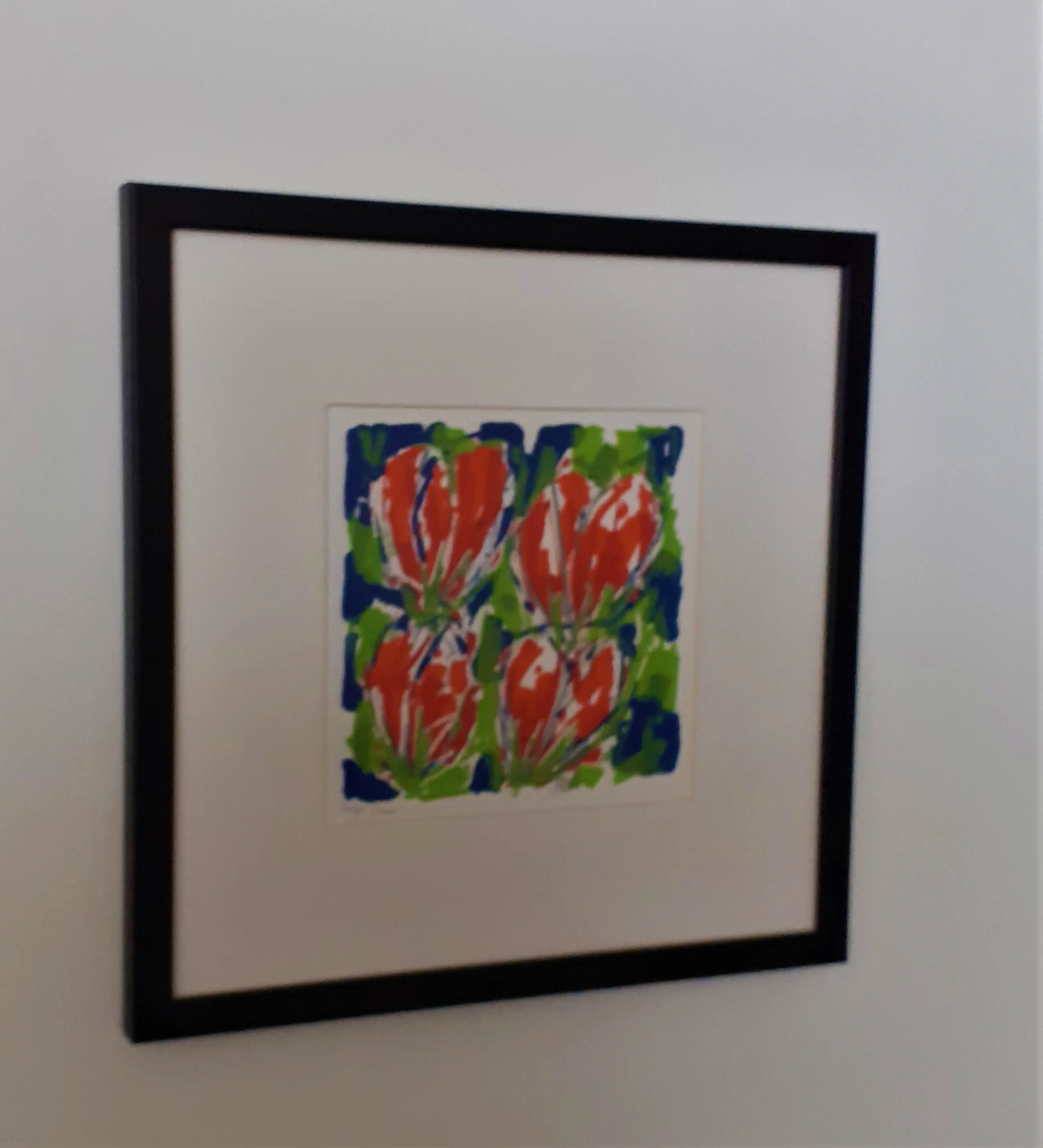 Werk is prachtig ingelijst met zwarte lijst en passepartout.