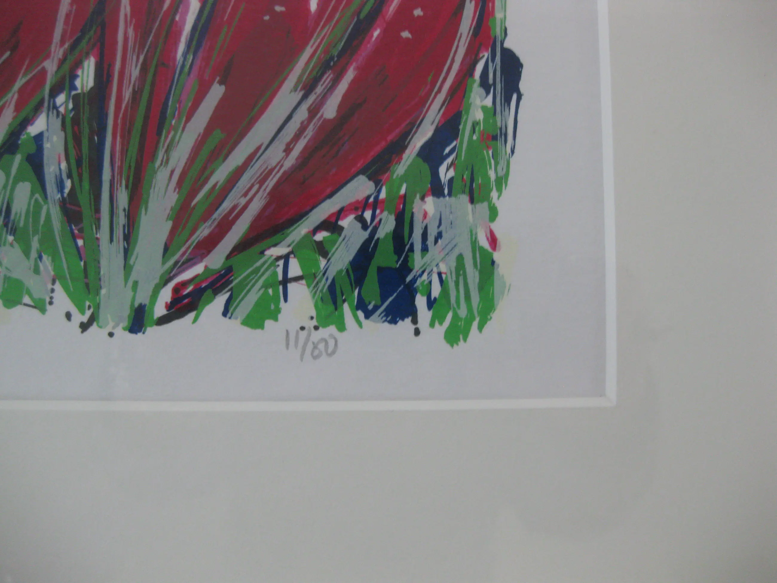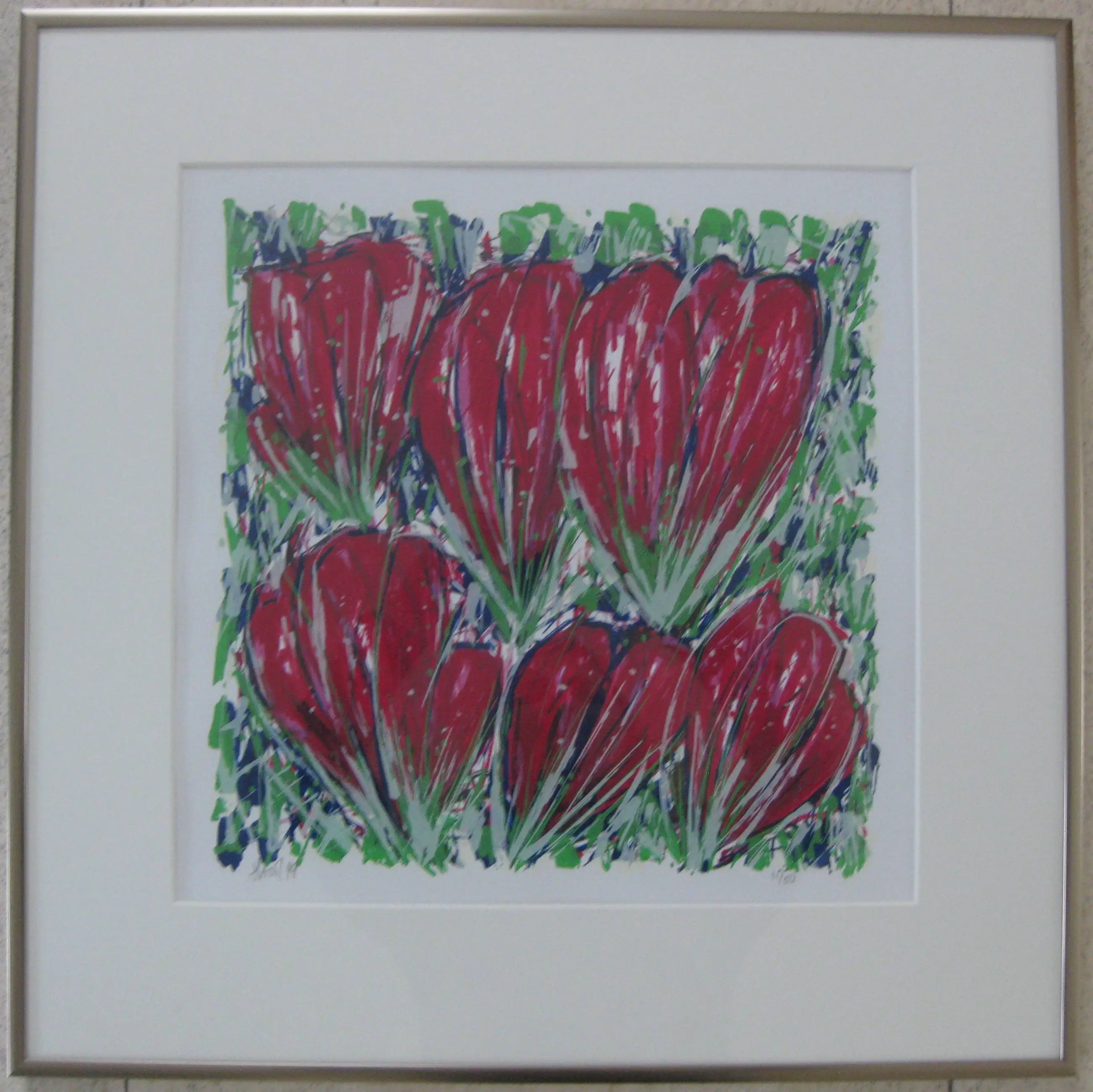 Mooie zeefdruk van Ad van Hassel: Tulpen donker rood De zeefdruk is 50 x 50 cm , het beeld ongeveer 35 x 35 cm De aluminium bronskleurige lijst (goeie kwaliteit!) is 50 x 50 cm Voorzien van passe-partout natuurwit