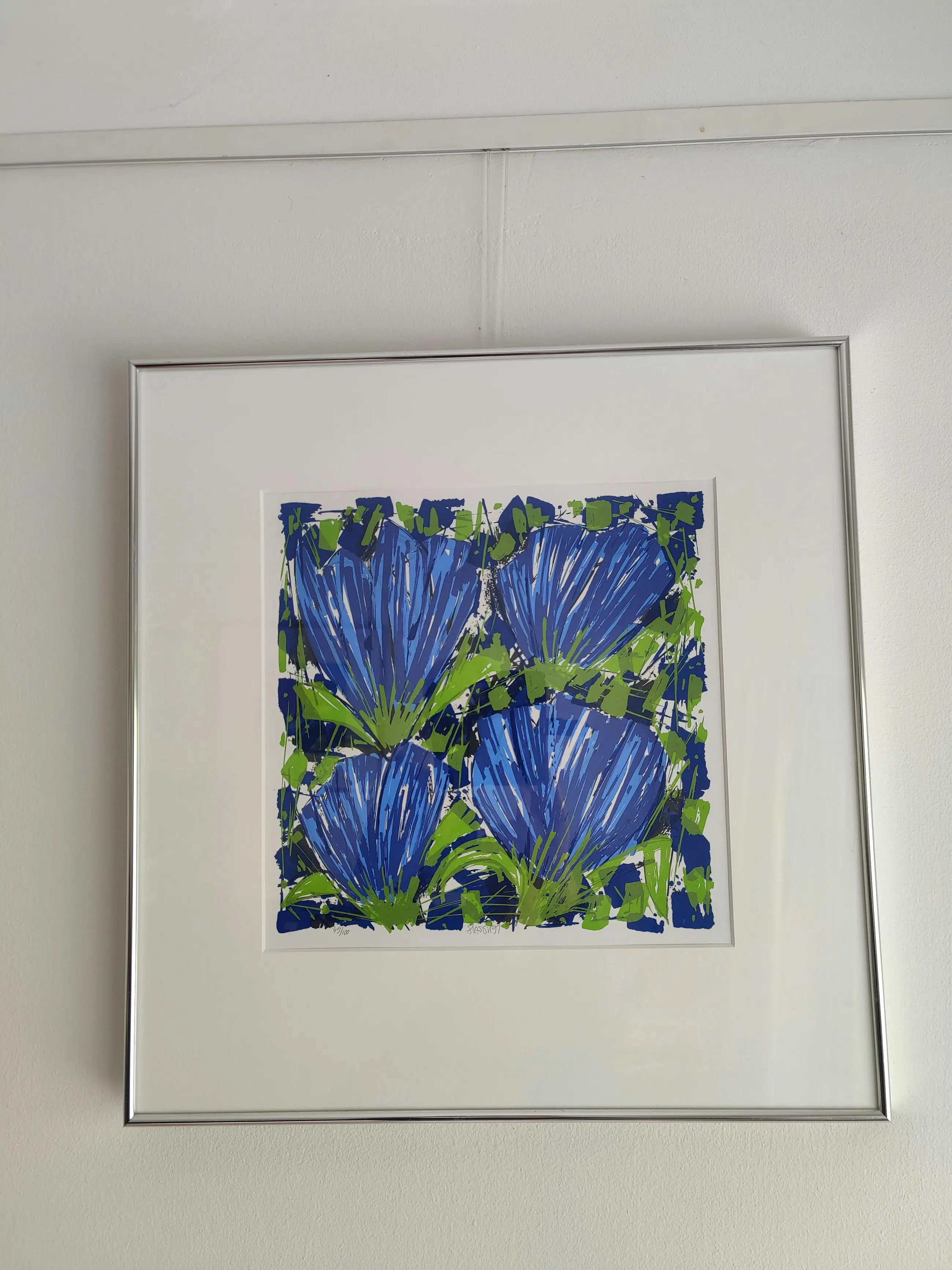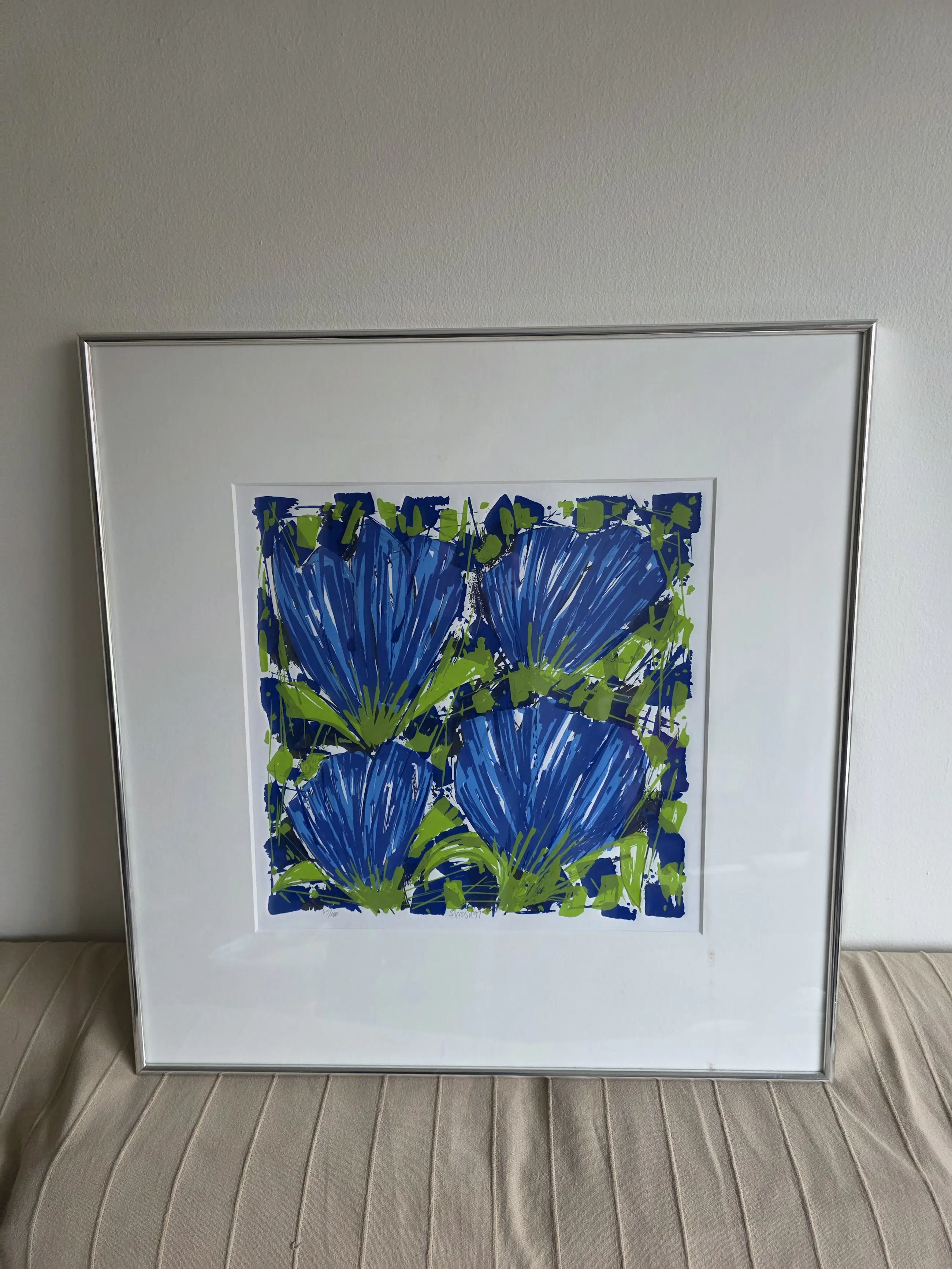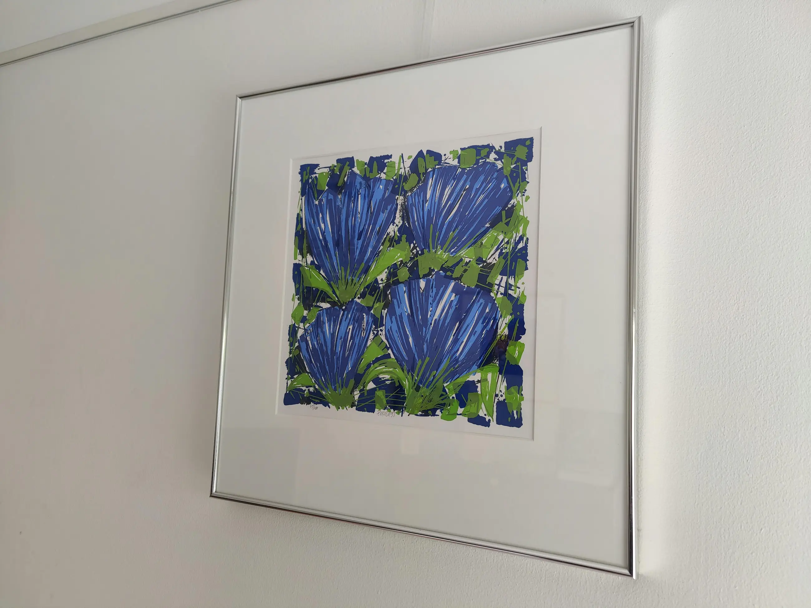 Breng kleur en elegantie in huis met deze prachtige zeefdruk van de gerenommeerde kunstenaar A. van Hassel. Het werk toont sierlijke tulpen in een schitterende blauwtint – een tijdloos en sfeervol kunstwerk dat direct in het oog springt. Een echte blikvanger voor liefhebbers van bloemen en moderne kunst.