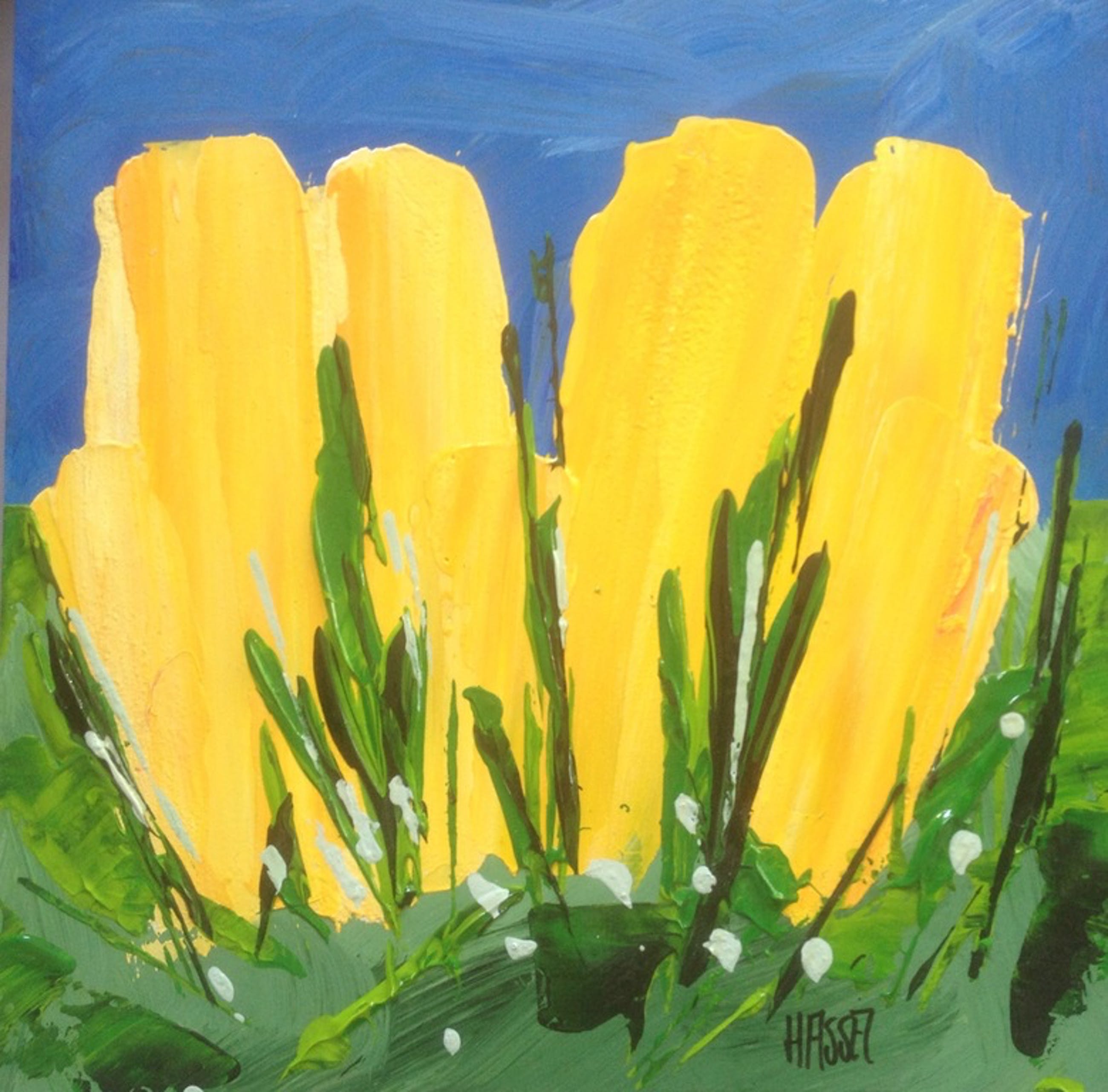 Tulpen geschilderd met acrylverf op een MDF paneel, dit MDF paneel is zwevend ingelijst in een mooie luxe baklijst. Kan direct aan de muur. Lijst is aan de achterzijde voorzien van een biografie van Ad.