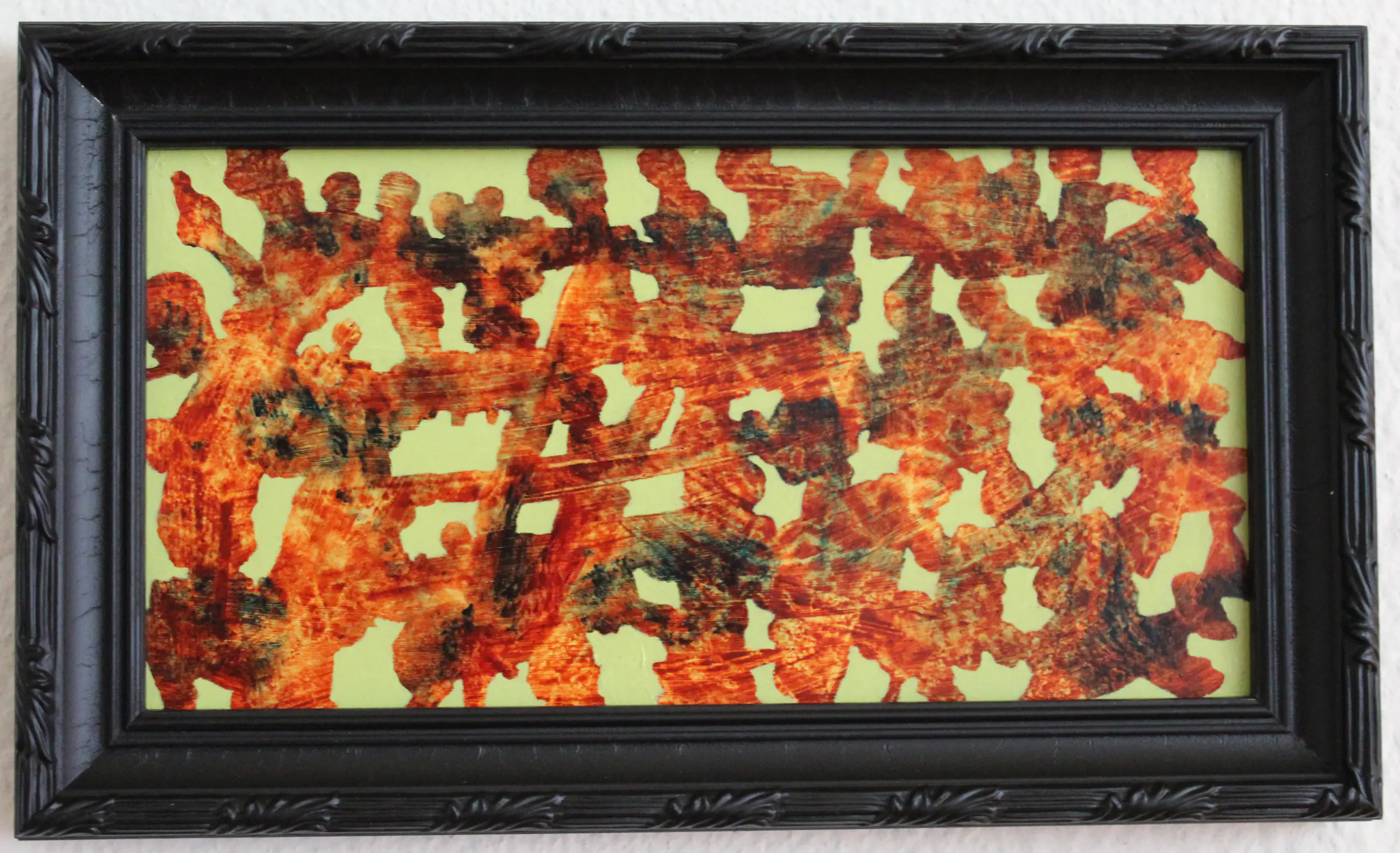 Ingelijst in zwarte houten lijst in barokstijl.