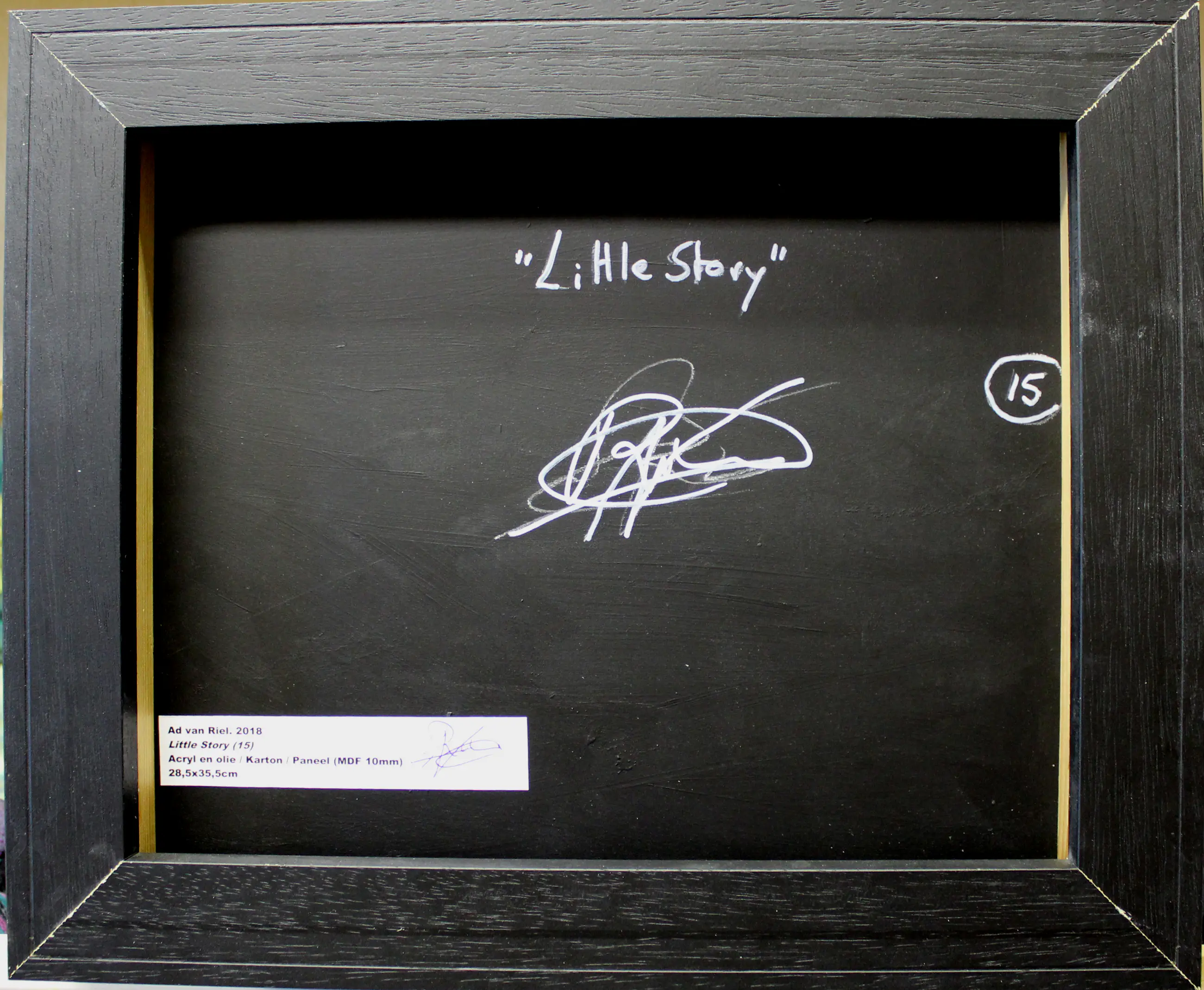 Ingelijst in zwarte baklijst. Dikte lijst: 6 cm.
