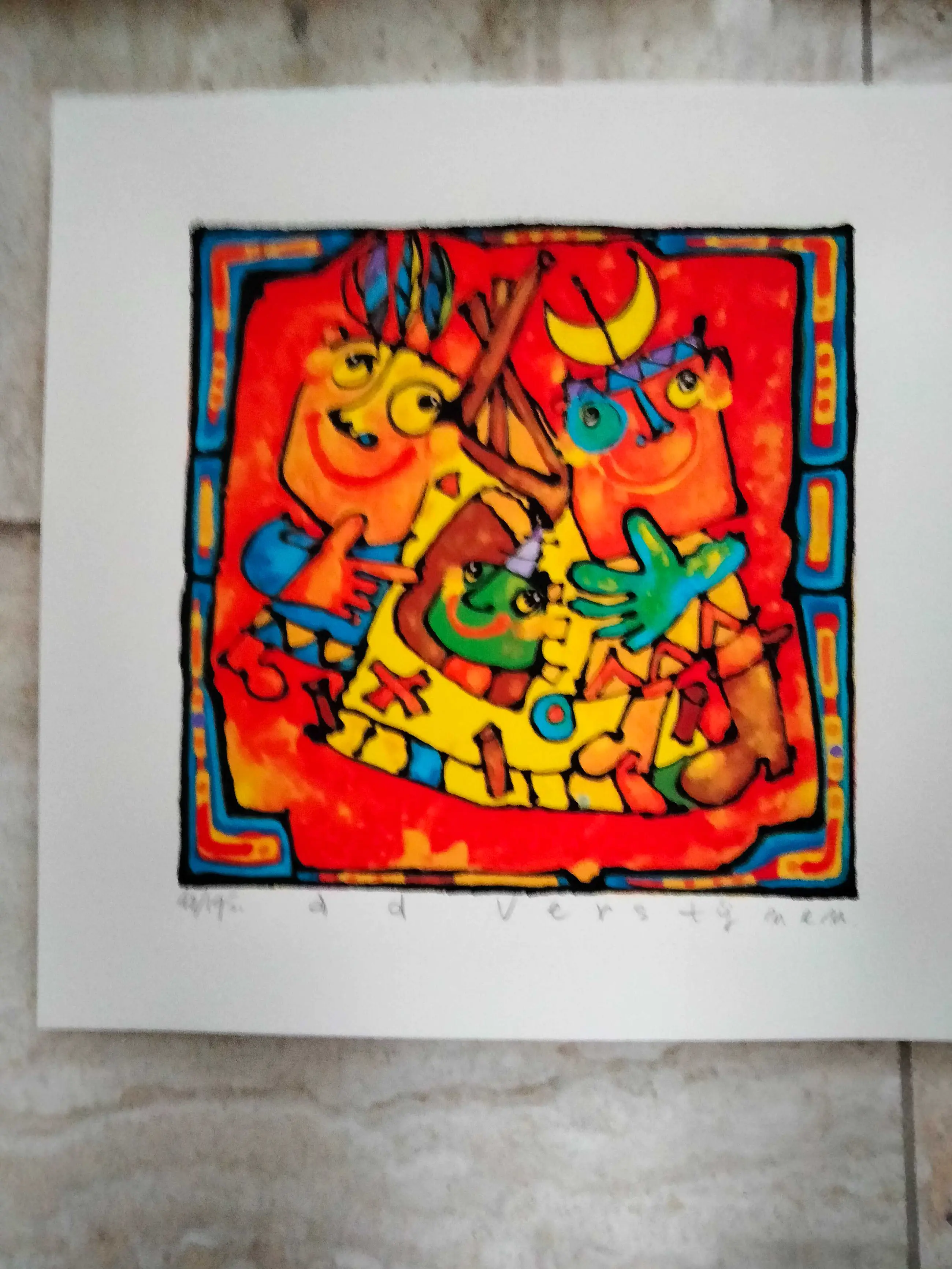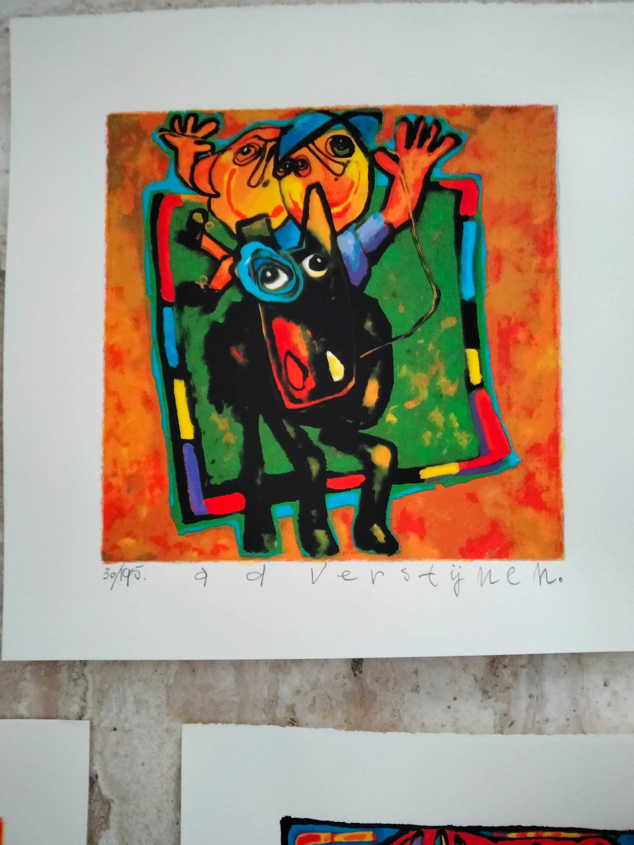 Kleurrijke in complete nieuwstaat verkerende zeefdrukken van ad verstijnen. De werken zijn nog nooit ingelijst geweest Het betreft hier 5 zeefdrukken. De werken waarop u bied hebben de volgende oplage nummers Oplage nummer s 130195 24/195 36/195 79/195 58/195