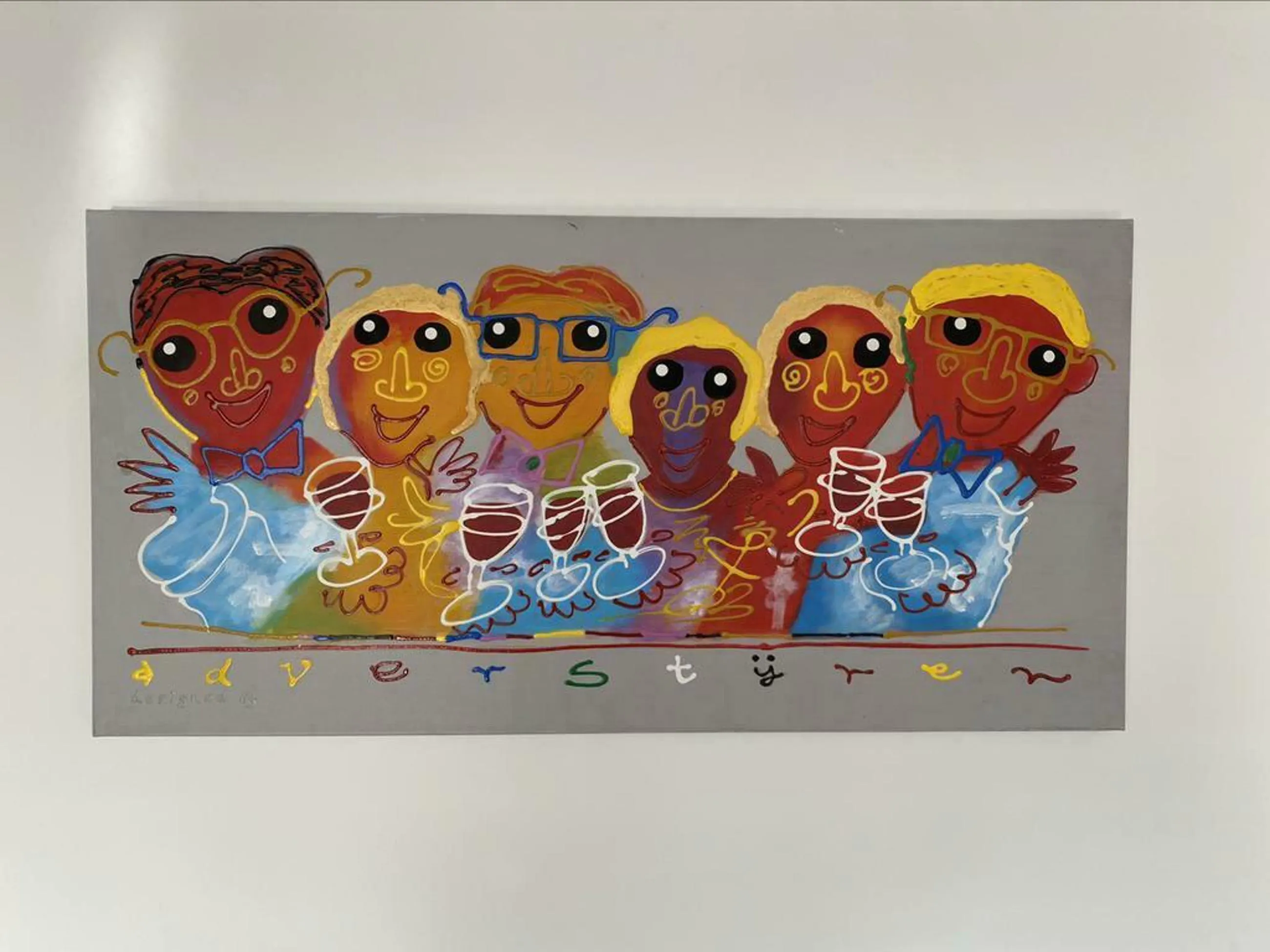 Mooi, vrolijk, kleurrijk schilderij 70x140 (hxb). Opgespannen op een houten frame en kan dus zo aan de muur worden opgehangen. Zilveren achtergrond.
