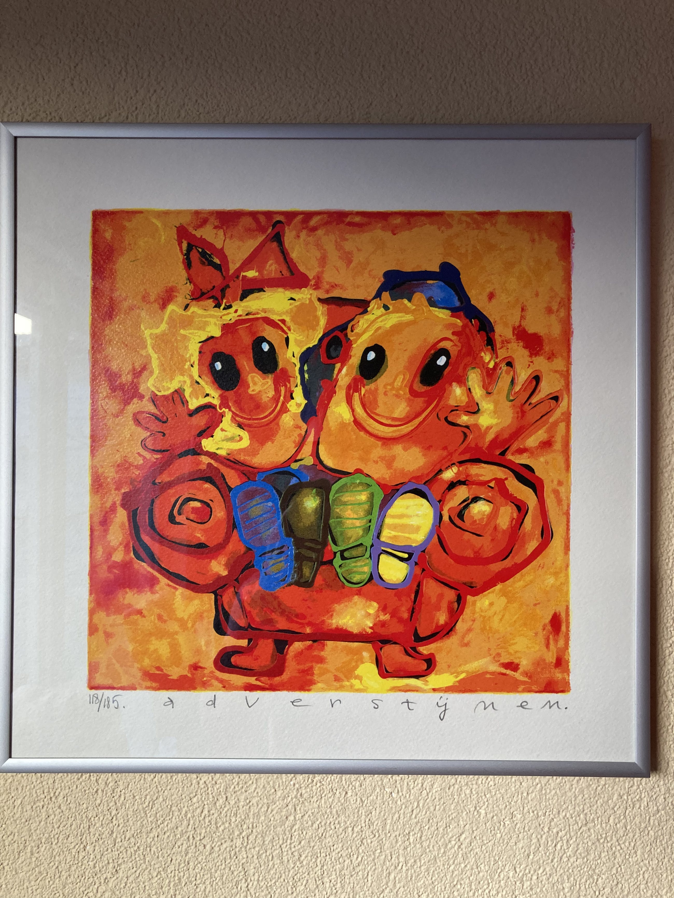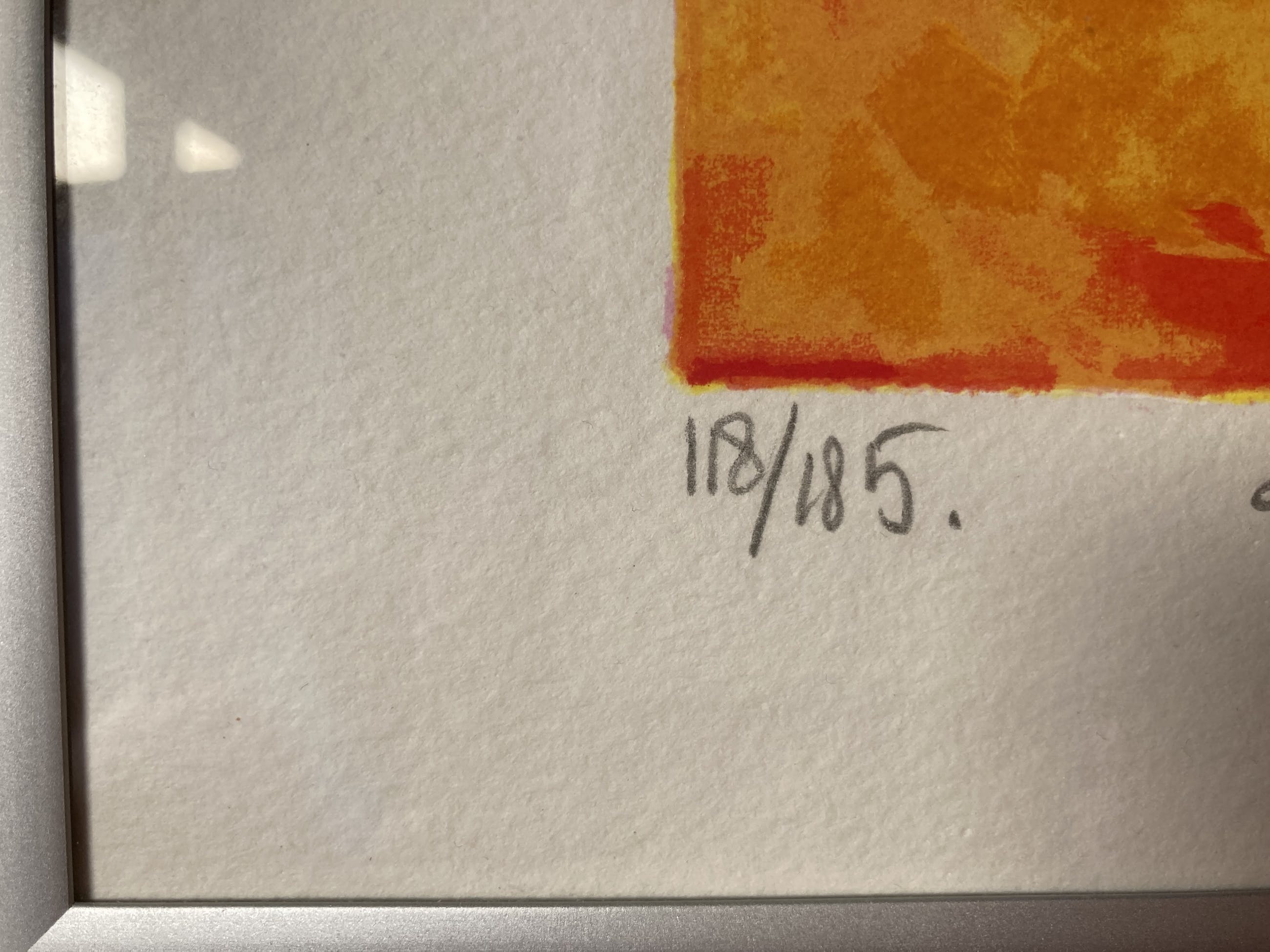 Deze vrolijke zeefdruk is in genummerde oplage uitgebracht (118/185) en met de hand gesigneerd.