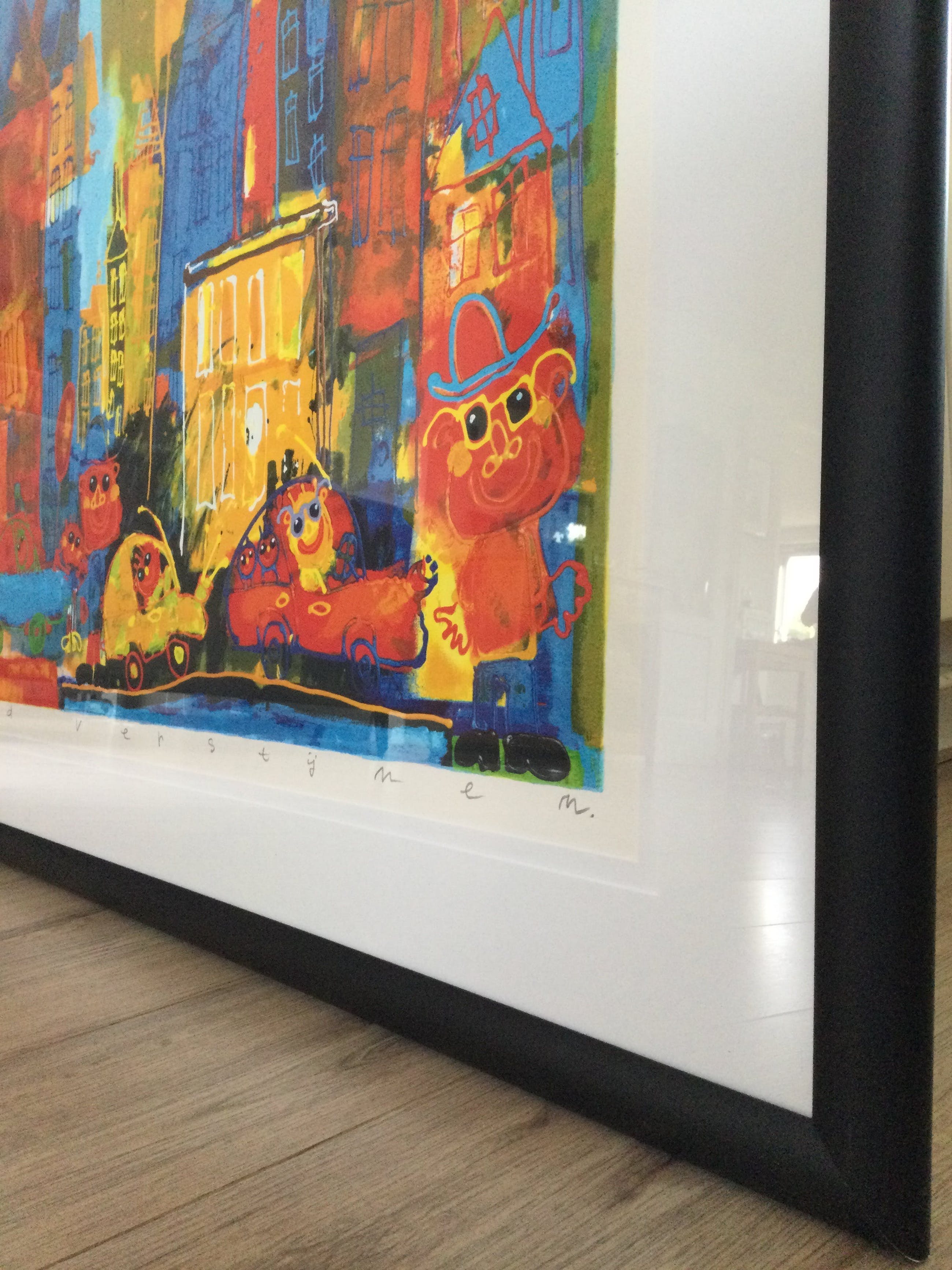 De zeefdruk zit in een prachtige zwart metalen (aluminium) wissellijst met dubbele passe-partout!