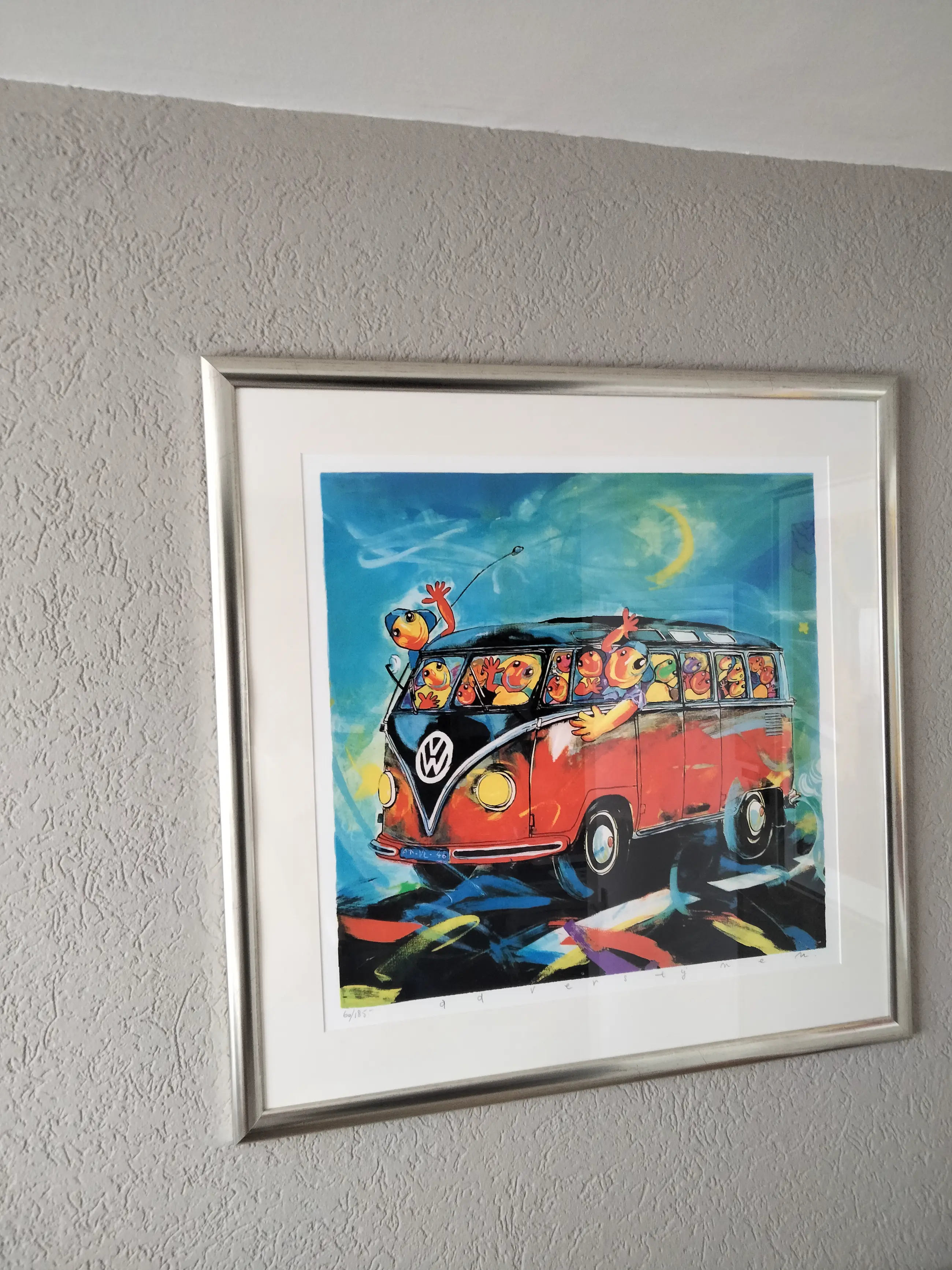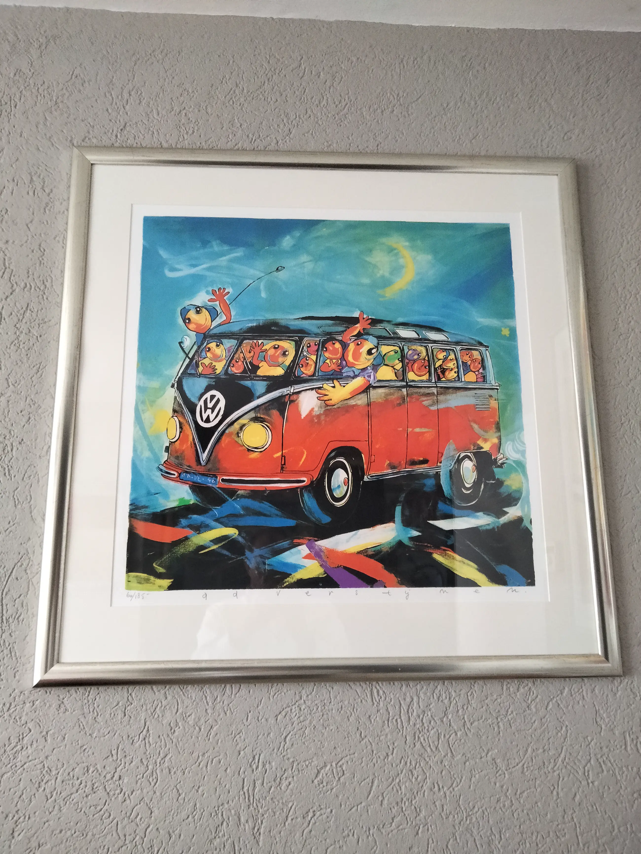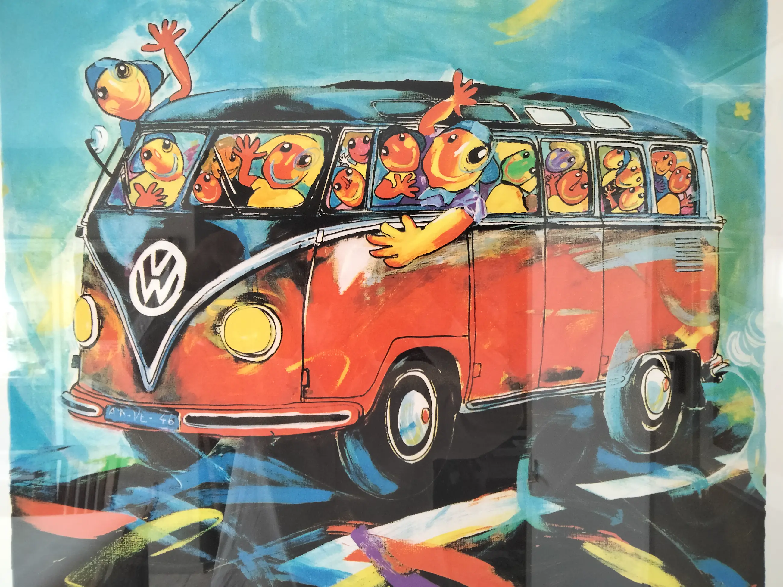 Zeer fraaie en grote zeefdruk van ad verstijnen. Oplagenummer:60/185. Vrolijk kleurrijke weergave van een vw-busje Fraai ingelijst ophangklaar. Uiteraard gesigneerd en genummerd in potlood door verstijnen.