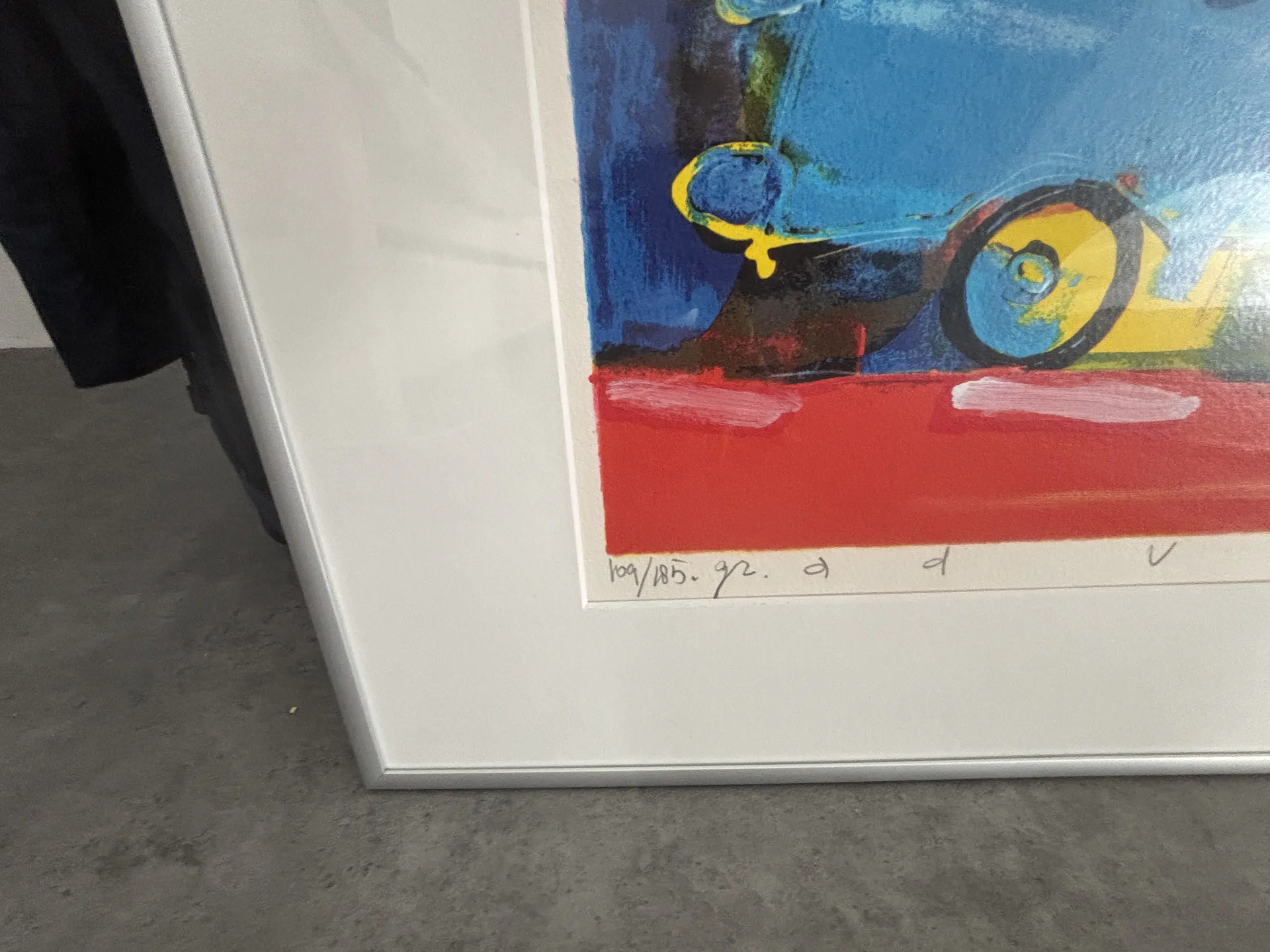 Vrolijke abstracte zeefdruk van Ad Verstijnen met huizen en auto’s op grijze achtergrond in lijst met passe partout.