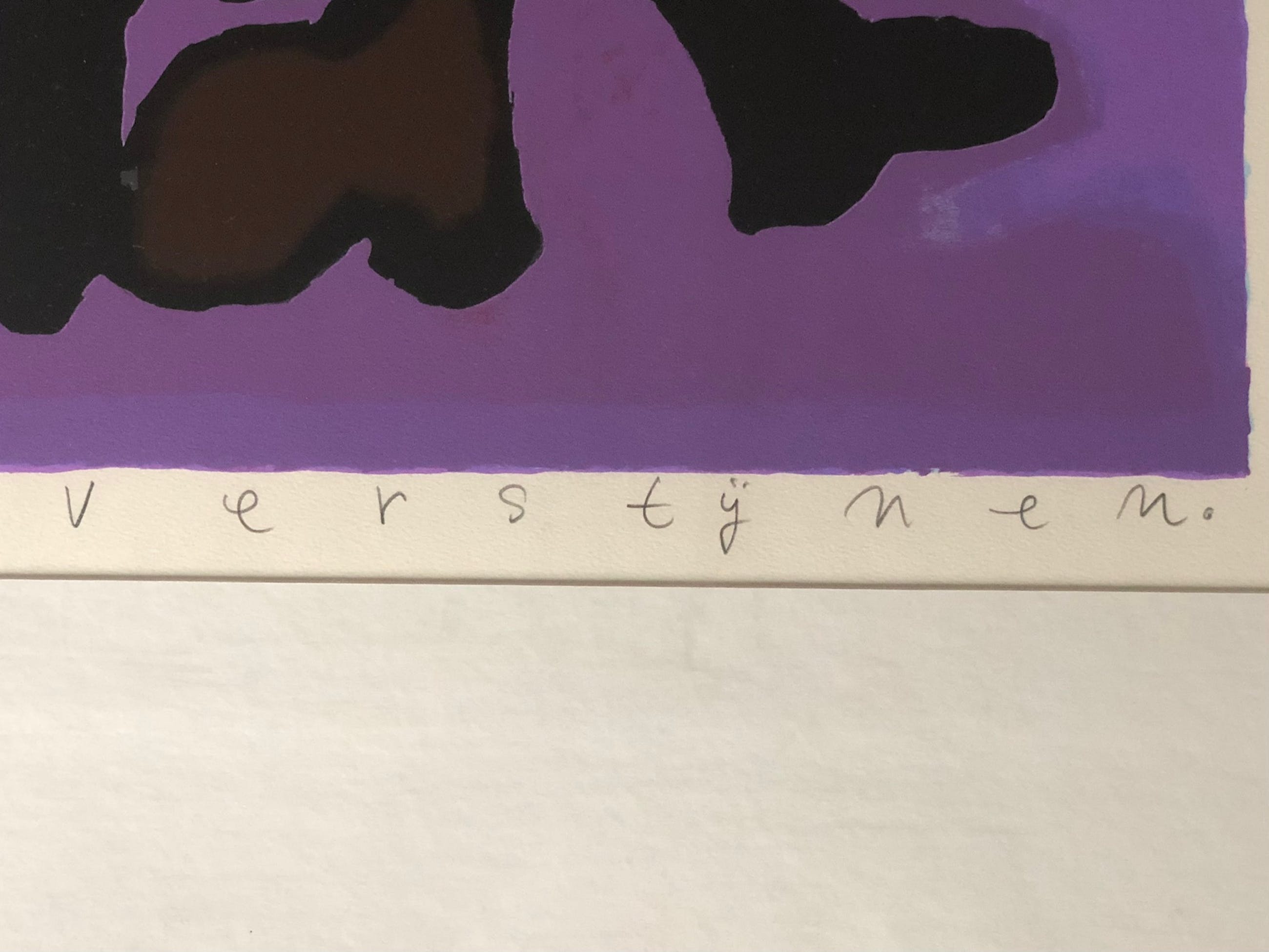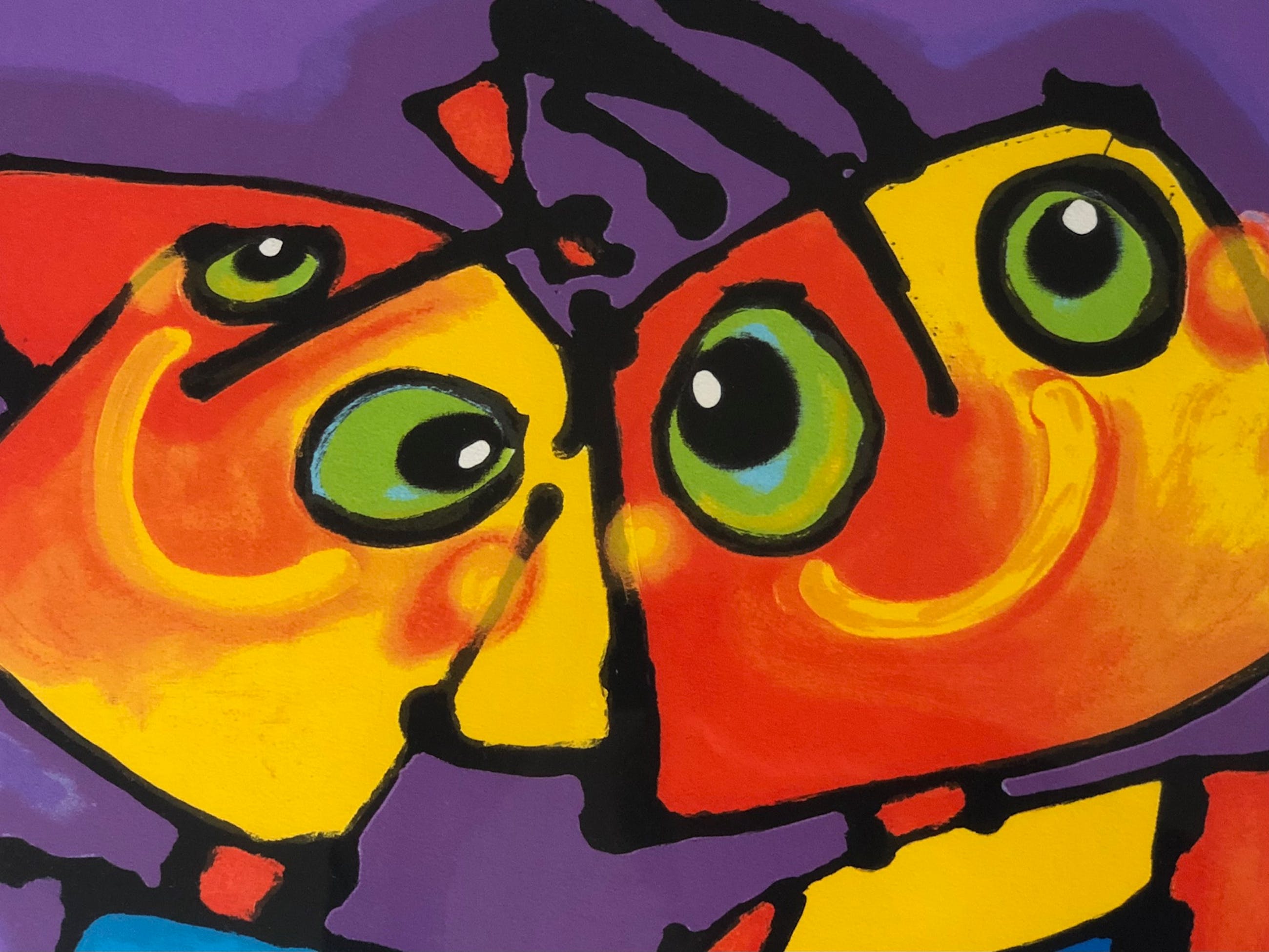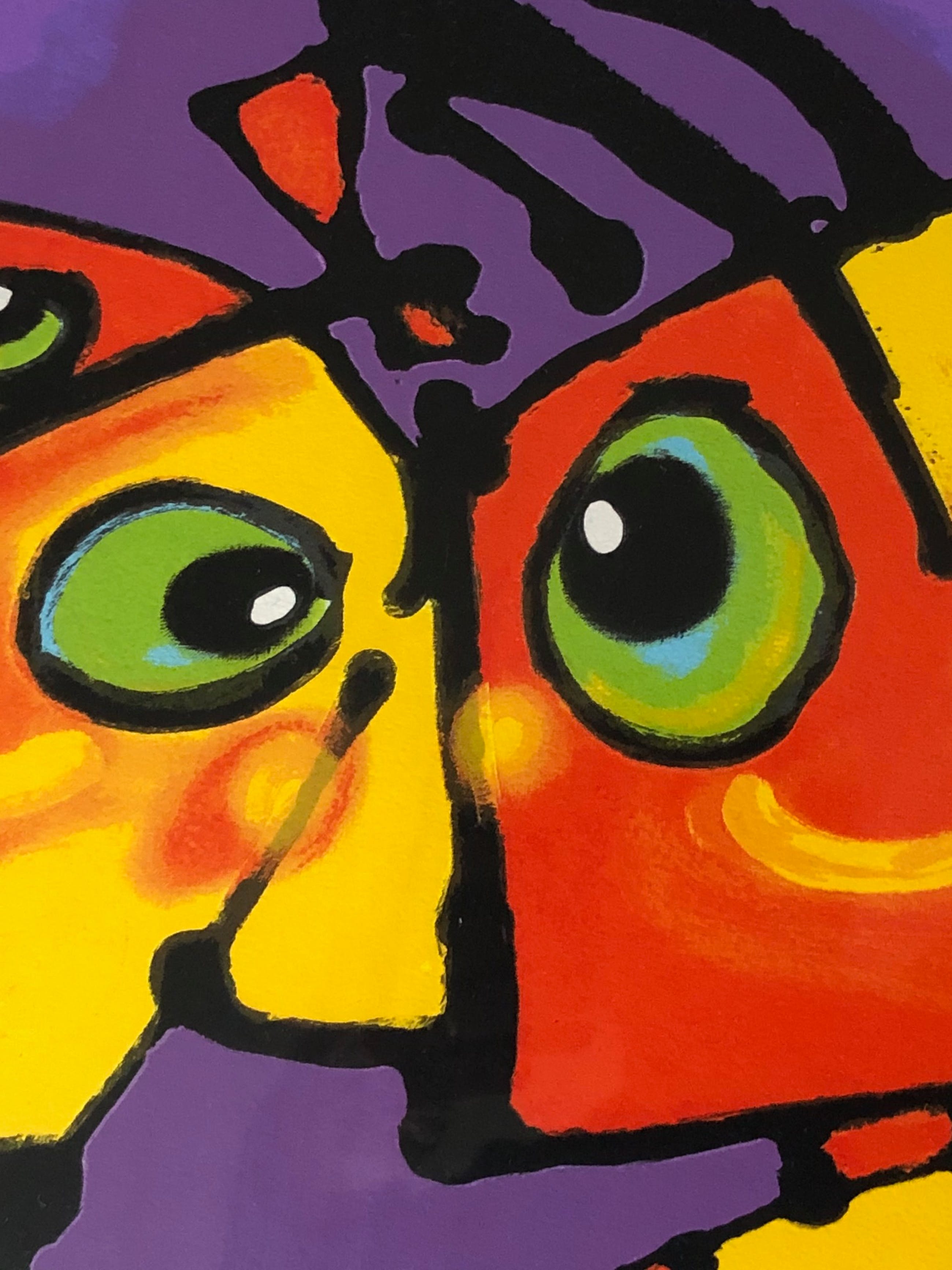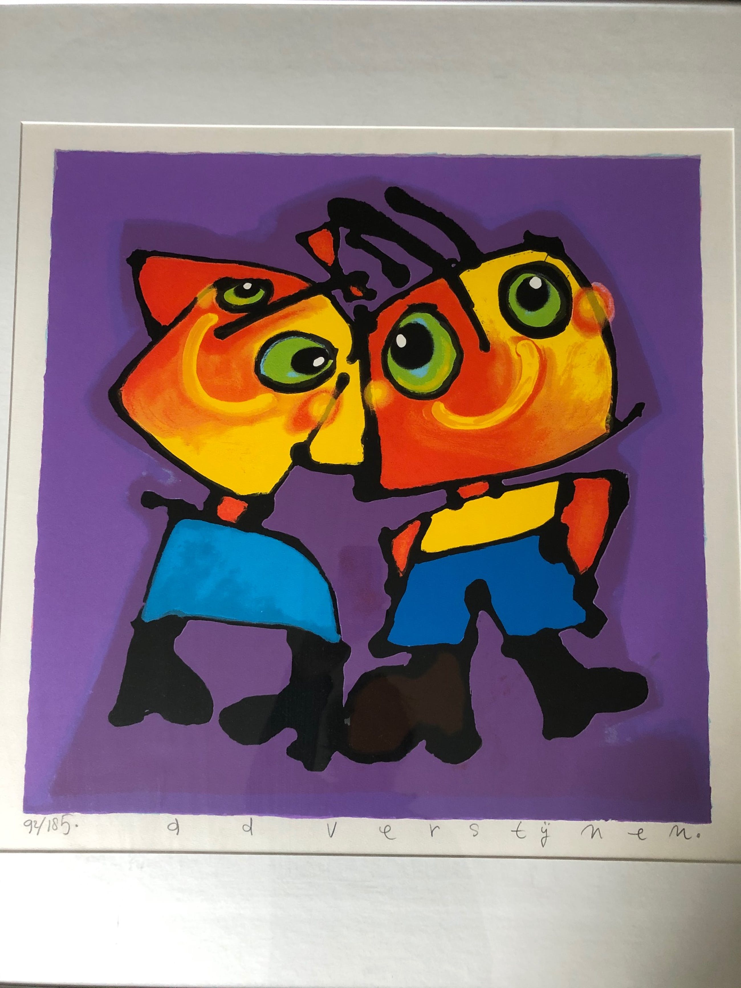 Zeefdruk Broer en zus. 60x60cm beeldformaat / 75x75cm papierformaat. Het werk komt uit een bedrijfscollectie en is sinds de aankoop ingelijst geweest.
