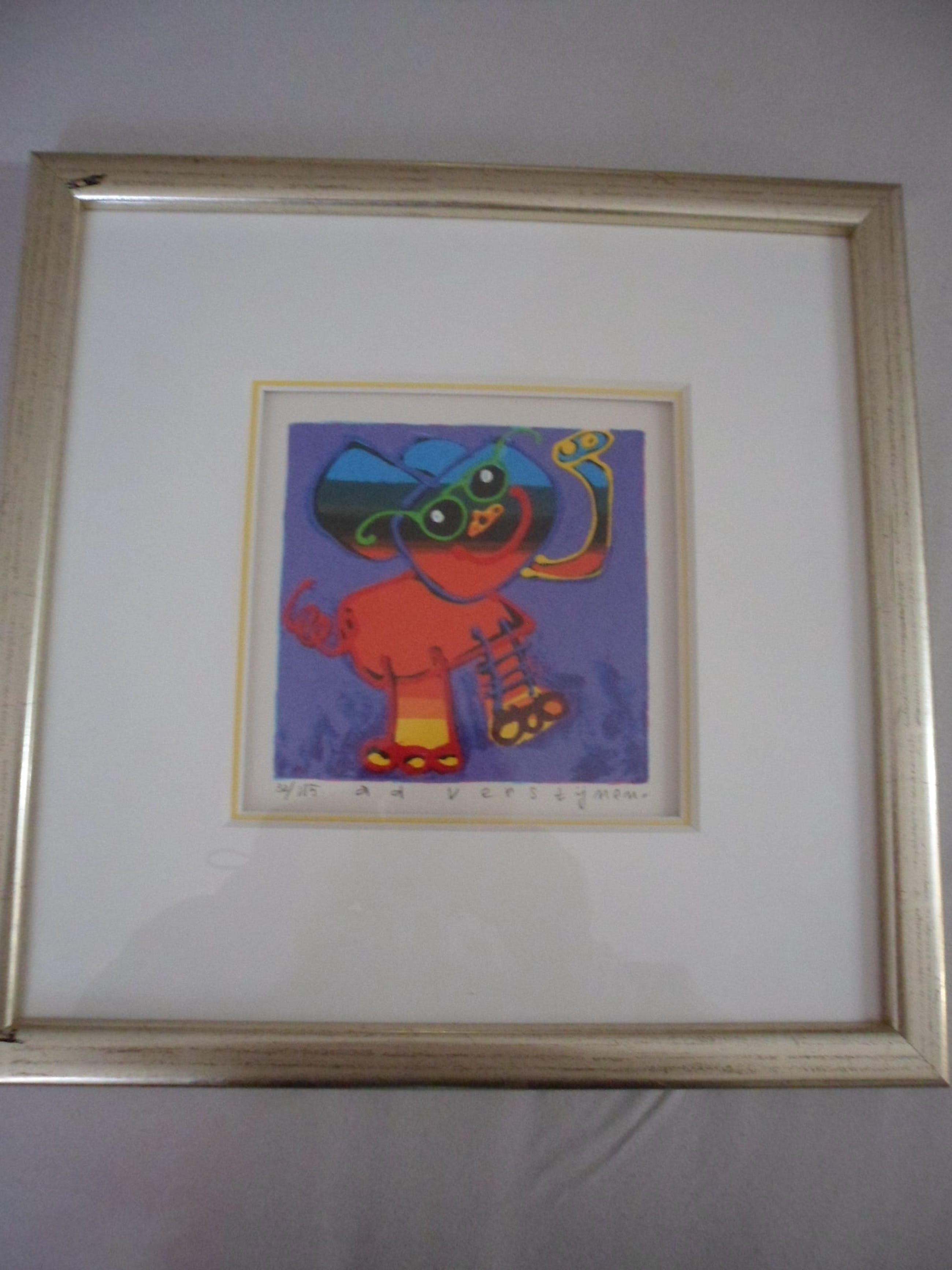 Een donkere zeefdruk, maar toch spatten de kleuren er van af! In deze kleine zeefdruk staat de olifant Olli afgebeeld. De olifant, voornamelijk bestaande uit de kleuren rood, zwart en blauw is afgebeeld op een paars blauwe achtergrond. Opvallend aan de zeefdruk is dat de olifant een zonnebril op heeft.
