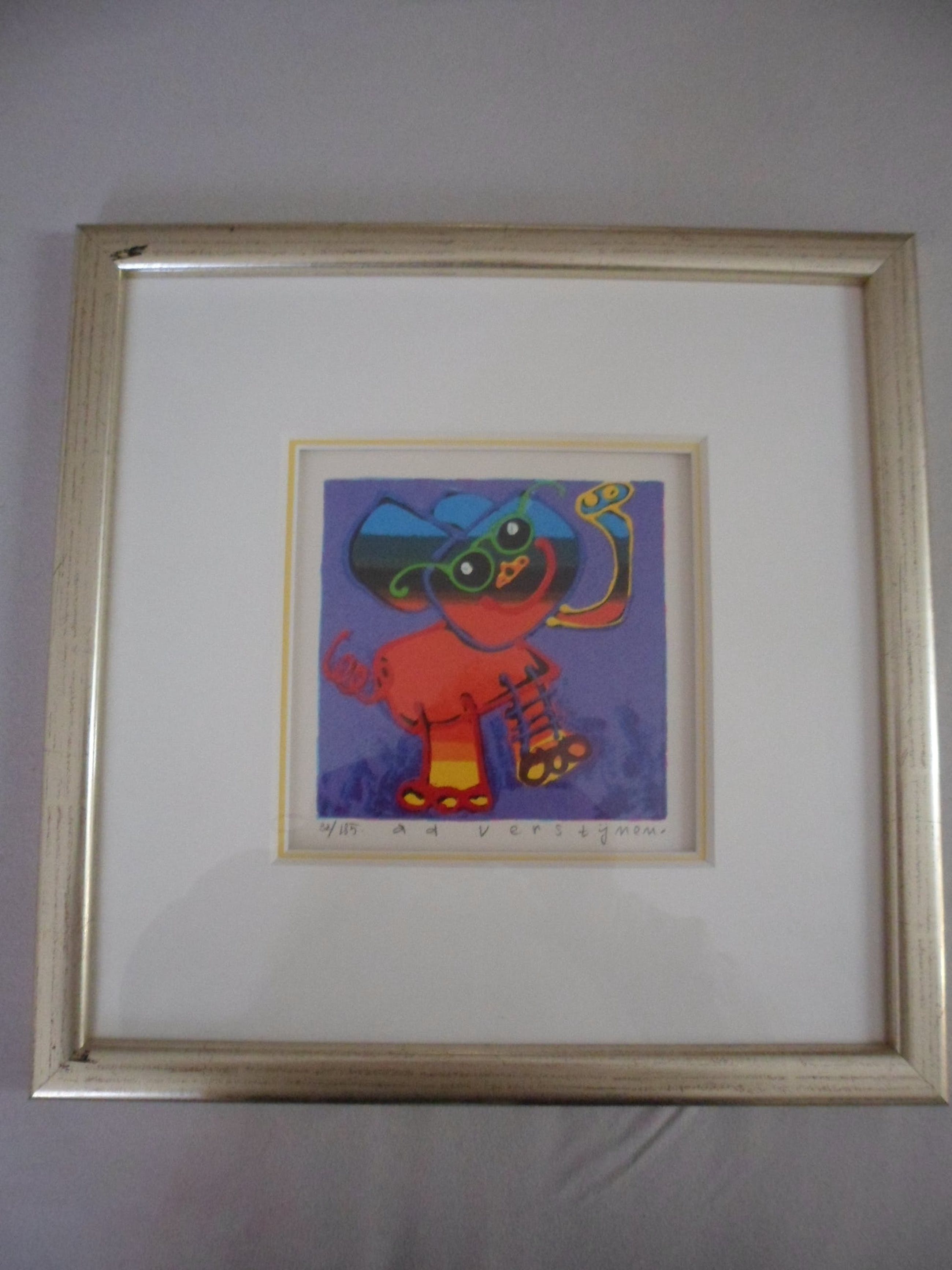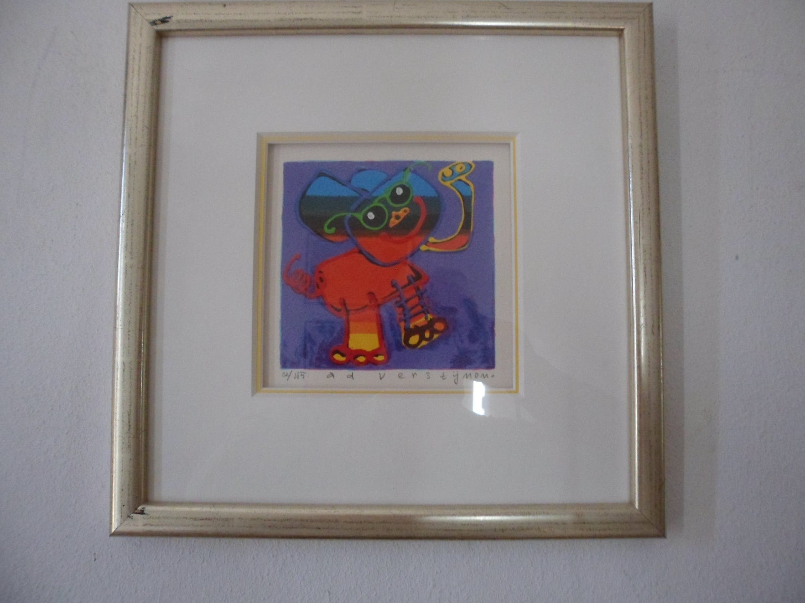 De werken van Ad Verstijnen kenmerken zich door de vele kleuren en kunnen elk huis en elke kamer opvrolijken. Zelfs deze zeefdruk, die wat donkerder van kleur is dan de meeste andere zeefdrukken, is een kleursensatie. Door de maat van de zeefdruk past hij overal in huis. Voor deze zeefdruk geld dan ook: Klein van stuk, maar een kleurexplosie!