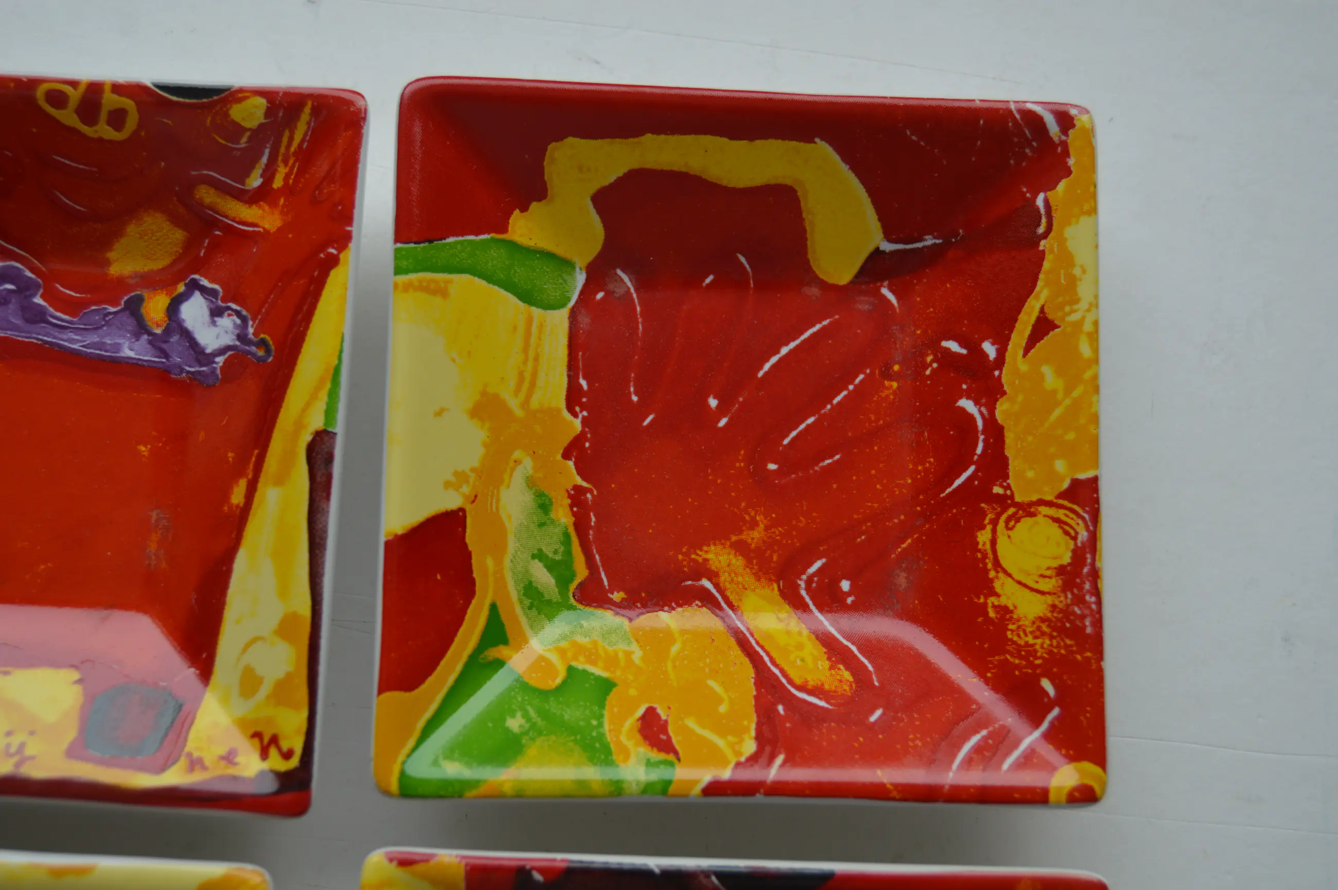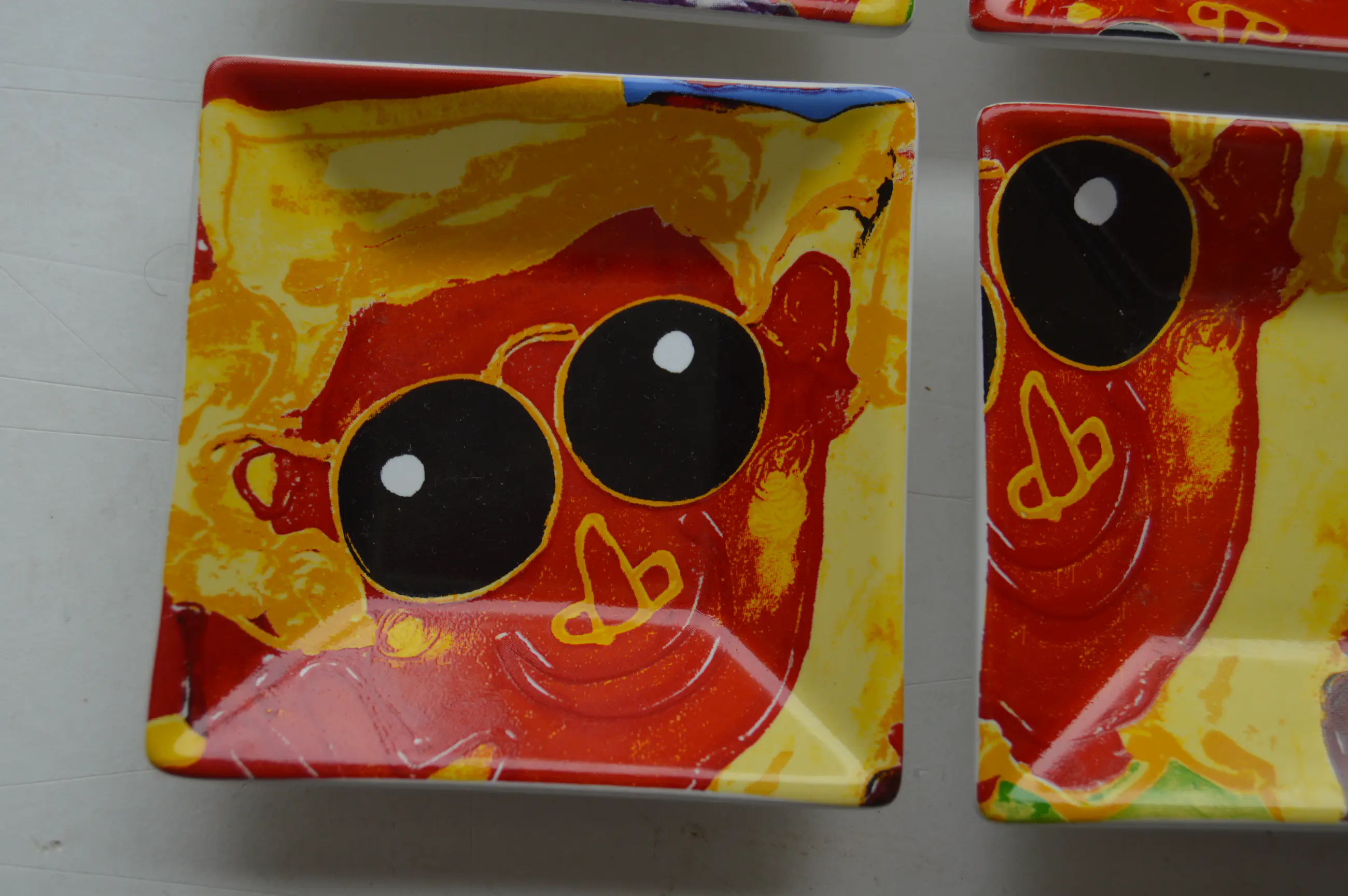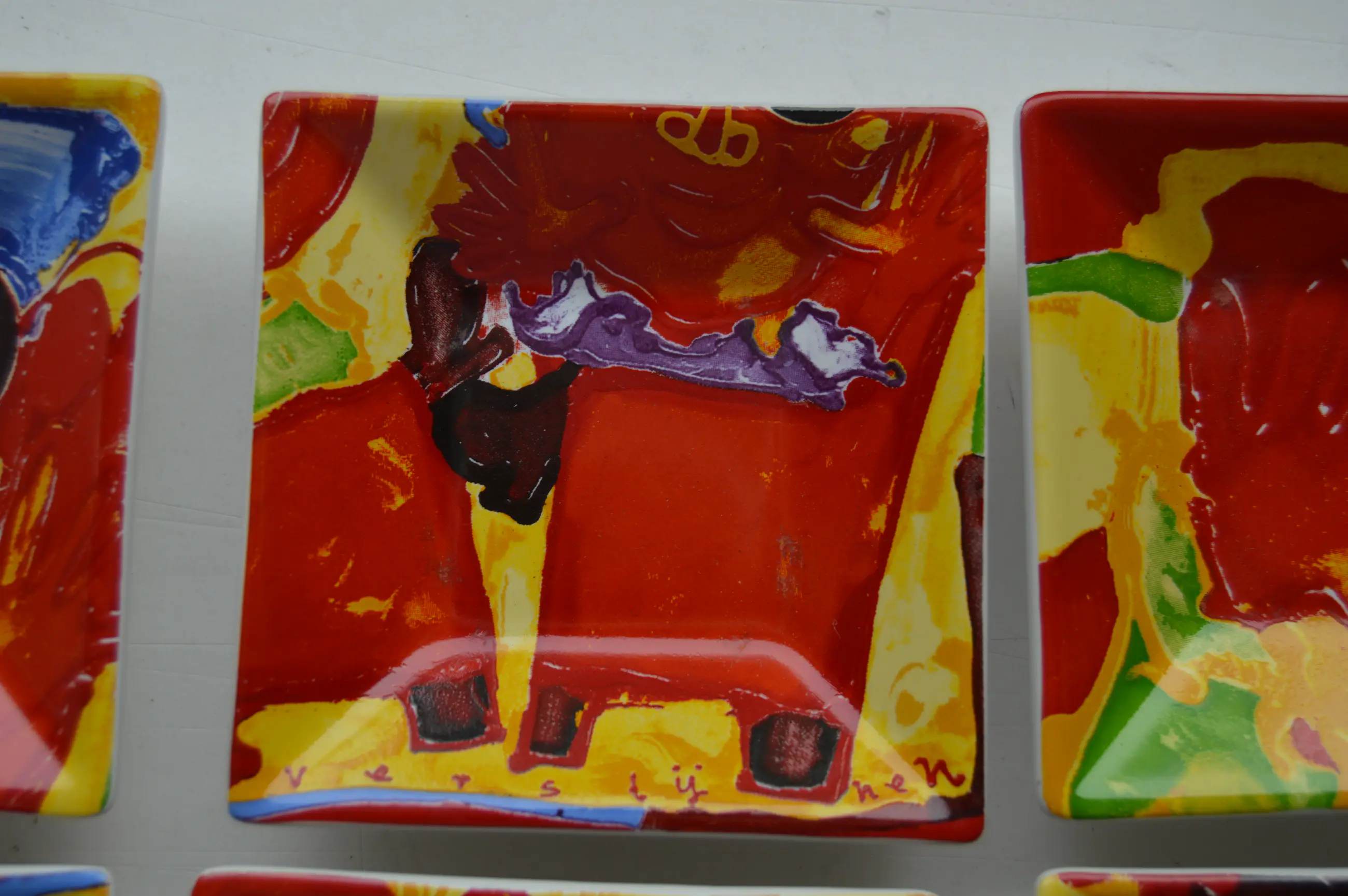 6 prachtige vierkante schaaltjes met kleurrijke afbeeldingen van diverse figuren. Speciaal ontworpen voor het Slingeland ziekenhuis . Alle 6 in onberispelijke staat. Verzending aangetekend