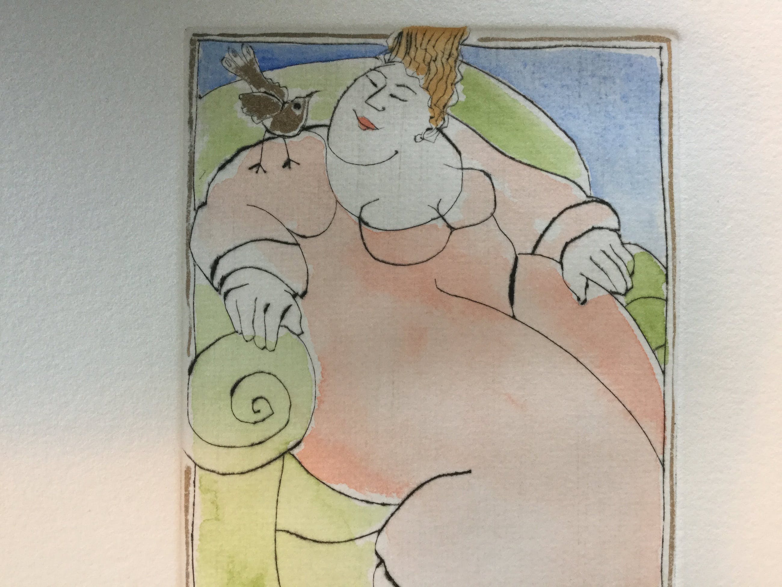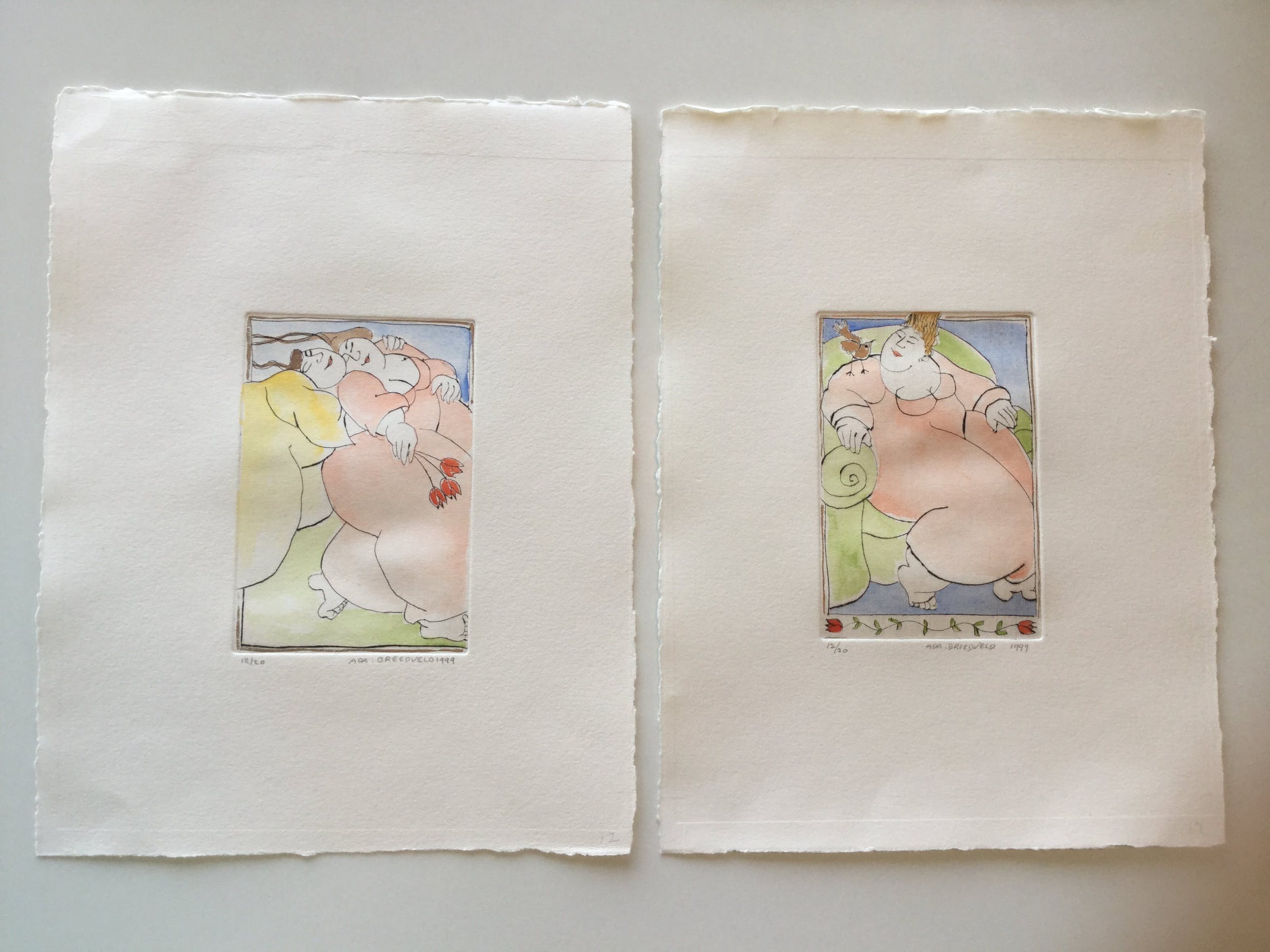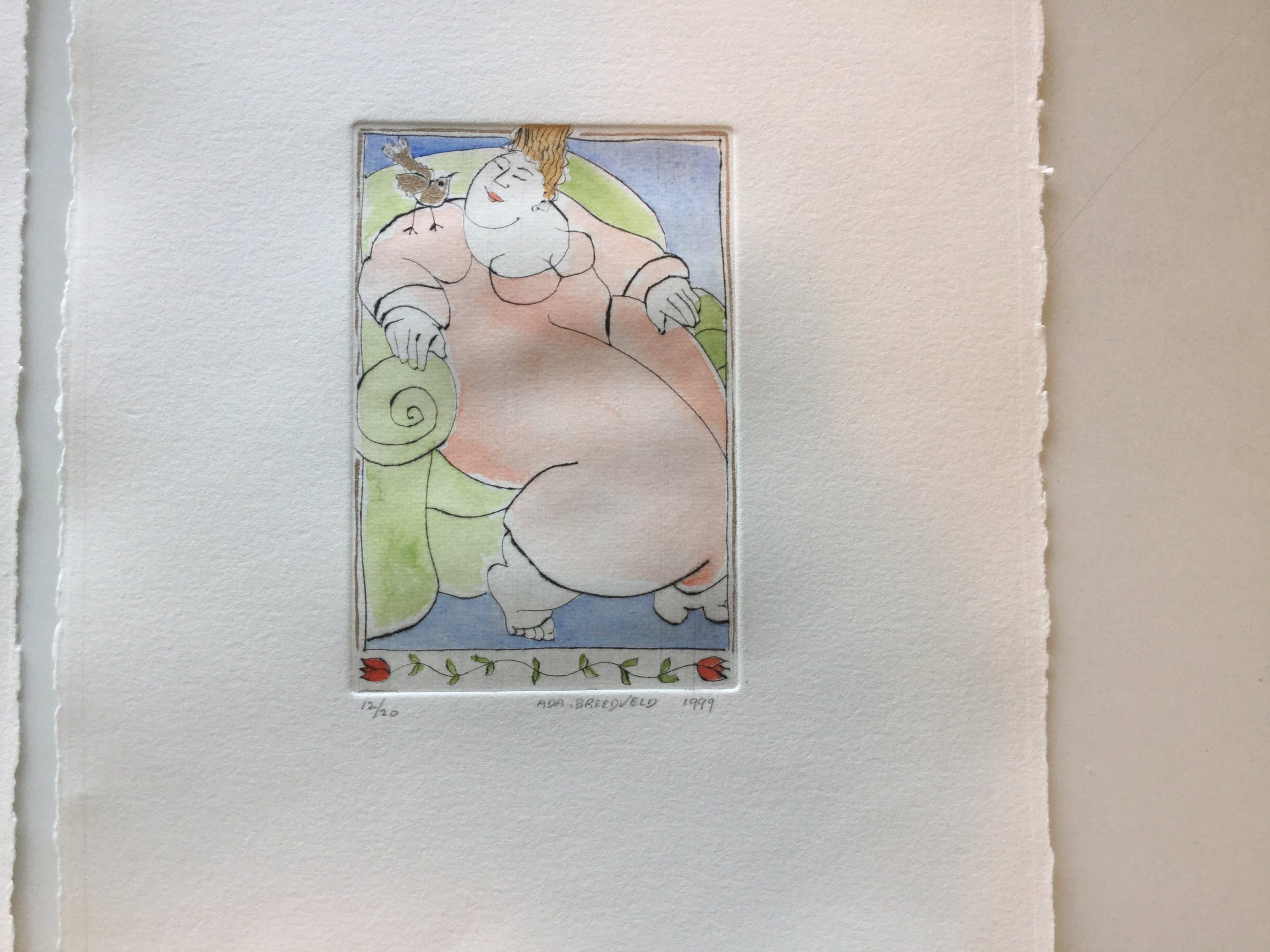 DE LAATSTE TWEE! ANDERE ETSEN SUCCESVOL VERKOCHT. Ik kan u een serie droge naald etsen aanbieden. Met de hand ingekleurd. Zeer kleine oplage. In het oeuvre van Ada Breedveld komen etsen minder vaak voor. De kans is dus zeer klein dat er ander werk op deze site aangeboden zal worden