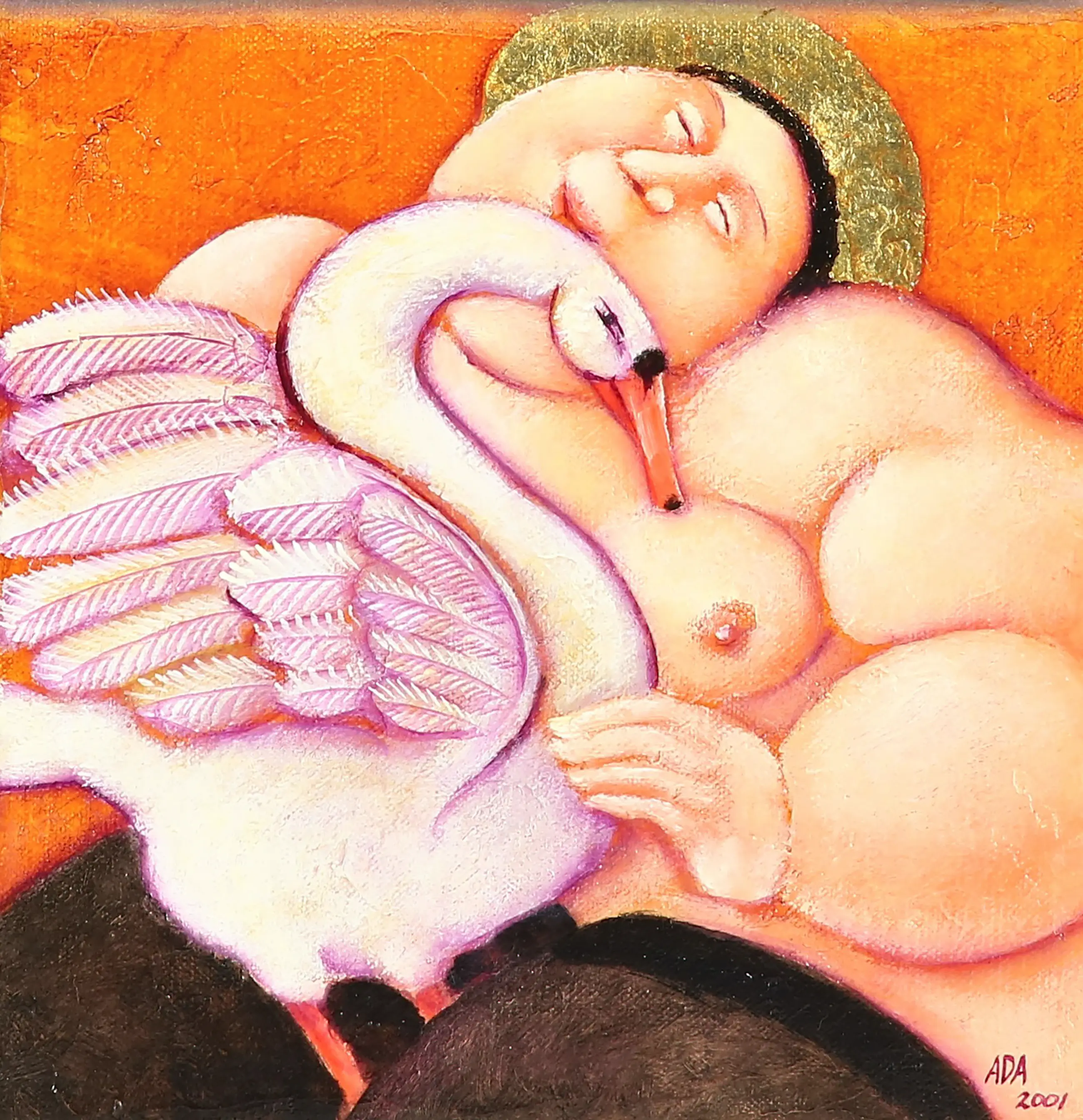 Acryl op doek van Ada Breedveld. Titel: Leda en de zwaan. Jaar: 2001. Afmetingen incl lijst: H34 x b34cm. Afmetingen doek: H20 x b20cm. Het werk is rechts onder gesigneerd door de kunstenares. De authenticiteit van het aangeboden werk wordt volledig gegarandeerd. Een certificaat van echtheid kan, op aanvraag, worden gemaild.