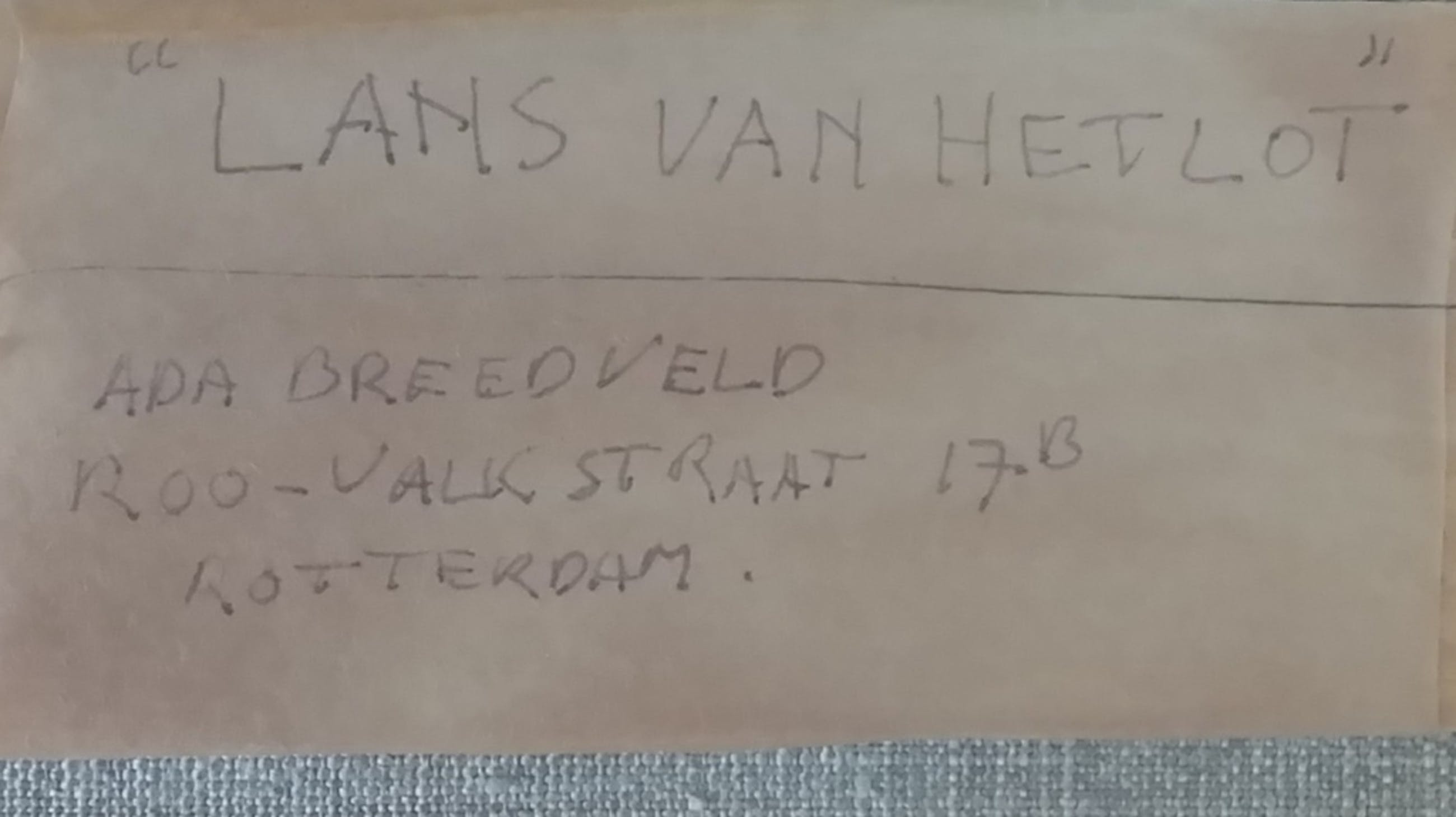 Achterkant etiket met notitie en atelier adres van Ada Breedveld