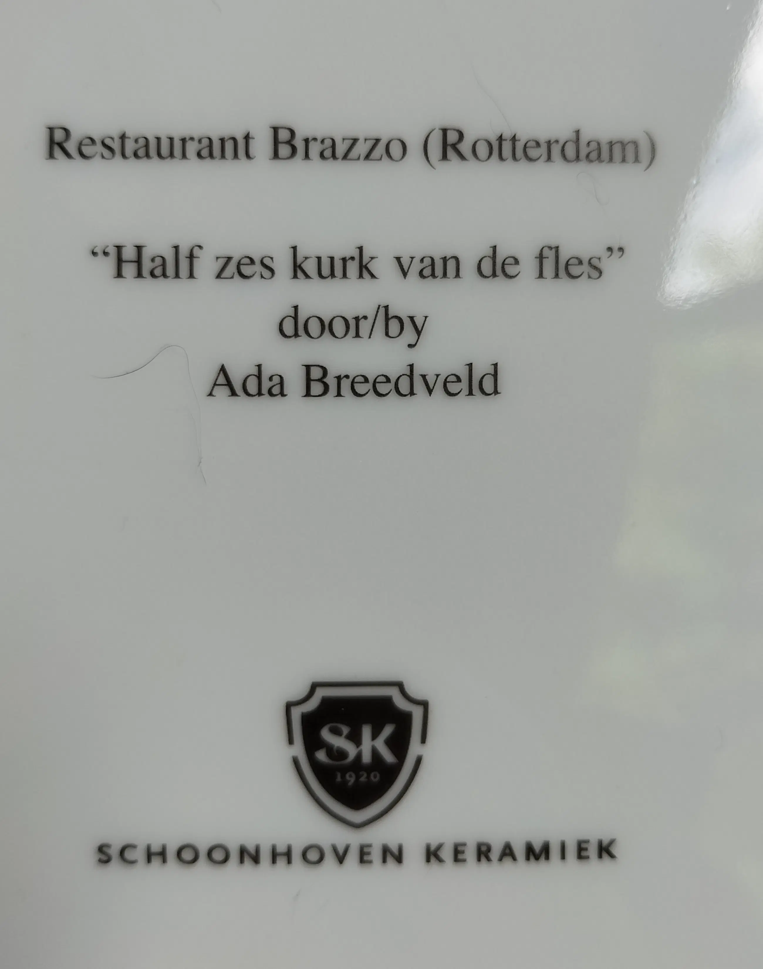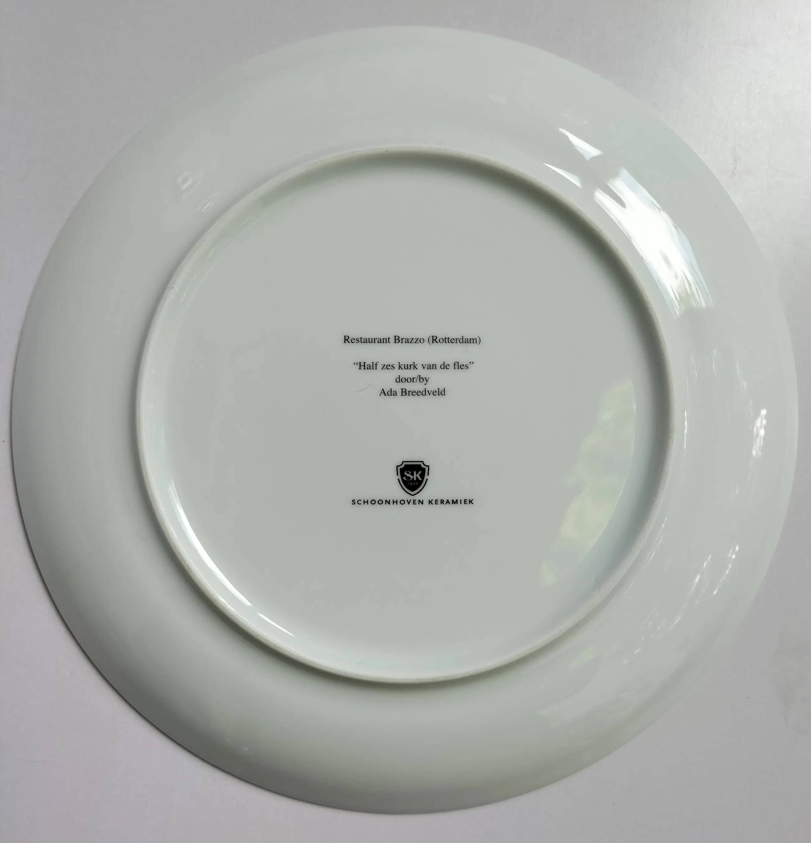 Zeer leuk en mooi bord van Ada Breedveld, geproduceerd bij Schoonhoven Keramiek en gebruikt als onderbord/geëxposeerd in restaurant Brazzo, Rotterdam, in het kader van de combi "Kunst en Culinair". Helaas moest Brazzo in 2020 de deuren sluiten, de aanwezige kunst werd toen geveild.