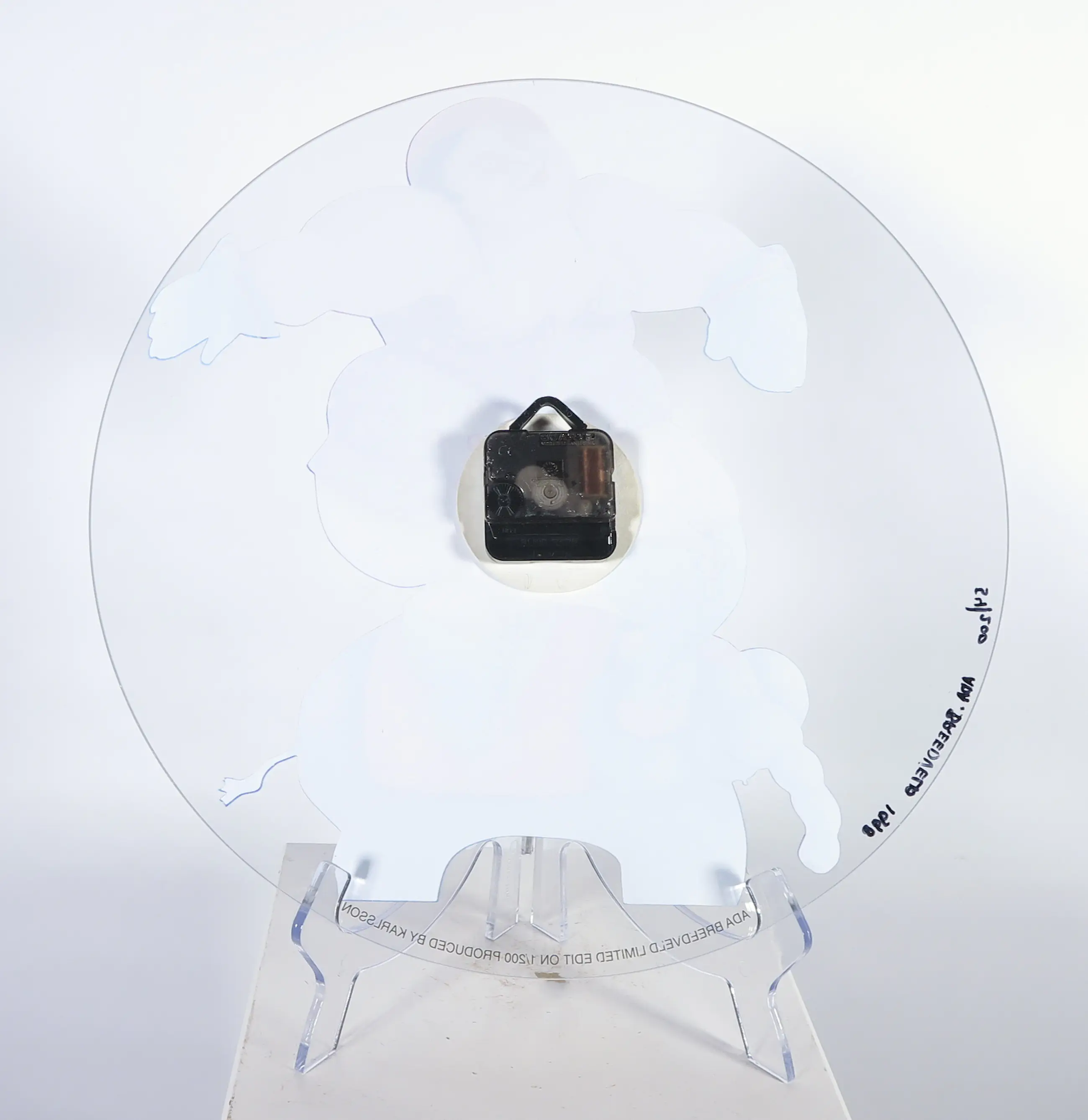 Wandklok van glas, gesigneerd, gedateerd en genummerd. Betreft een uitgave van Karlsson in een totale oplage van 200.