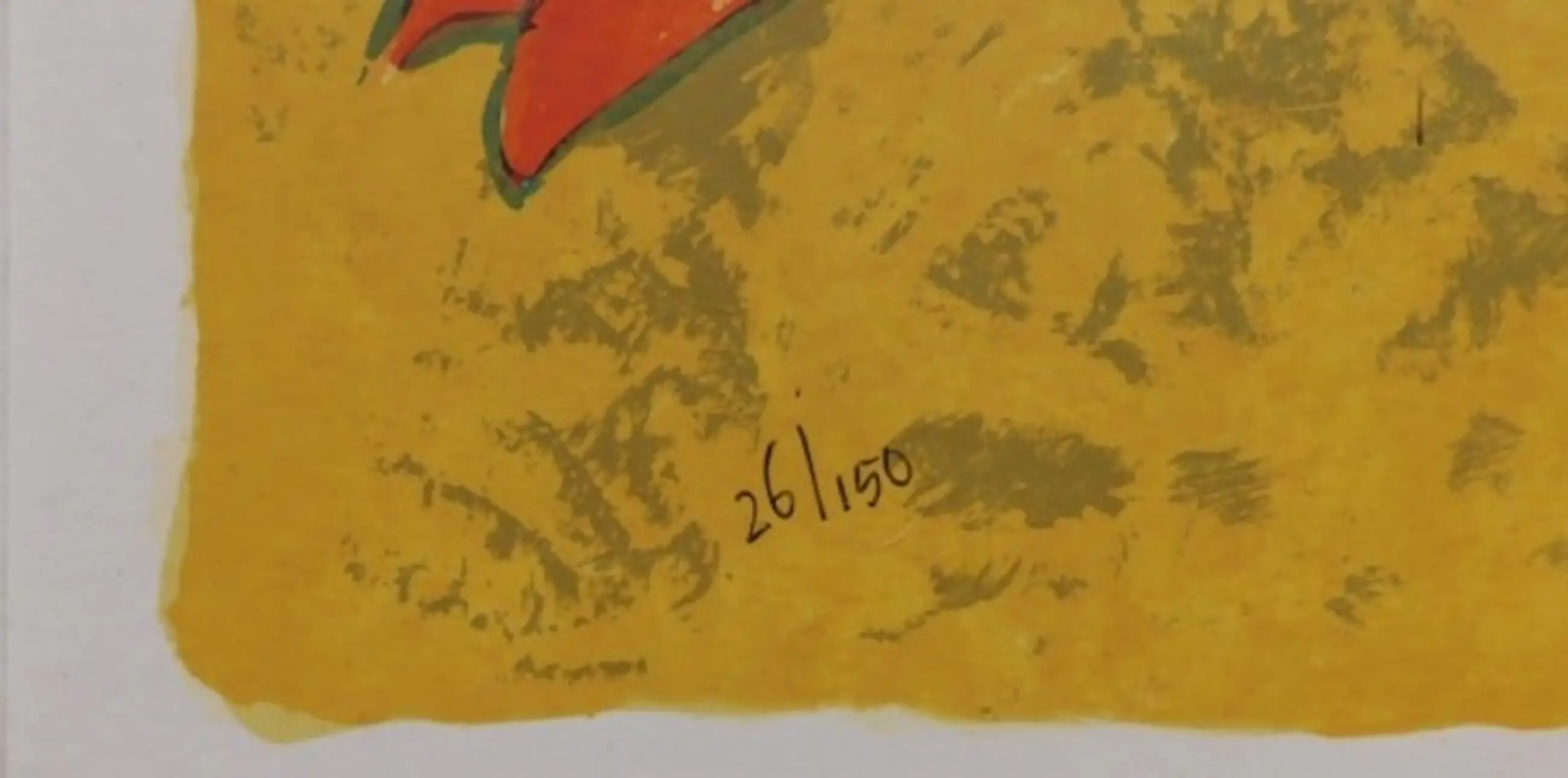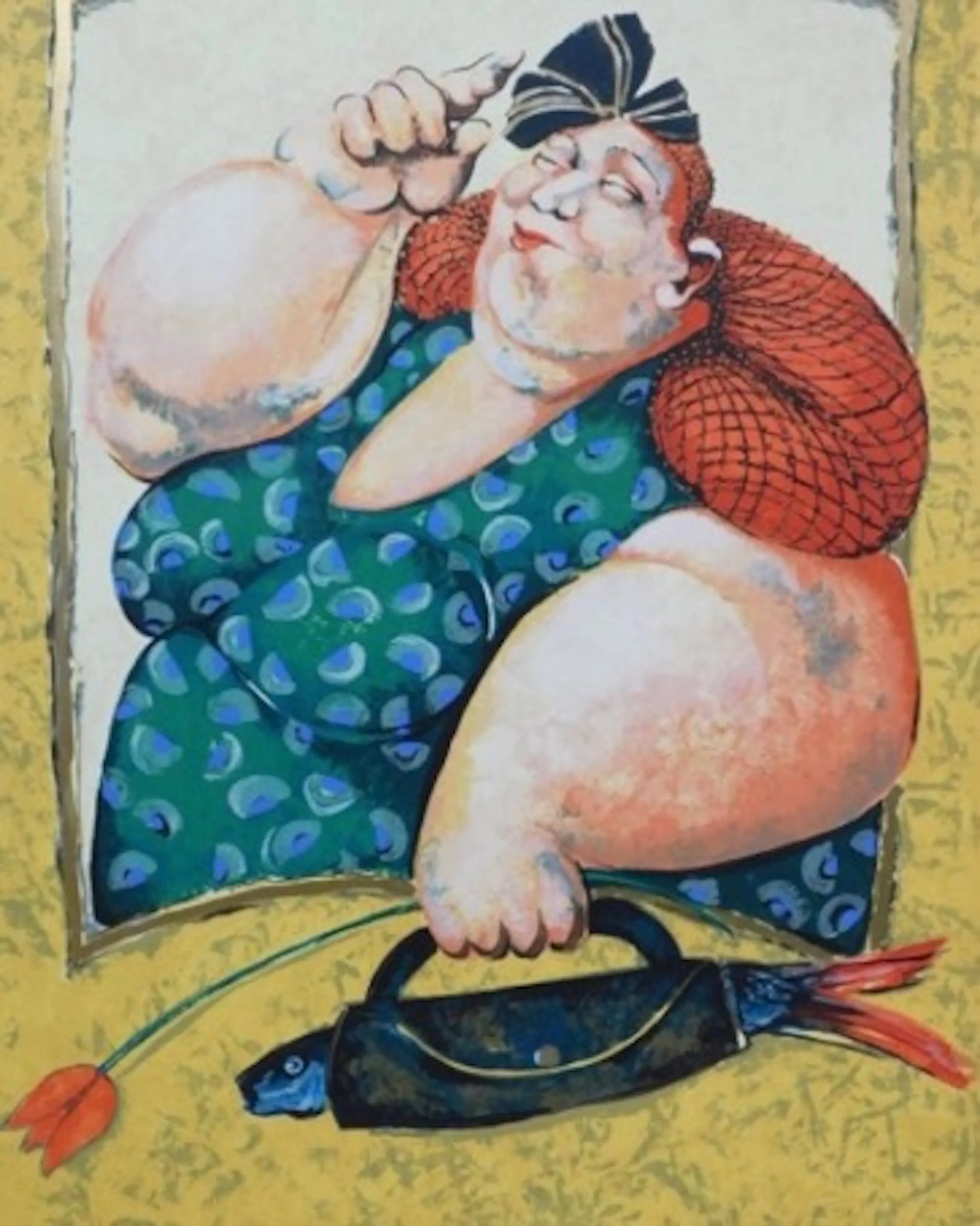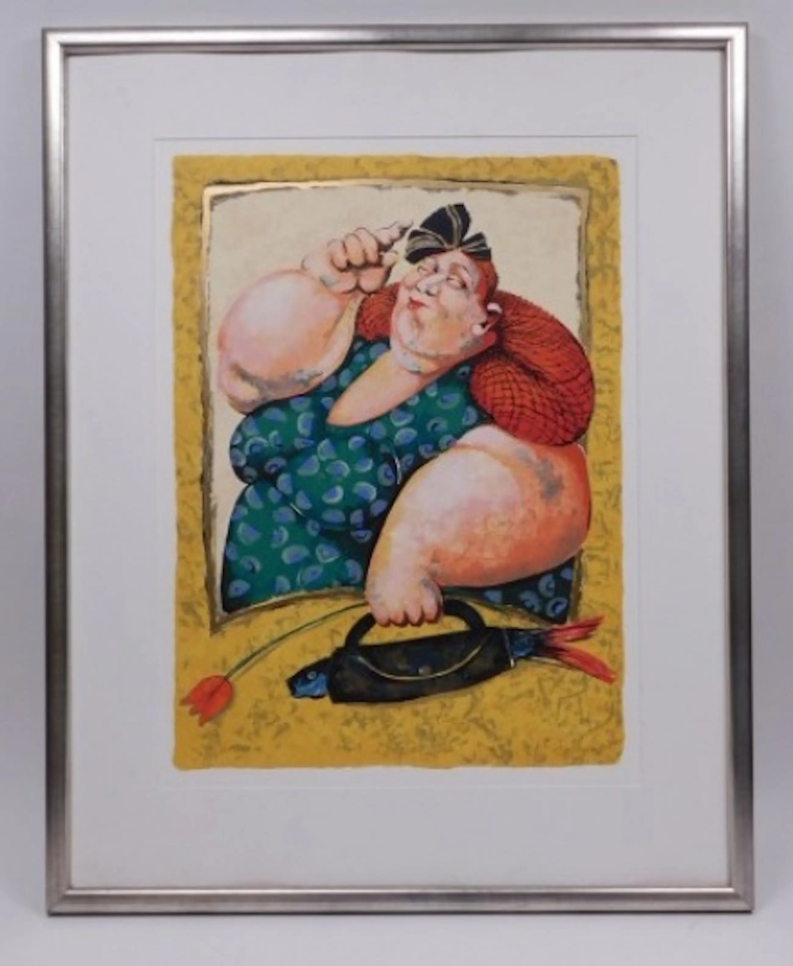 Deze vrolijke Litho van Ada Breedveld vrouw met vis In de meeste schilderijen van Ada Breedveld geboren op 1944 komt een vrouw voor. Een volumineuze, immer tevreden glimlachende vrouw, omgeven door een steeds wisselend decor van decoratieve patronen. De mysterieuze, in zichzelf gekeerde glimlach is het resultaat van zelfcontemplatie en beschouwing van de essentie van het vrouw zijn in al haar facetten. Deze wordt vervolgens snel gerelativeerd door de aanwezige humor.
