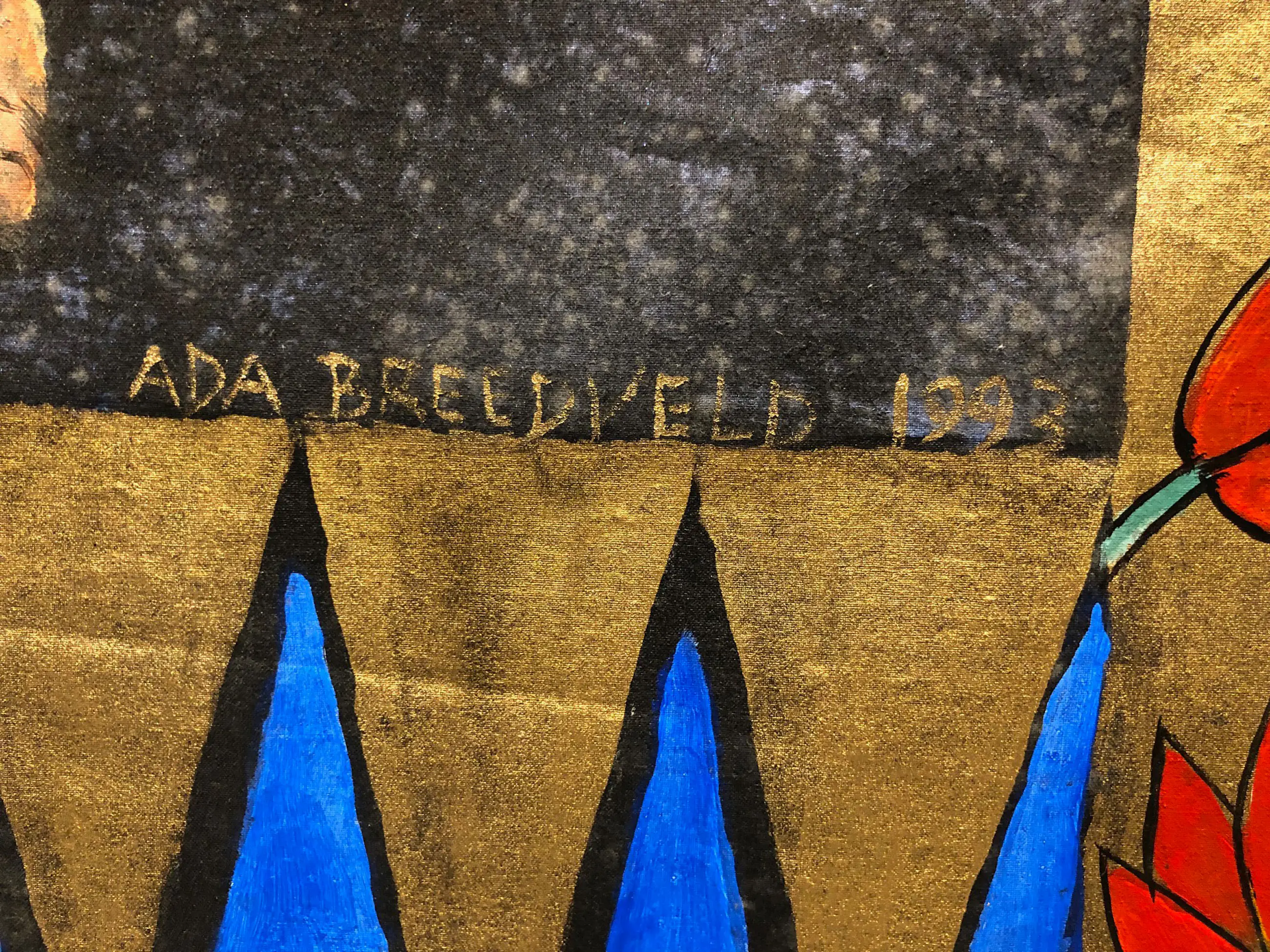 Een motief geschilderd door Ada Breedvelt in 1993 op zwarte katoenen stof. Handgesigneerd