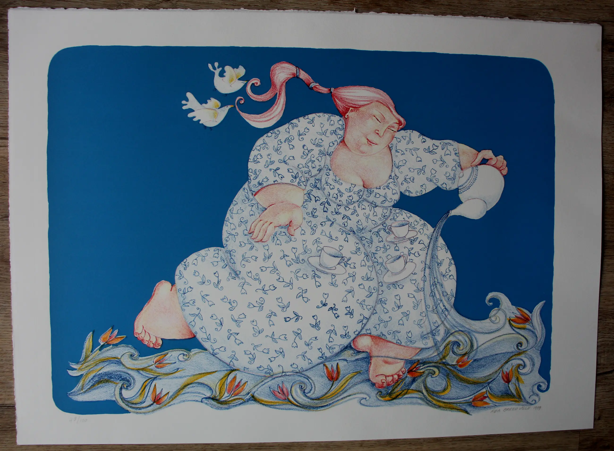Zeefdruk van Ada Breedveld. Jaar: 1999. Titel: De nachtbruid. Oplage: 47/100(nr kan afwijken ivm meerdere in bezit). Afmetingen blad: H54 x b75cm. Afmetingen voorstelling: H46 x b63cm. Het werk is rechts onderaan, met potlood, gesigneerd door de kunstenares. De authenticiteit van het aangeboden werk wordt volledig gegarandeerd. Een certificaat van echtheid kan, op aanvraag, worden gemaild.