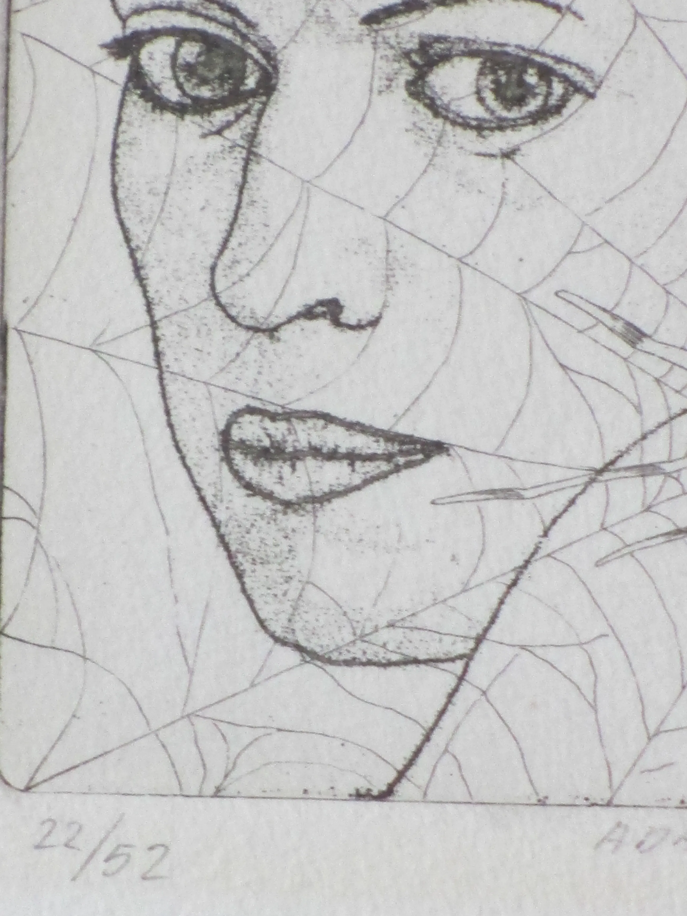 Zelfportret in ets door Ada Breedveld Losbladig, beeldmaat 12.5x10, bladmaat 32x25 Gesigneerd en gedateerd r.o.: 'Ada Breedveld 1977' Genummerd in potlood l.o.: '2/52' Titel 'Zelfportret' op eerder achterblad Authenticiteit volledig gegarandeerd