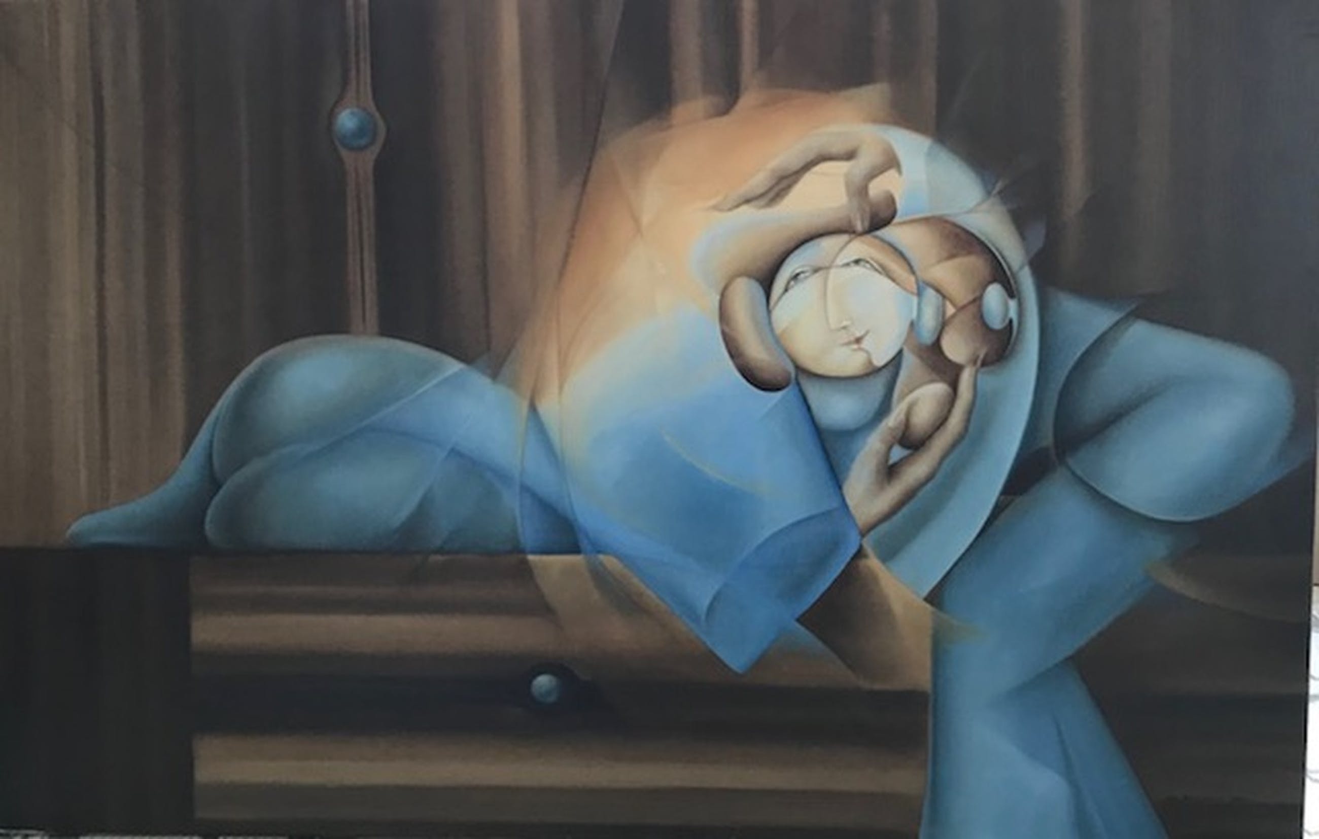 Prachtige kleuren blauw en bruin. Bijzondere betekenis titel "Conceptie"