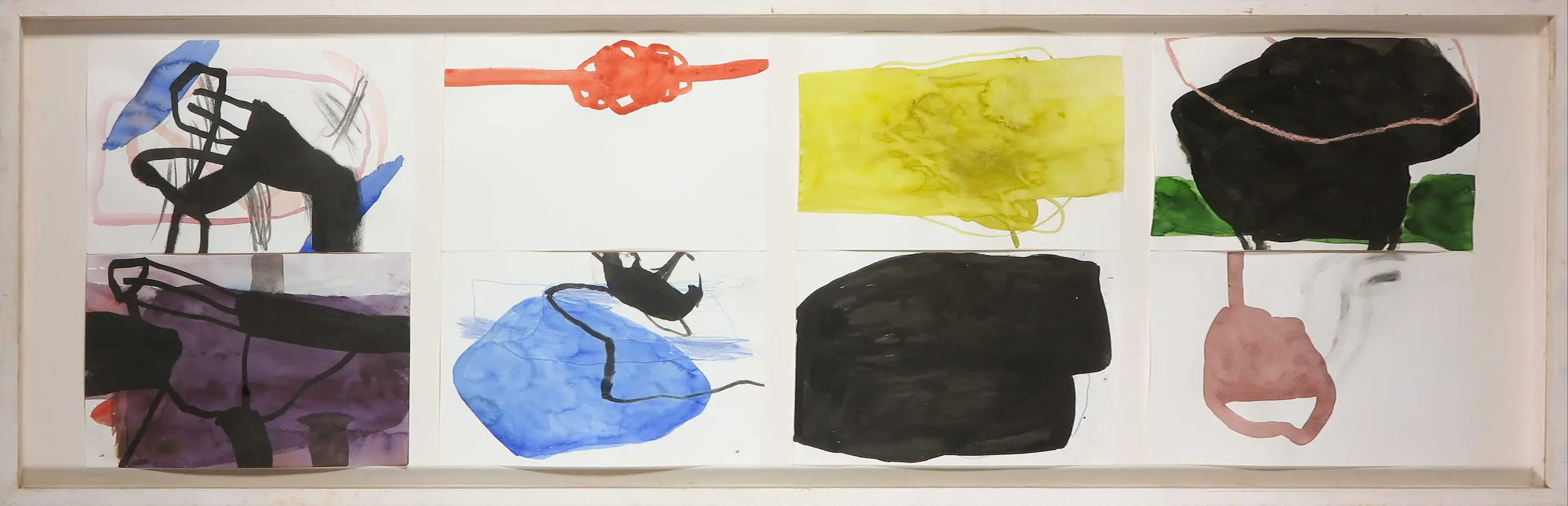 Acht kleine werkjes op papier samengevoegd in een lijst. Handgesigneerd door Fässler.