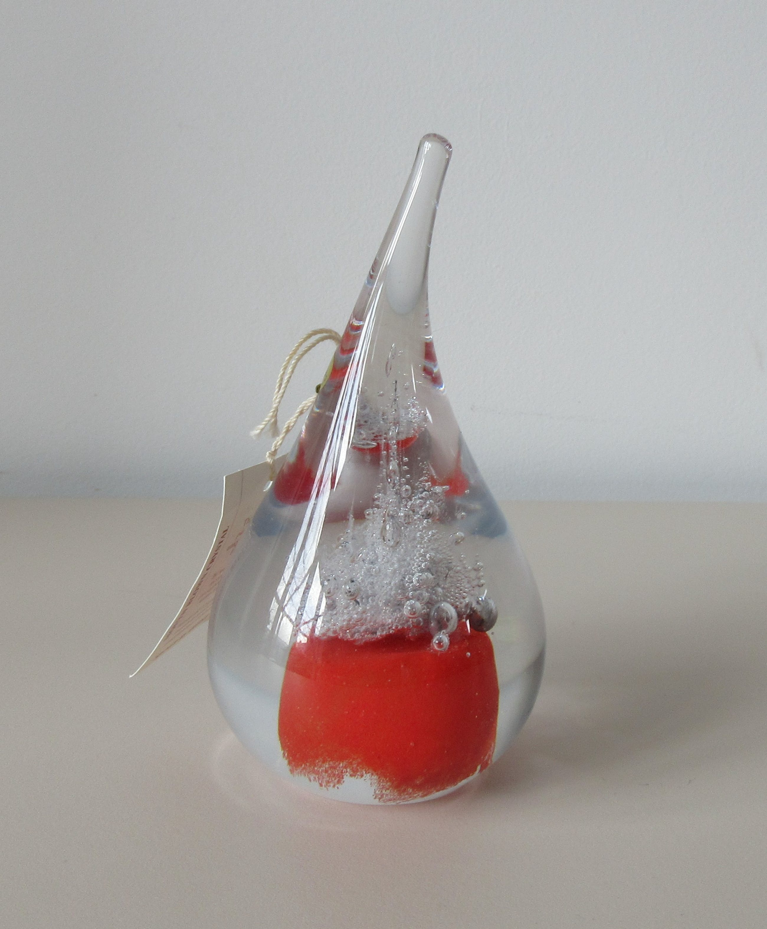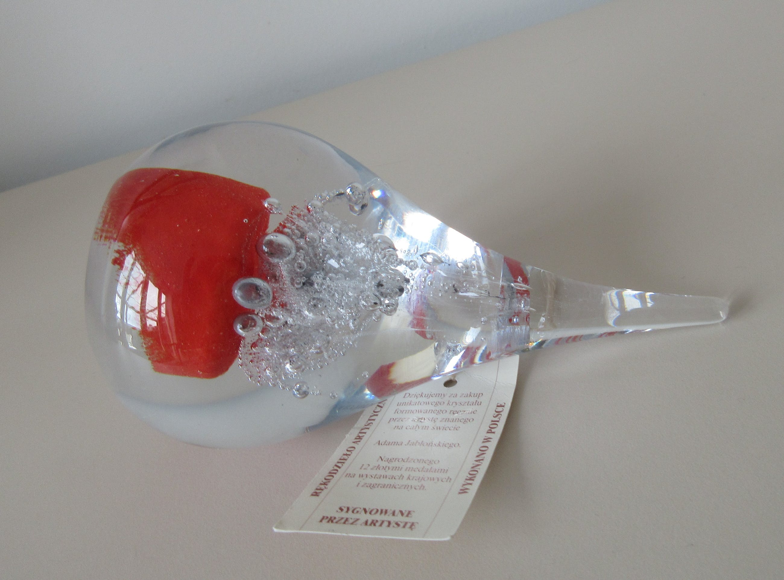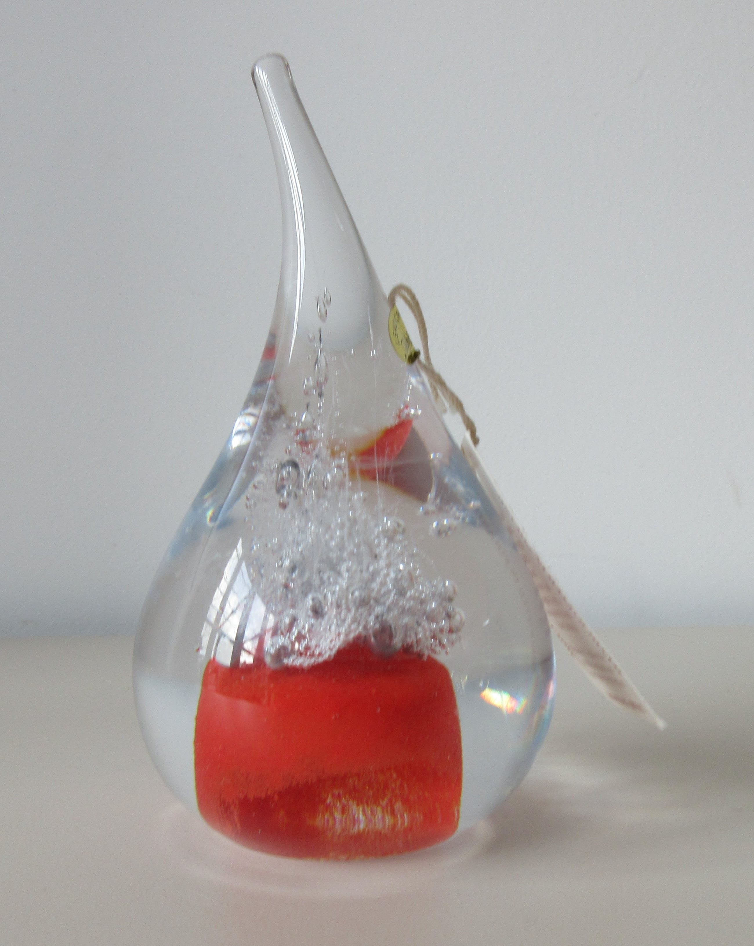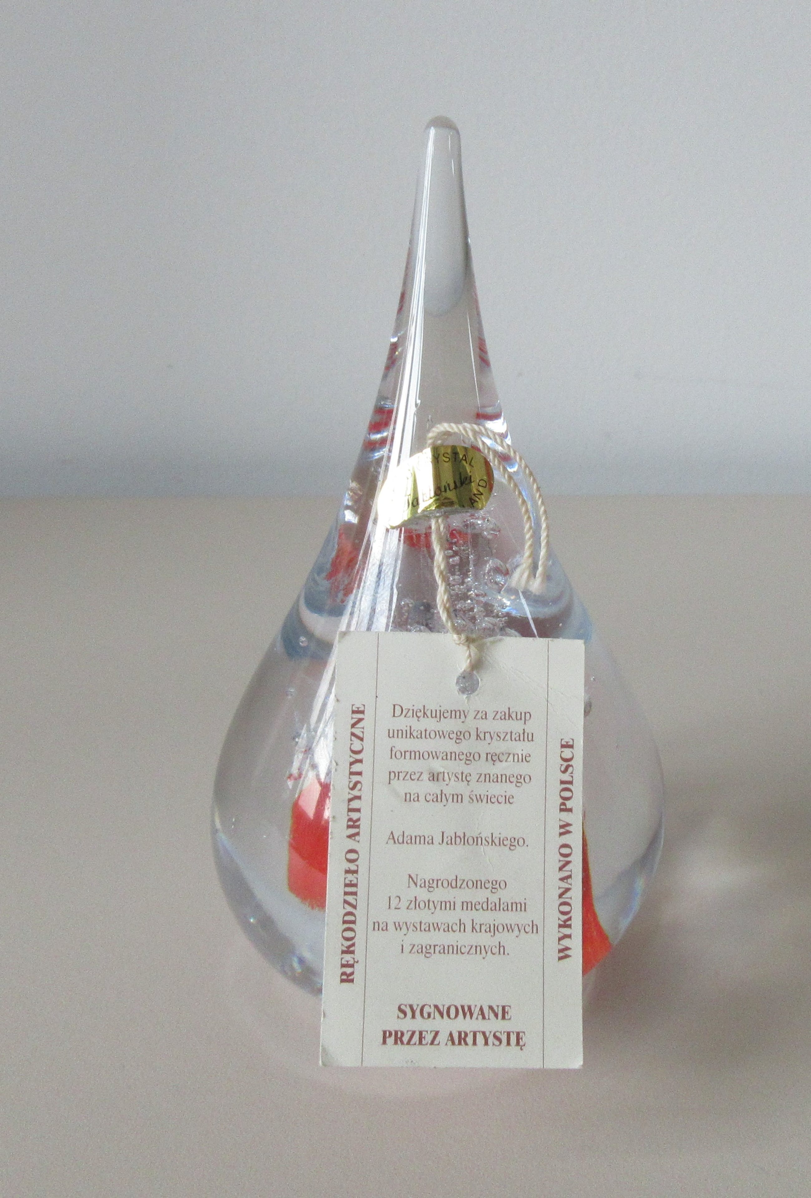 Massief glazen druppel met luchtbellen en rode glaspoeders van de bekende Poolse Glaskunstenaar Adam Jablonski. In zeer goede conditie, allen een paar krasjes op de onderzijde. Hand gesigneerd AJ op de onderzijde en voorzien van een merksticker + kartonnen kaartje.
