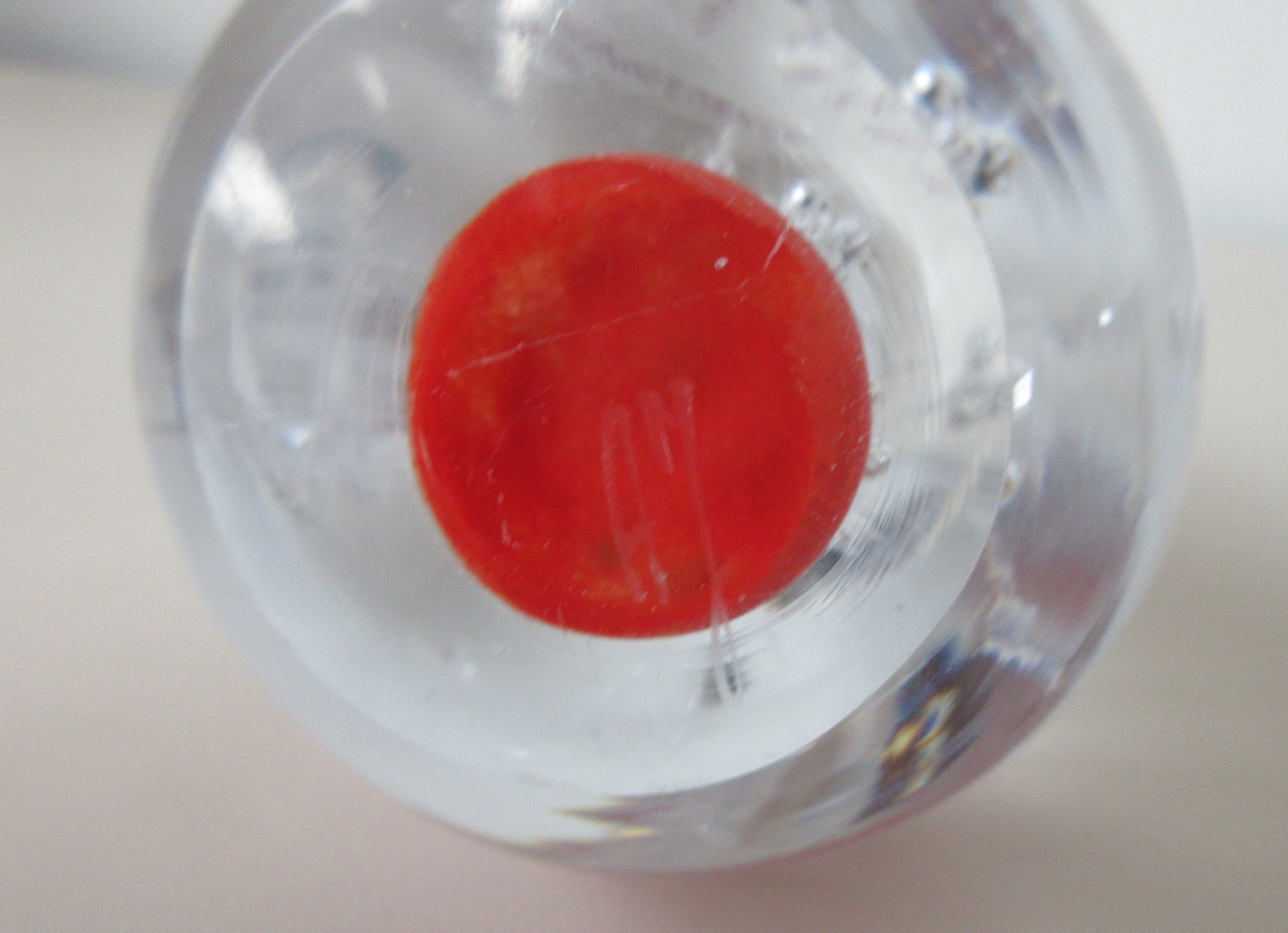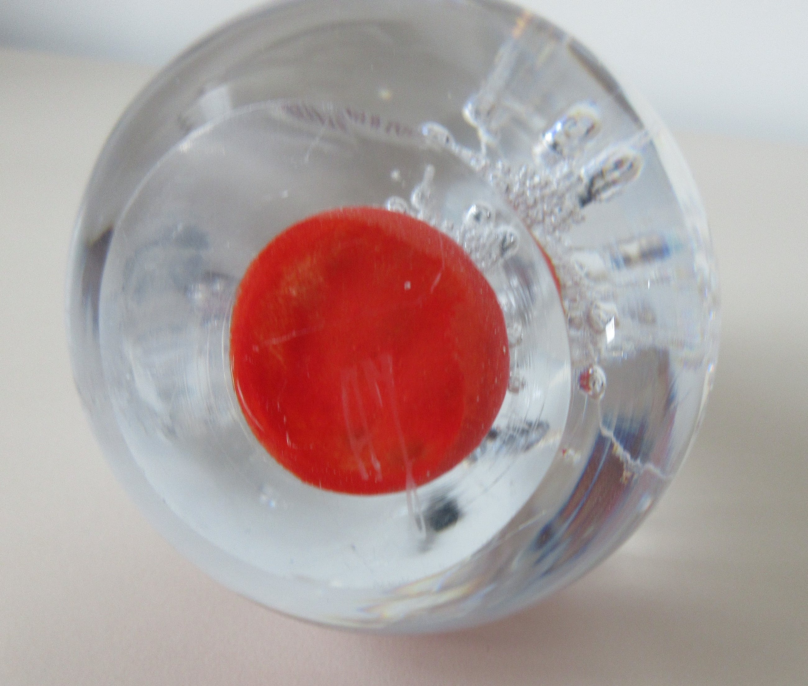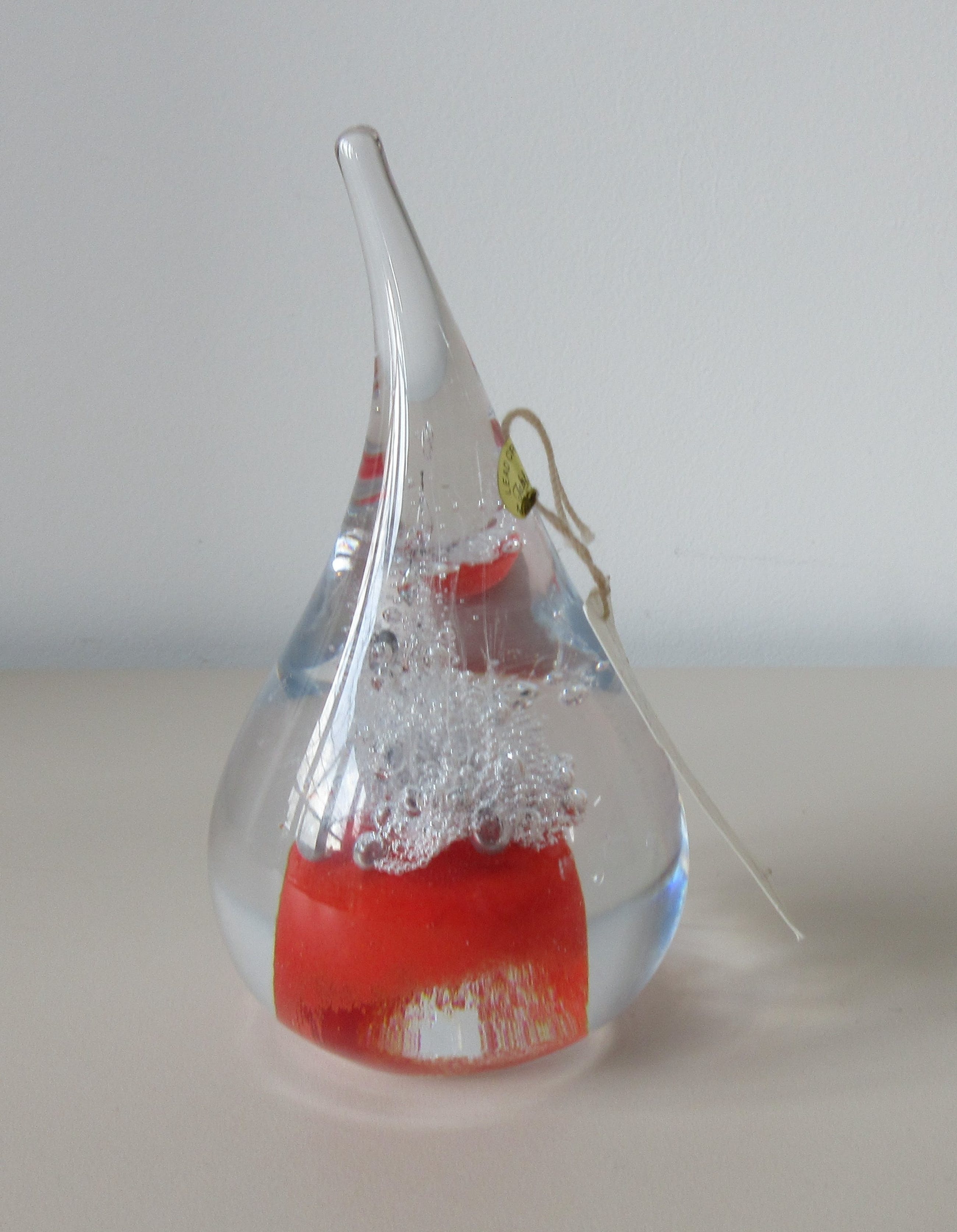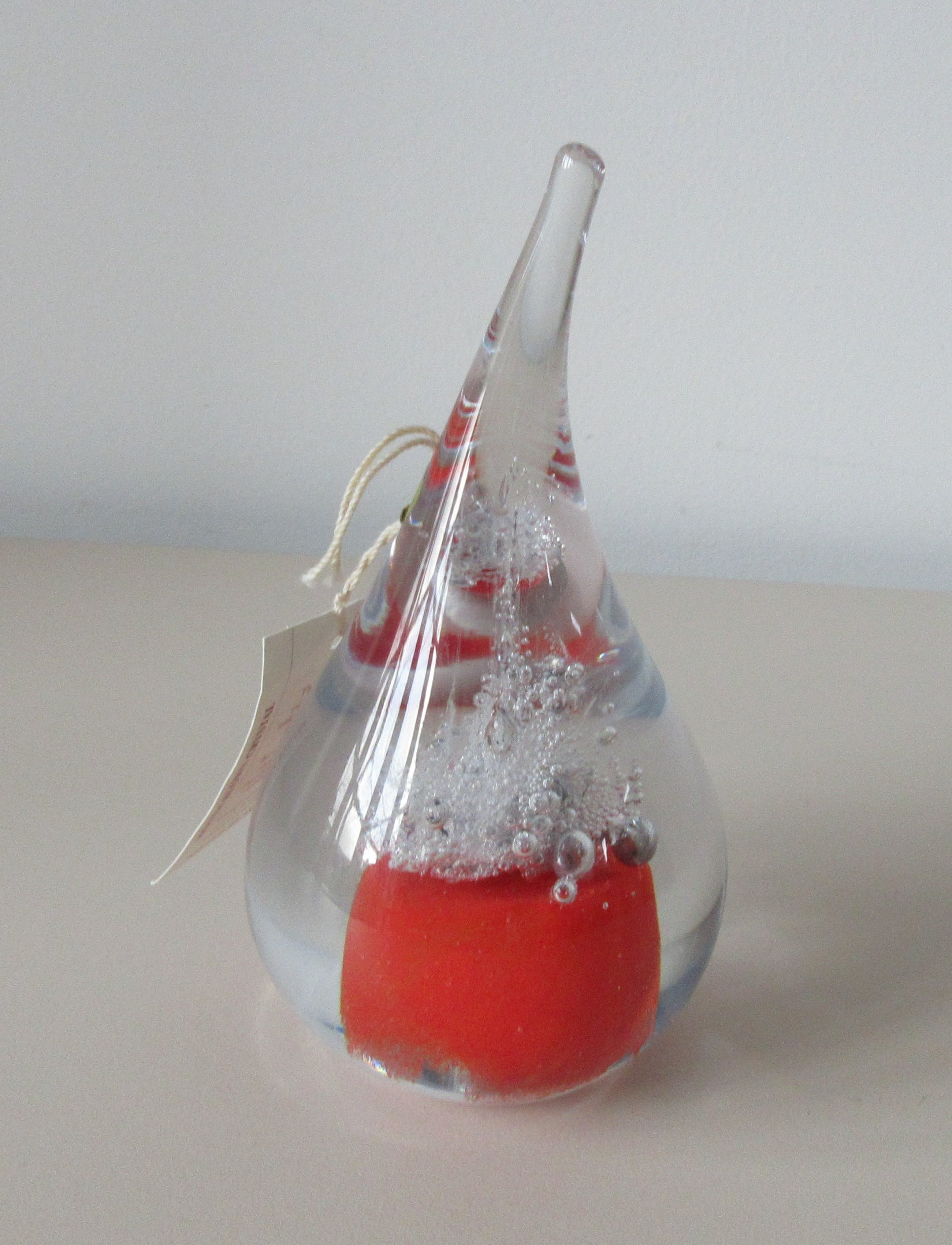 Massief glazen druppel met luchtbellen en rode glaspoeders van de bekende Poolse Glaskunstenaar Adam Jablonski. In zeer goede conditie, allen een paar krasjes op de onderzijde. Hand gesigneerd AJ op de onderzijde en voorzien van een merksticker + kartonnen kaartje.