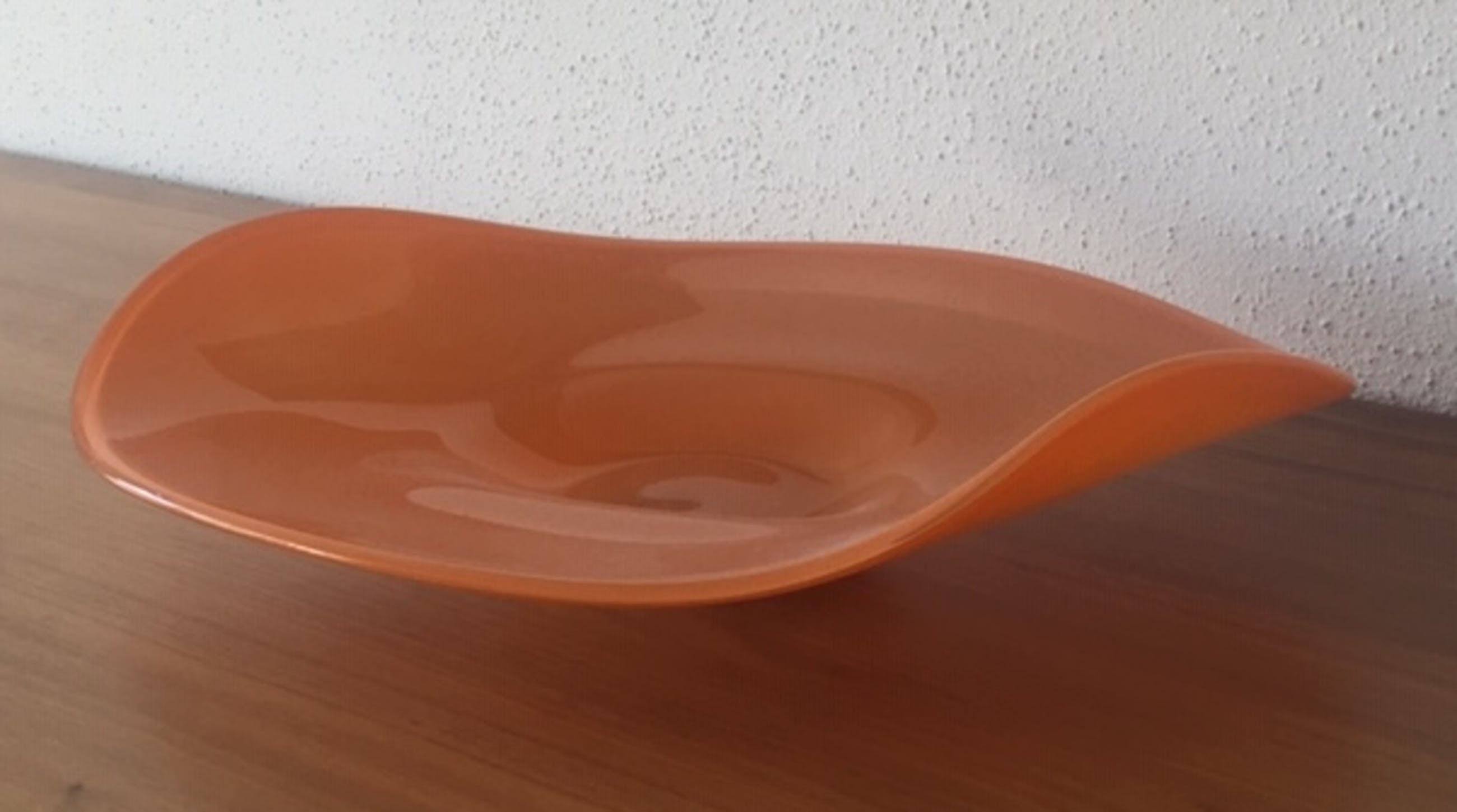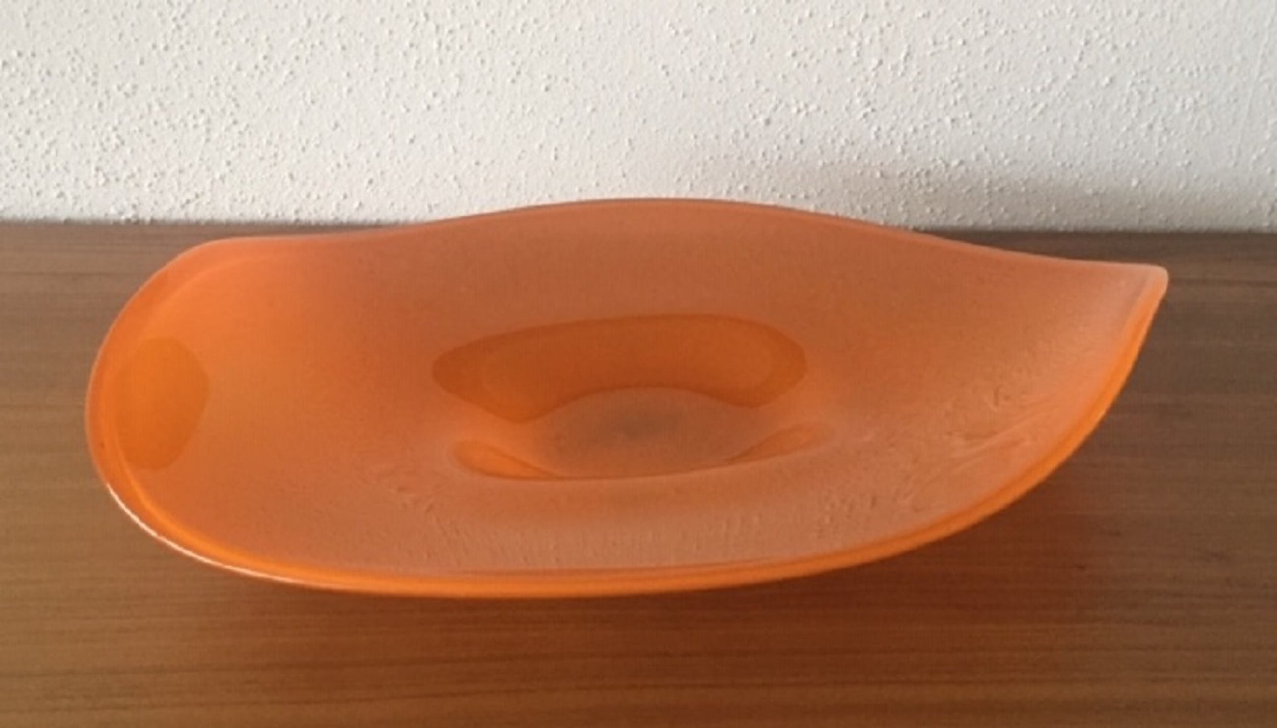 Mooie gewelfde ovale handgemaakte schaal in oranje glas.