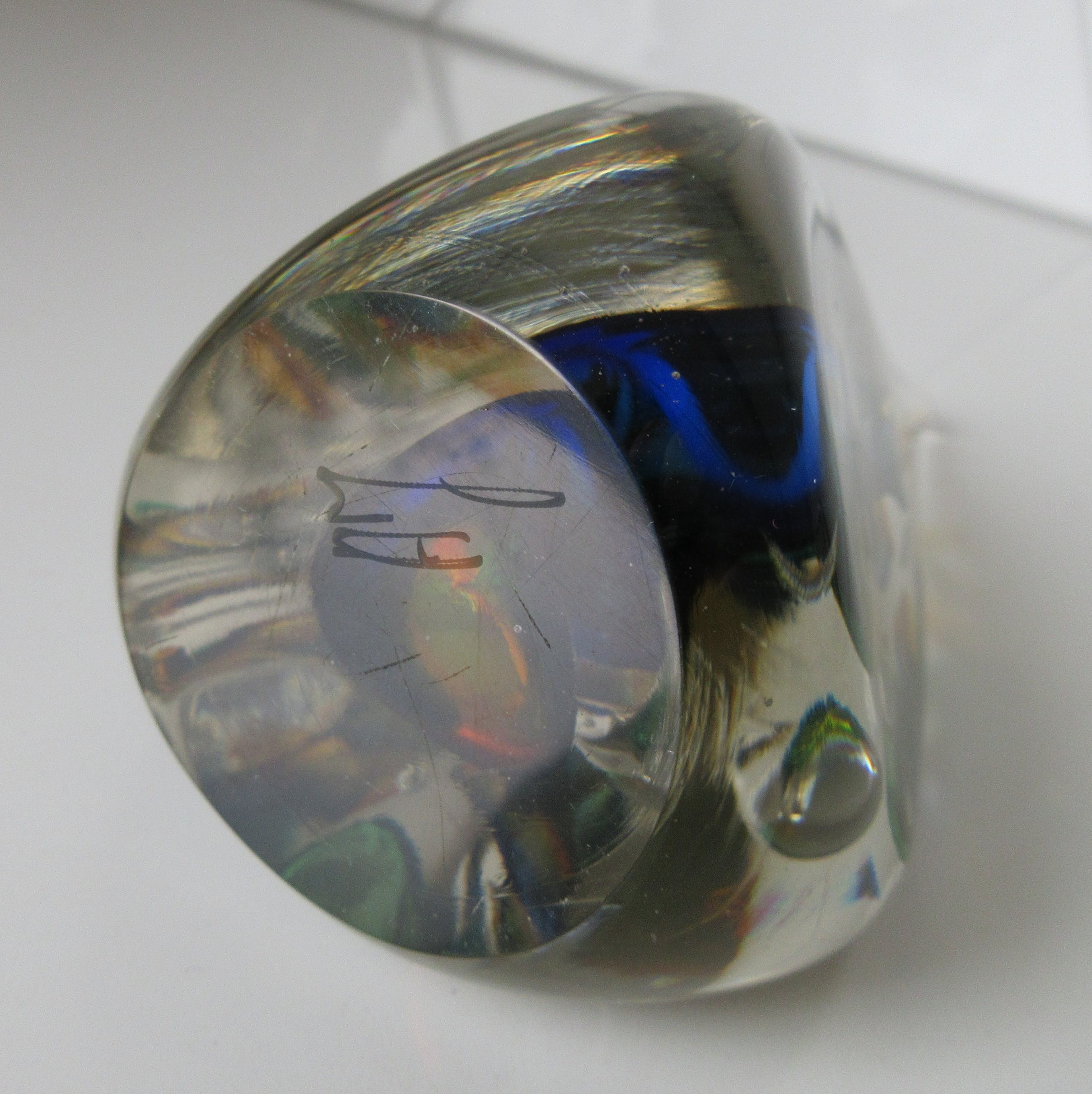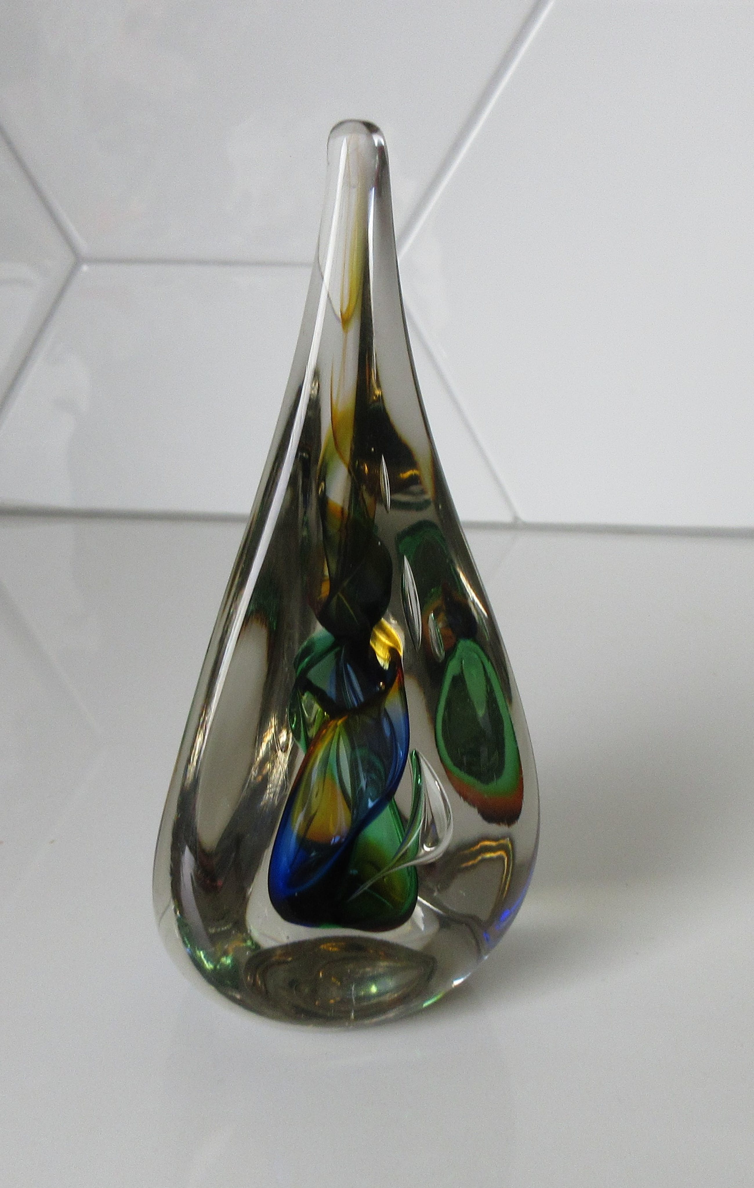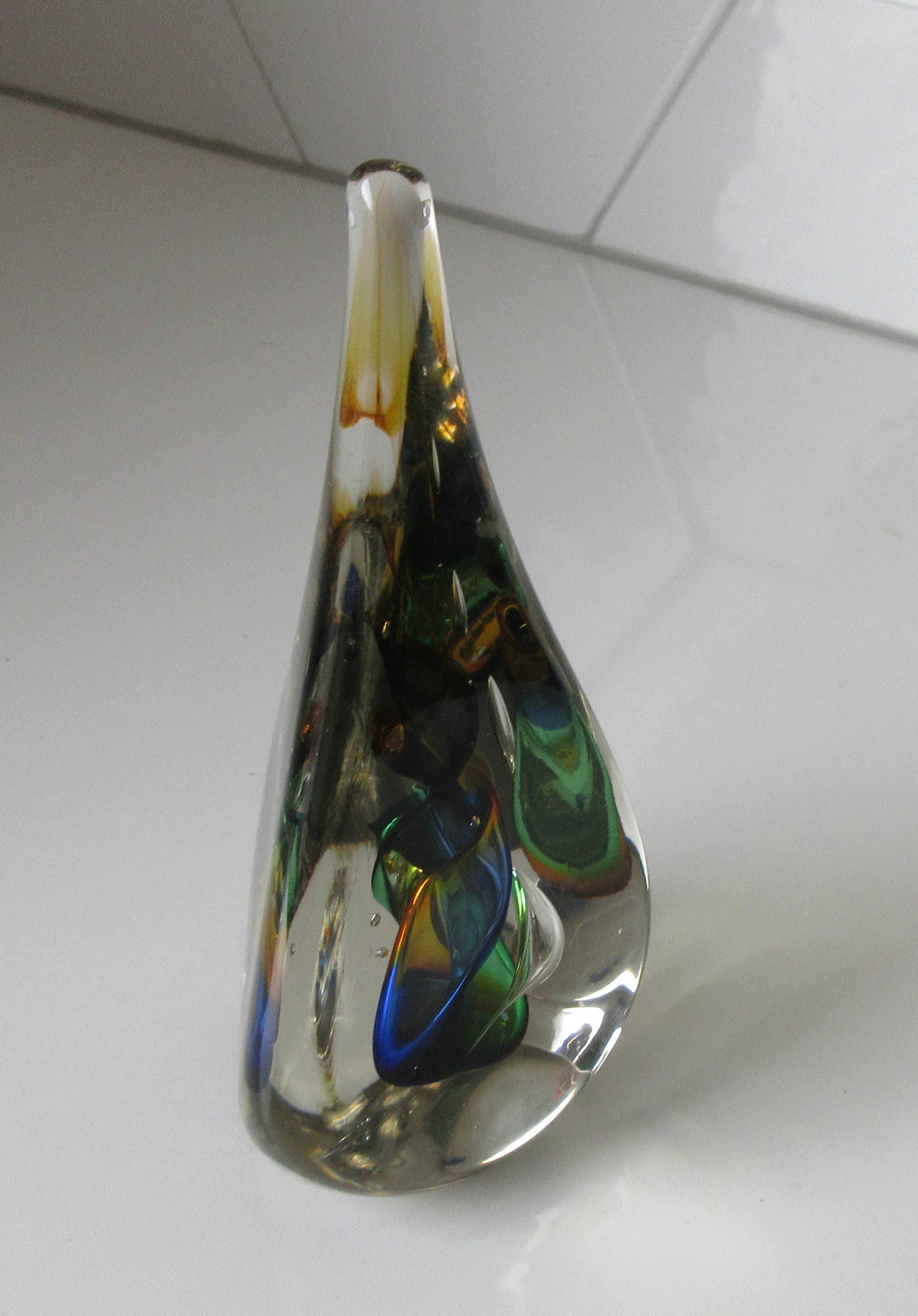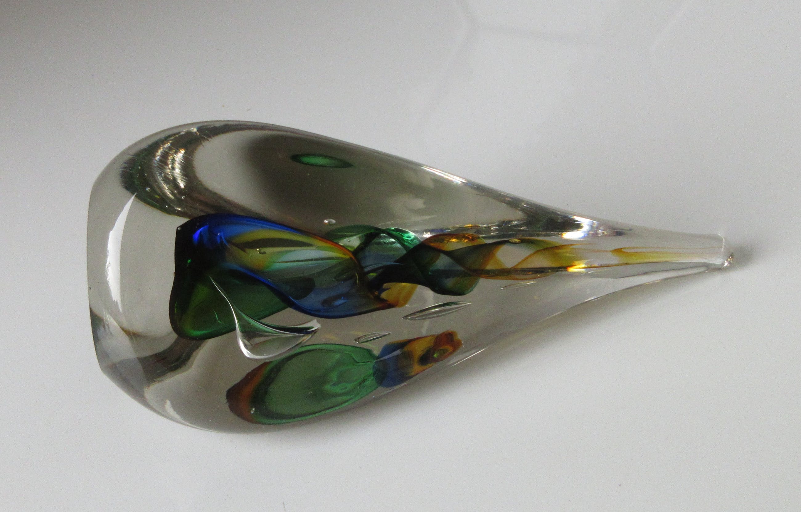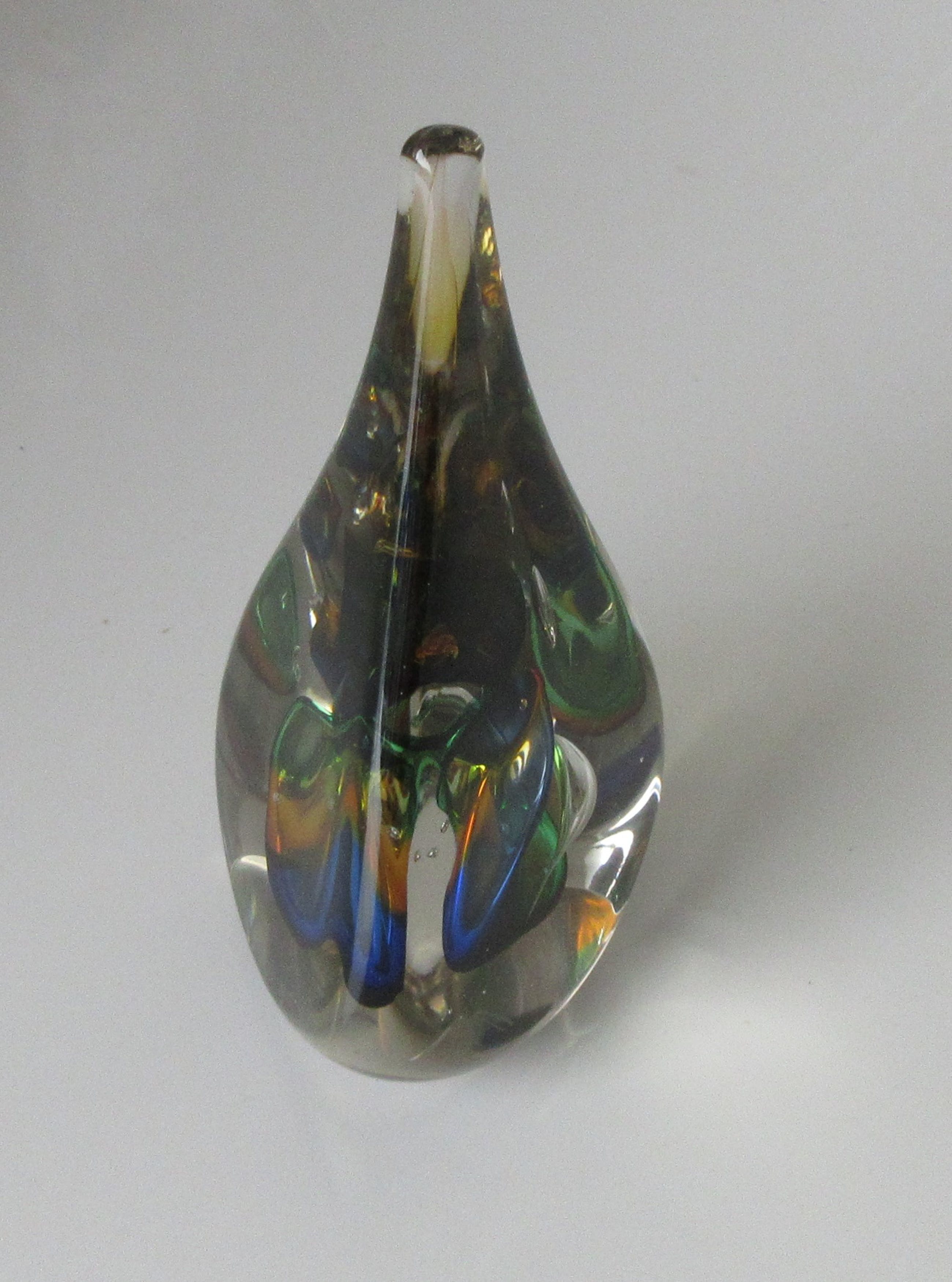 Meerkleurige glazen druppel op presse papier in de kleuren; rook, groen, blauw en amber. Uitgevoerd door de glaskunstenaar Adam Jablonski uit Polen. Gesigneerd AJ aan de onderzijde.