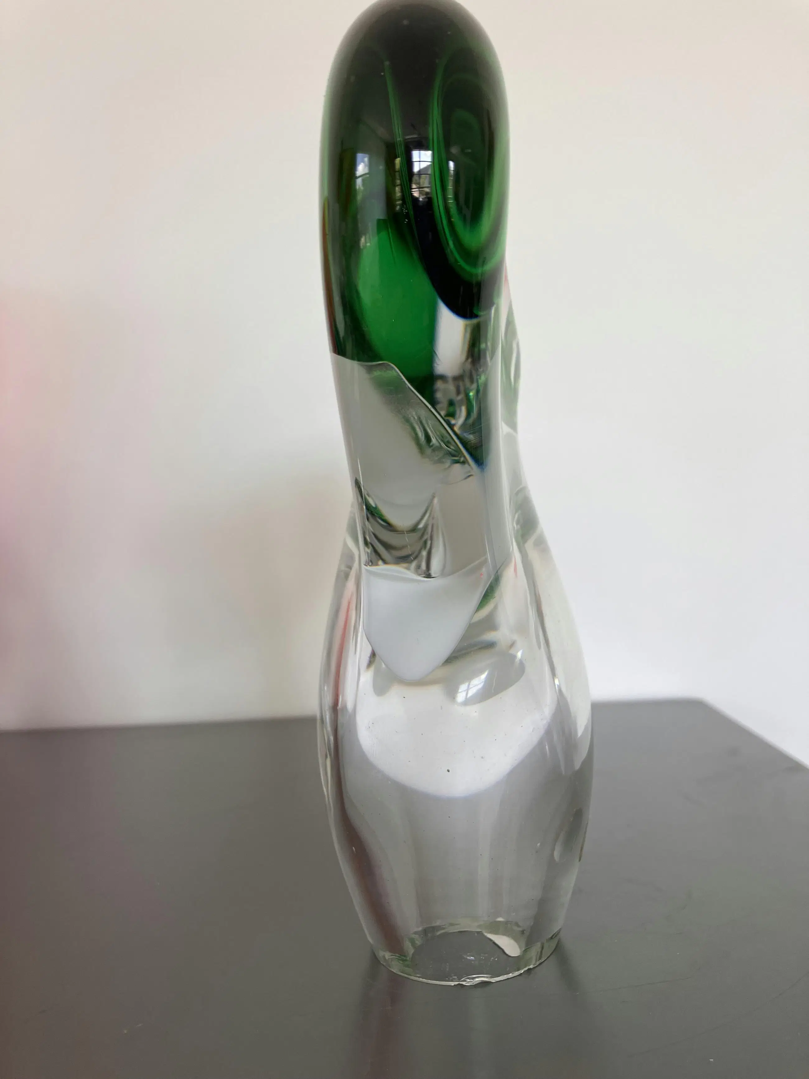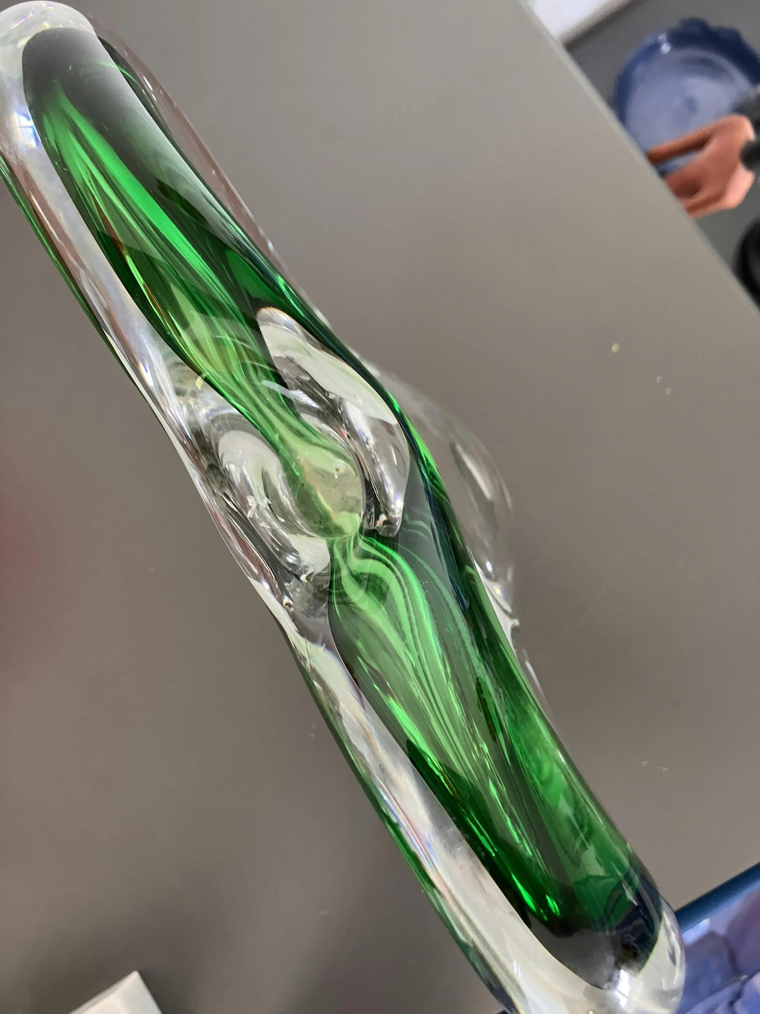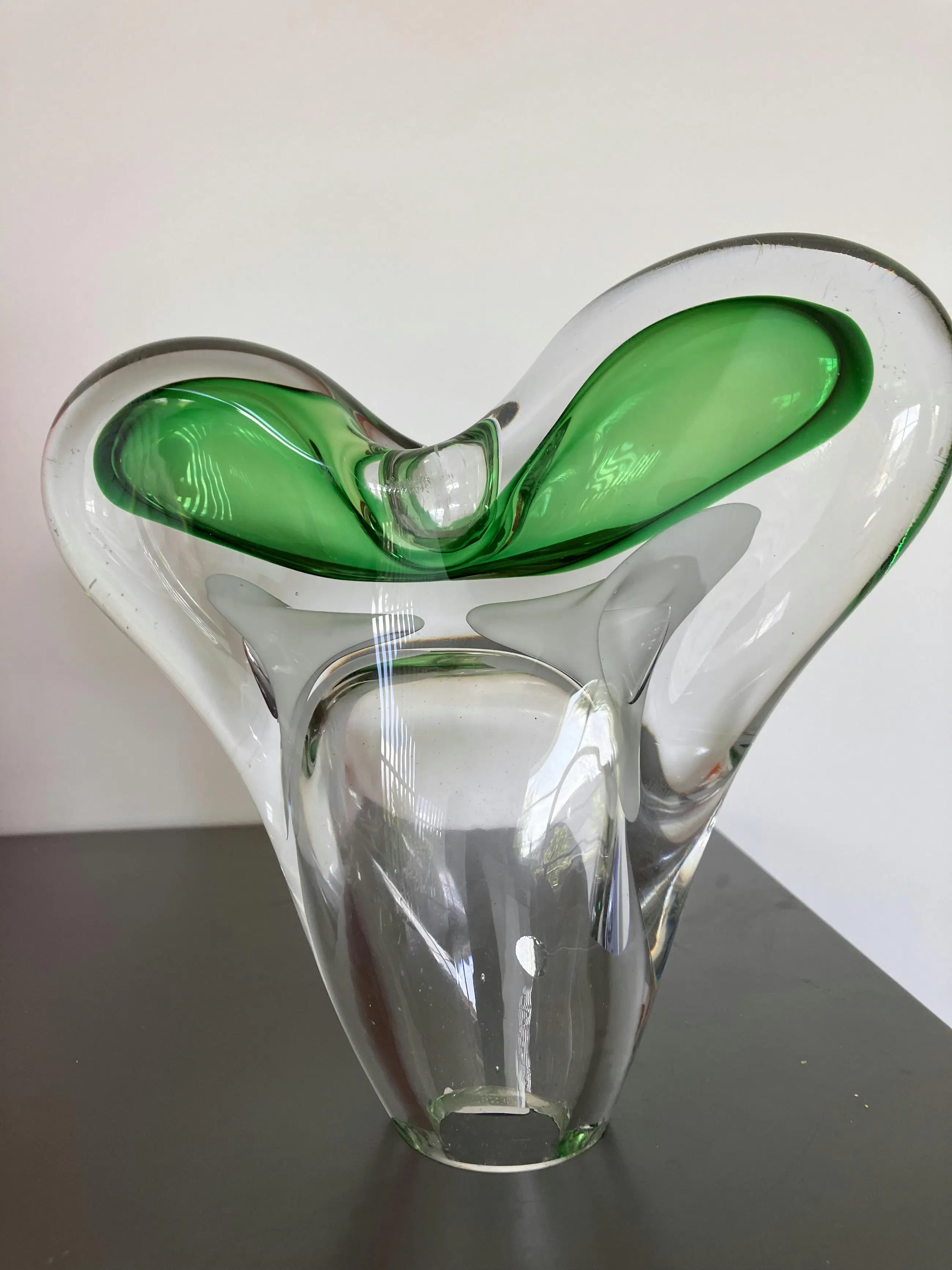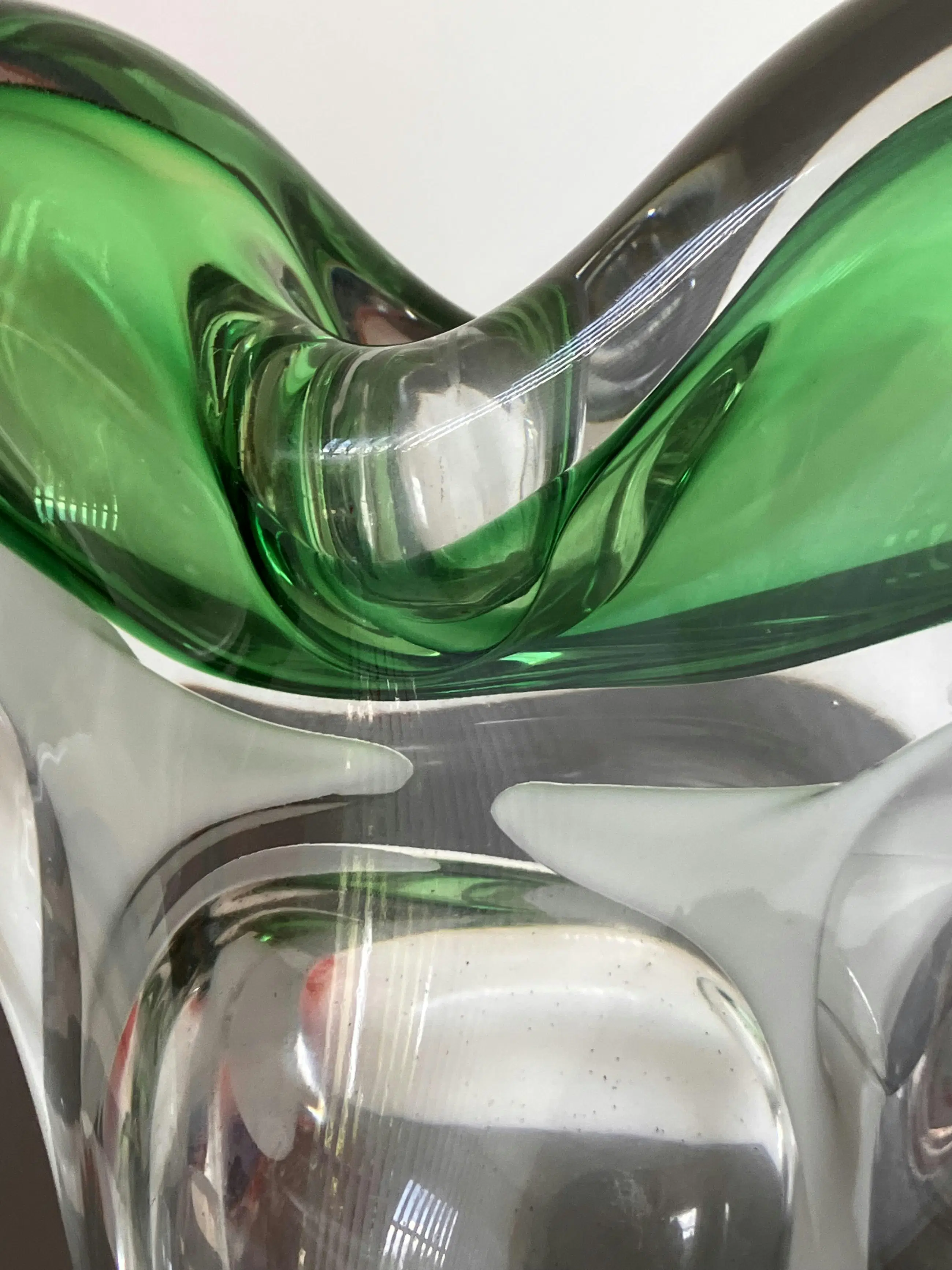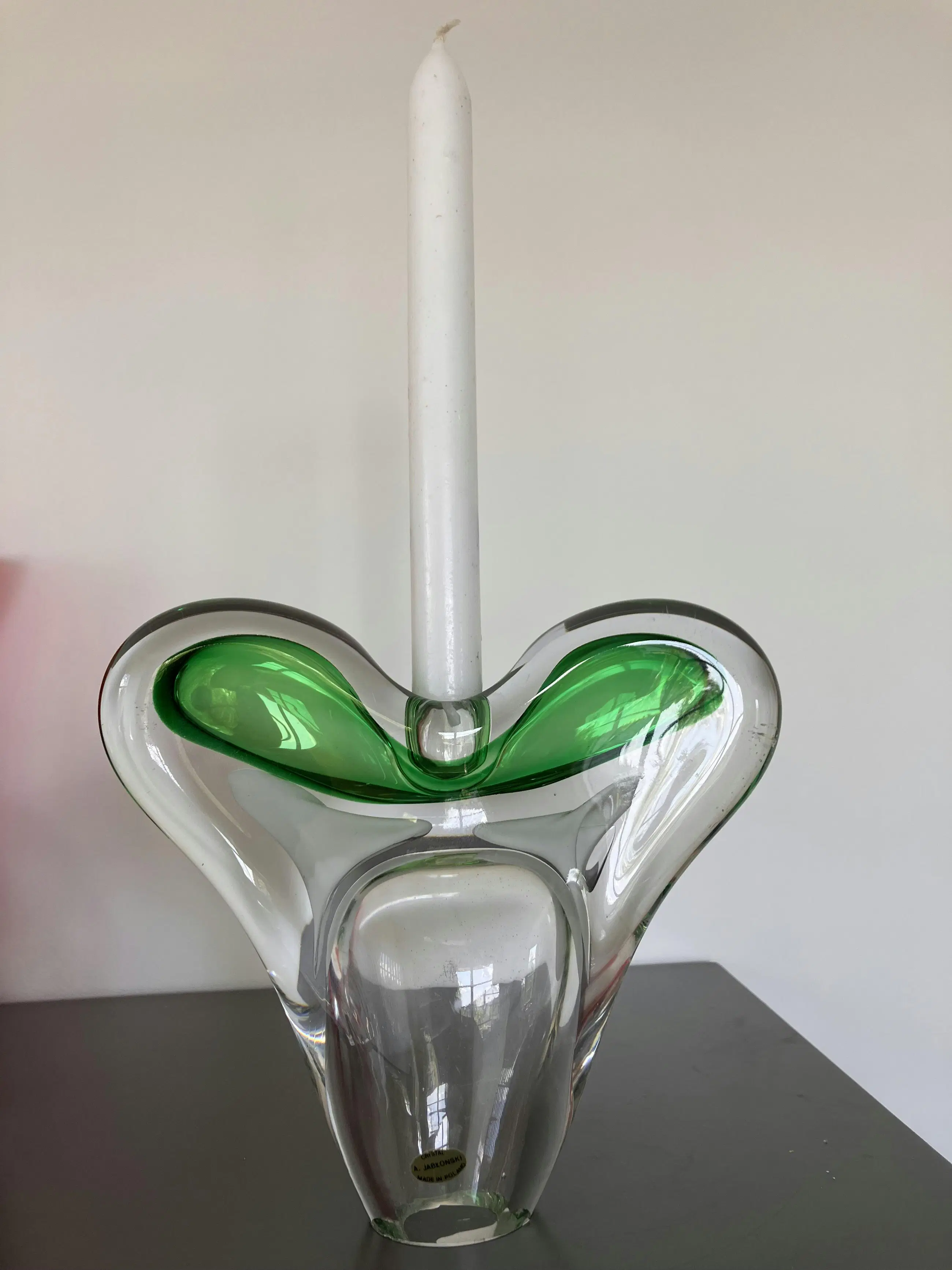 Handgemaakte kandelaars dus niet exact identiek Gewicht samen 3744 gram Helder kristal met groen en wit