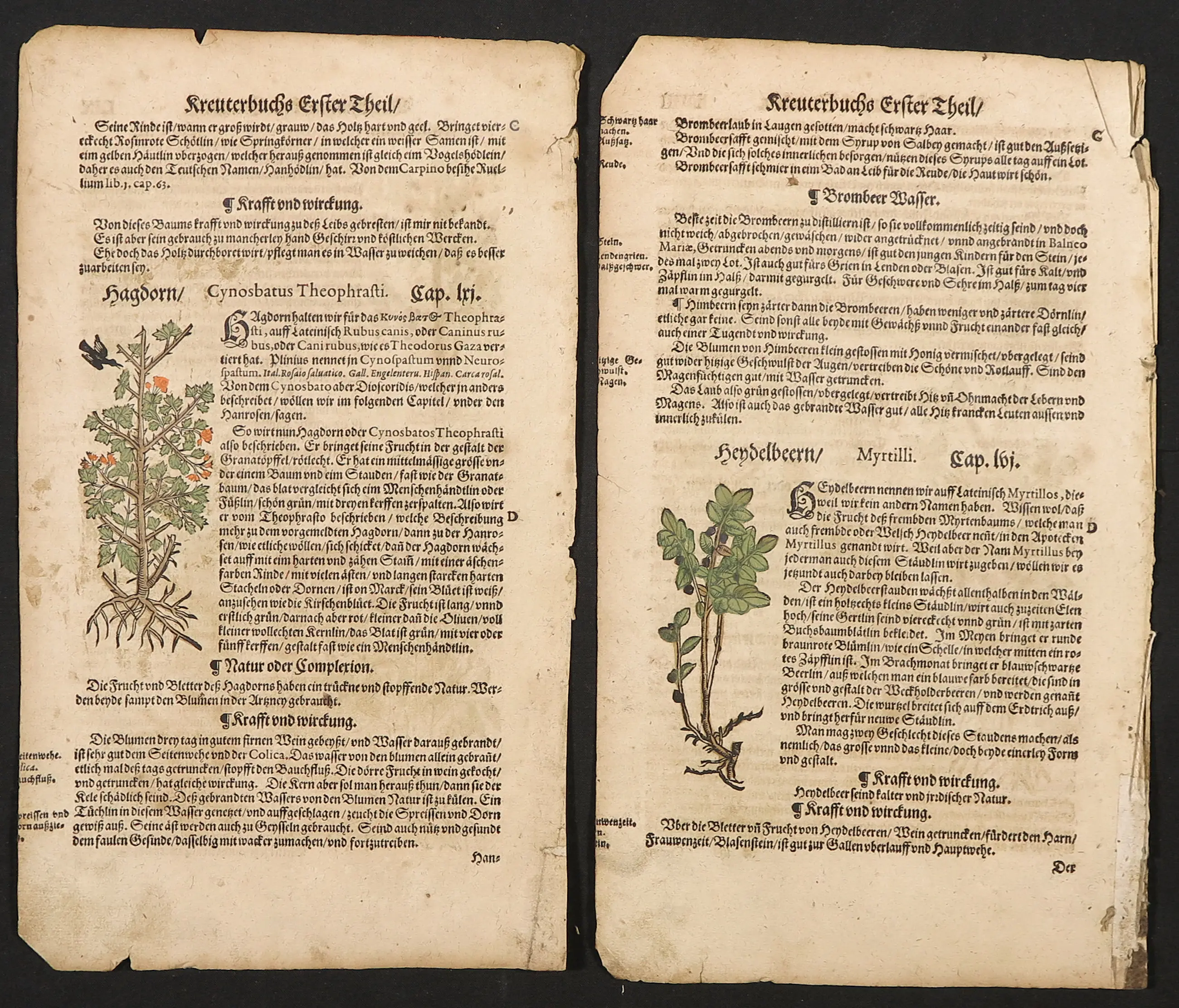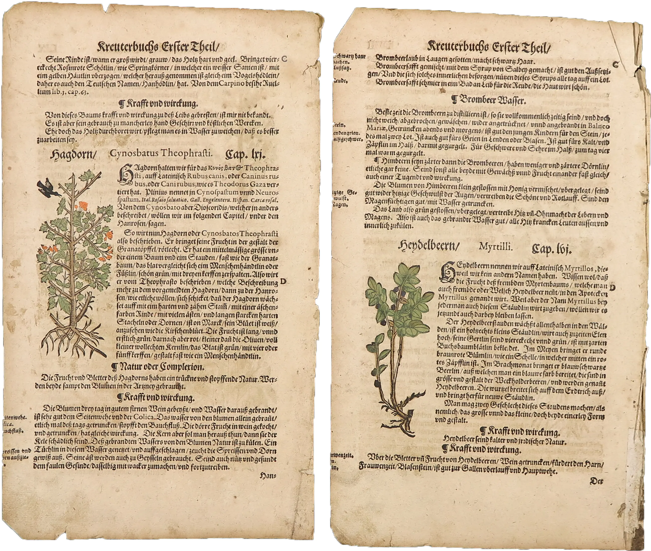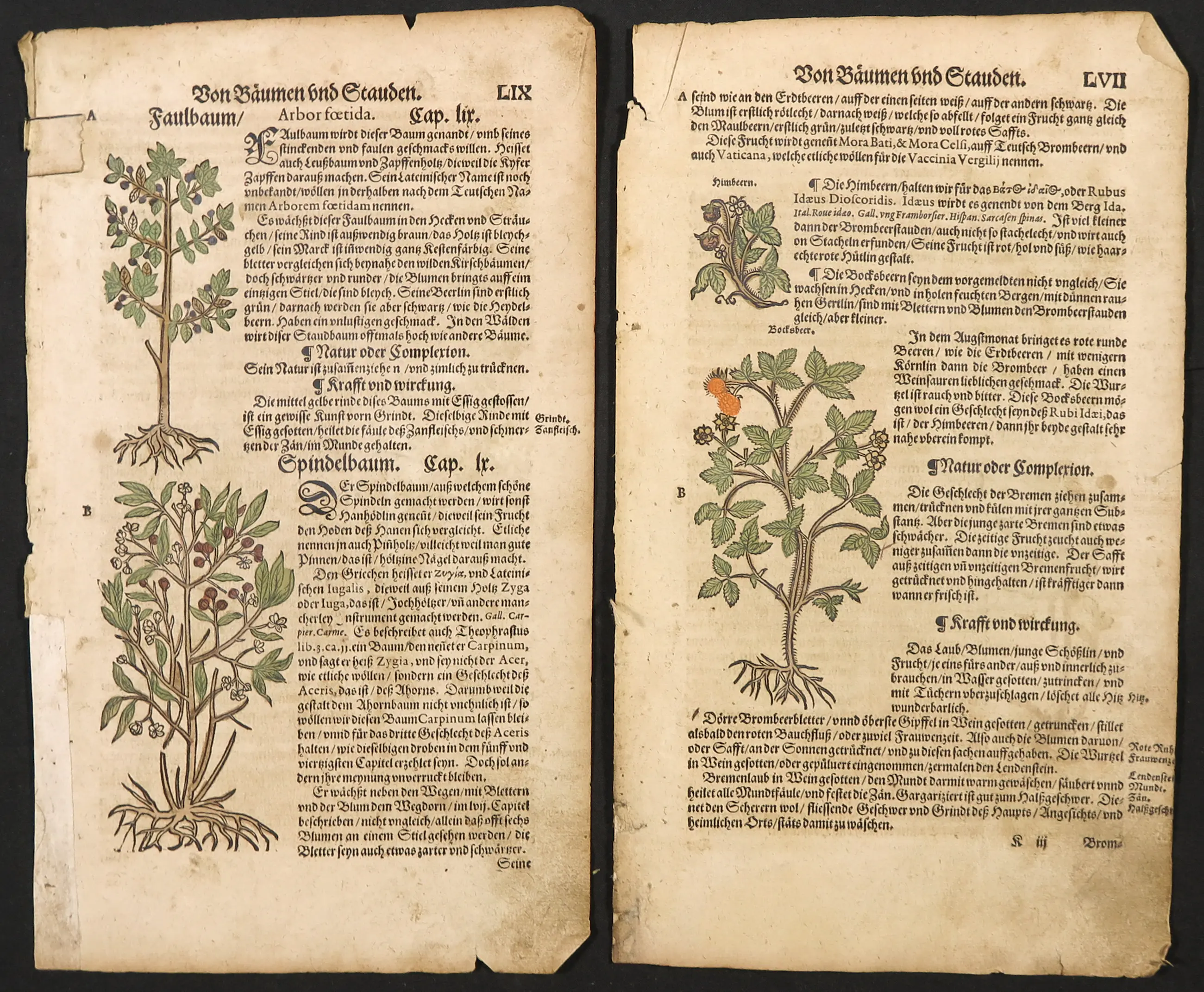 Twee met de hand ingekleurde pagina's uit het Kräuterbuch (ook wel Kruidenboek). Dit boek is tot stand gekomen door de interesse van Lonitzer in kruiden en botanie.