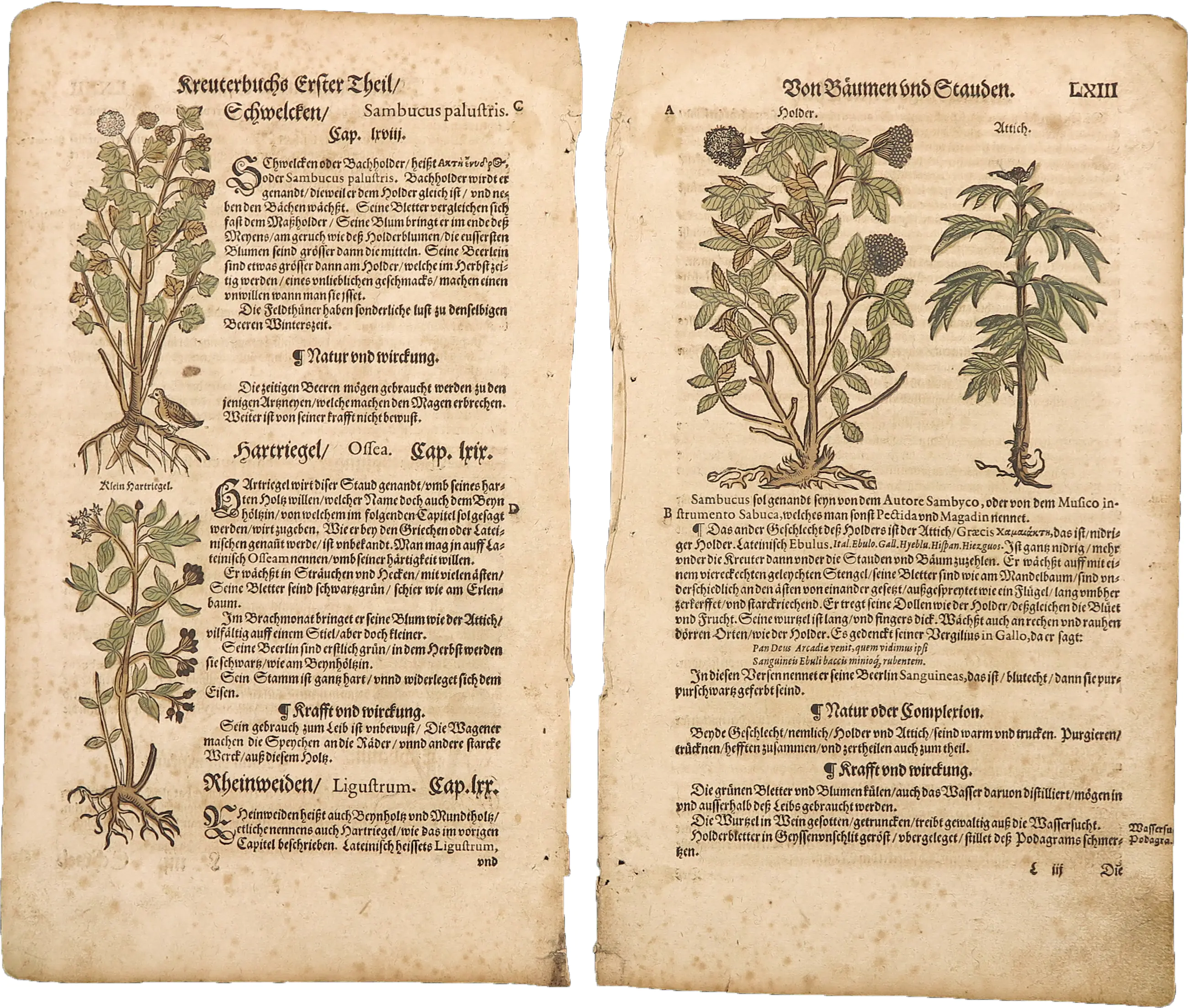 Twee met de hand ingekleurde pagina's uit het Kräuterbuch (ook wel Kruidenboek). Dit boek is tot stand gekomen door de interesse van Lonitzer in kruiden en botanie.