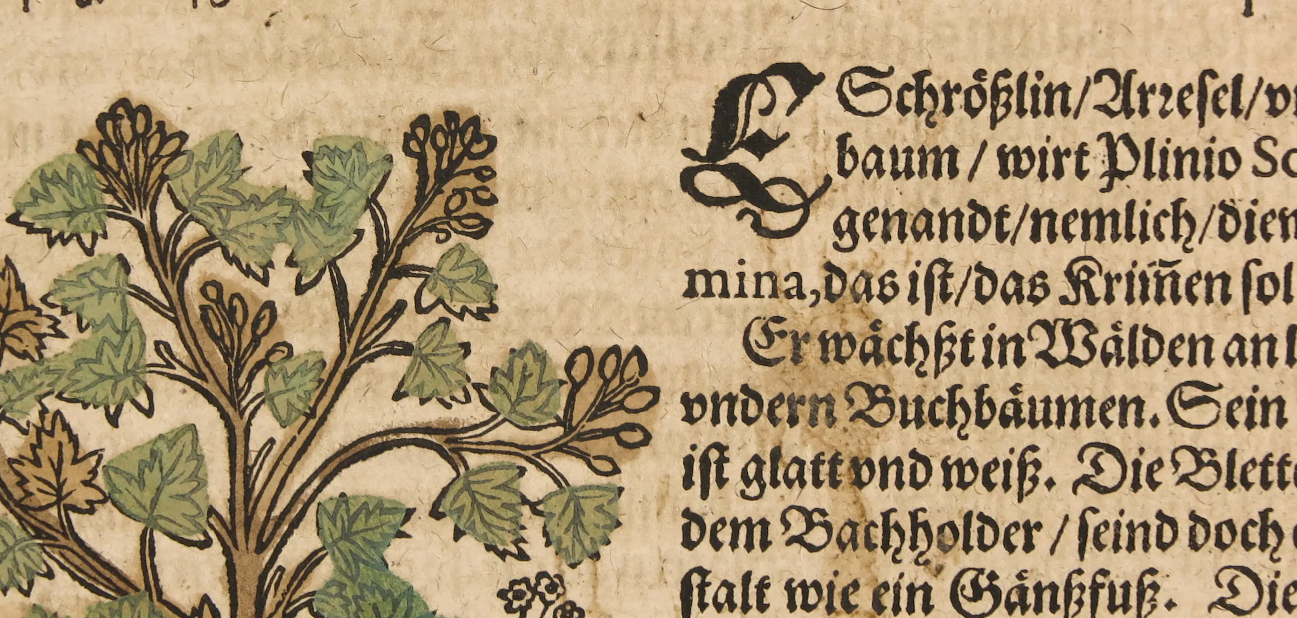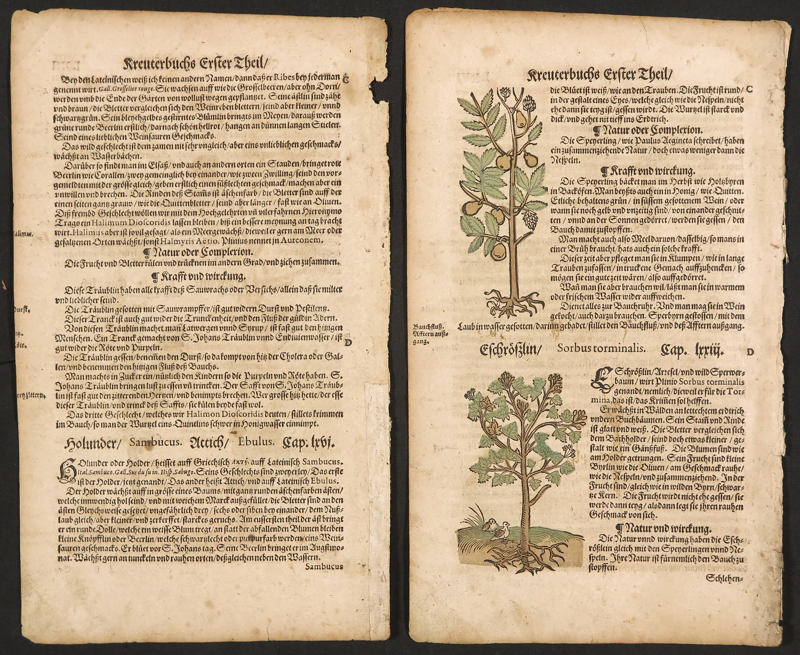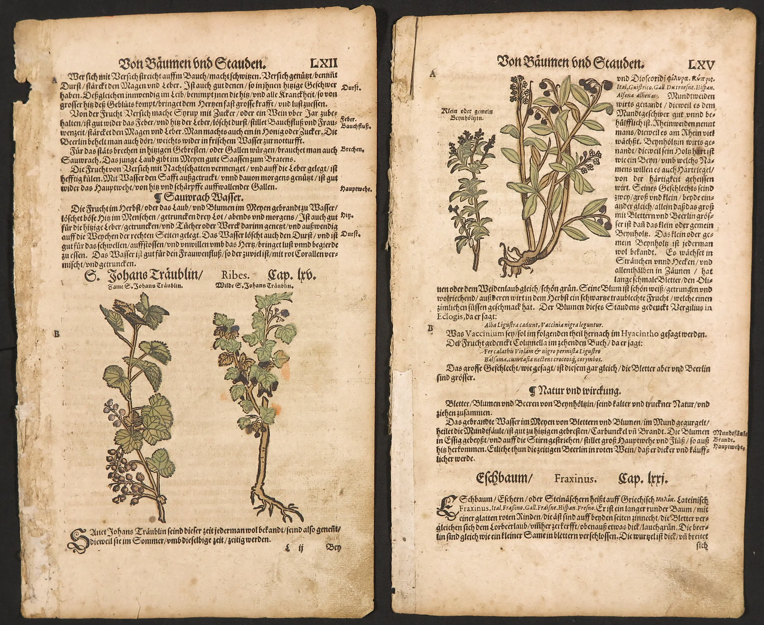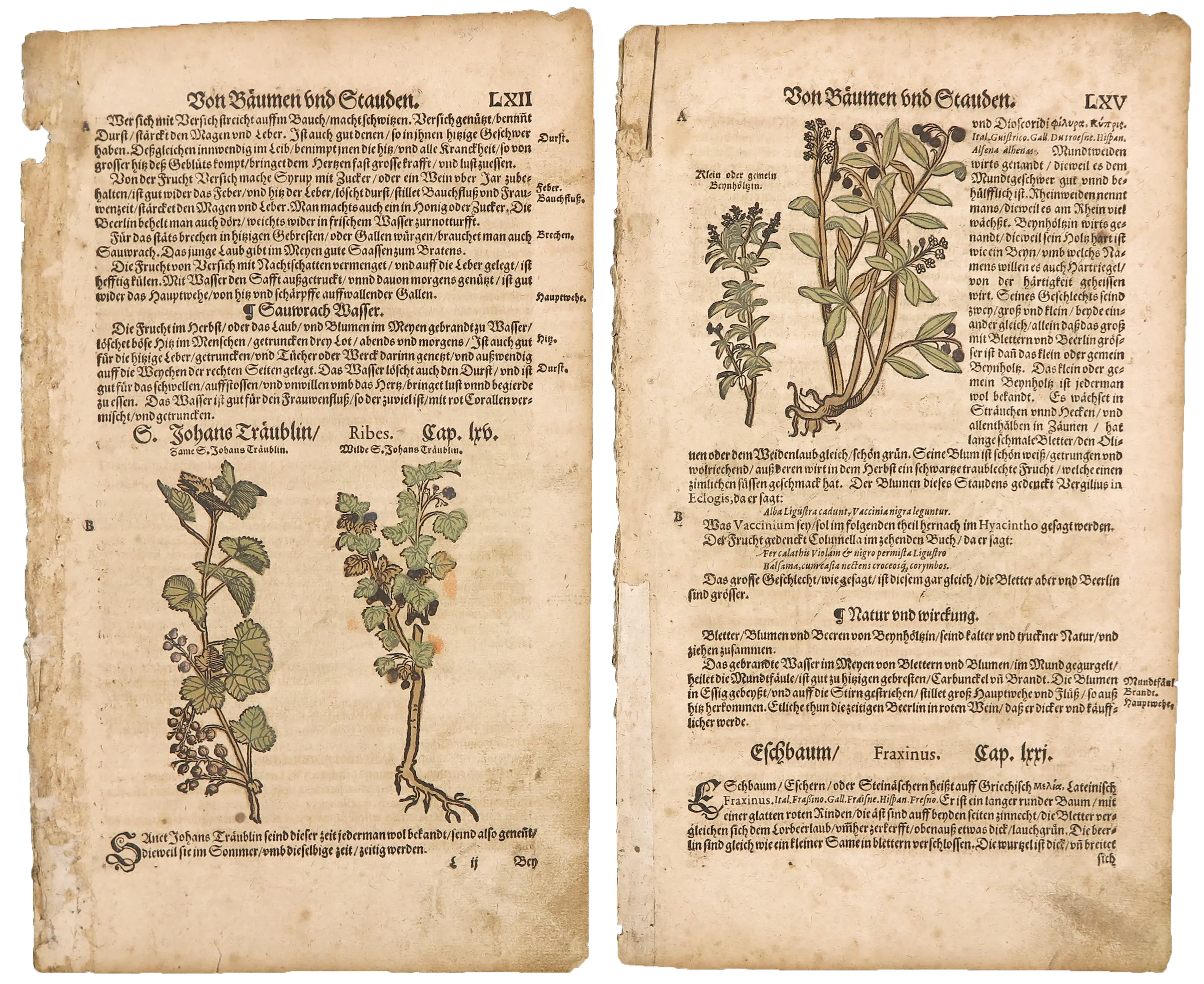 Twee met de hand ingekleurde pagina's uit het Kräuterbuch (ook wel Kruidenboek). Dit boek is tot stand gekomen door de interesse van Lonitzer in kruiden en botanie.