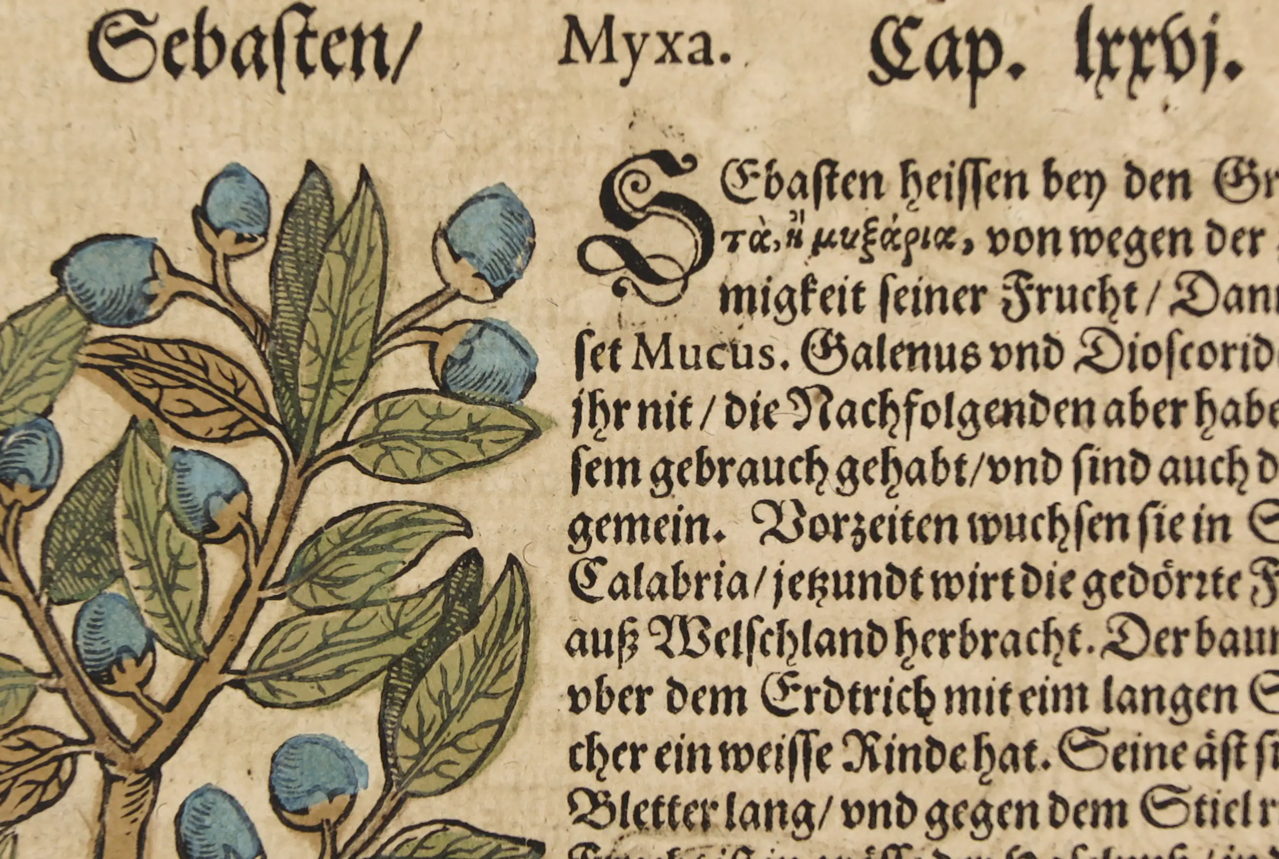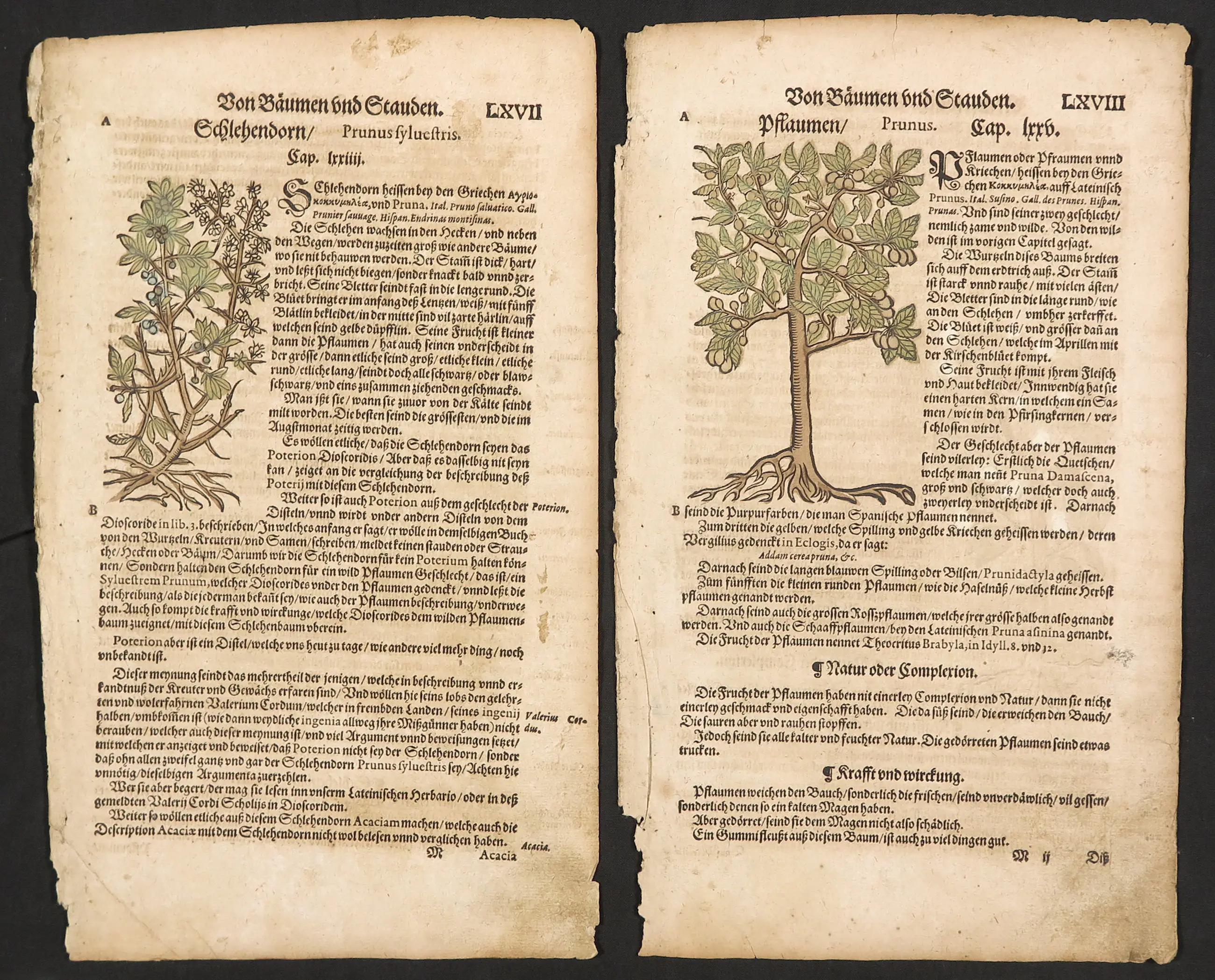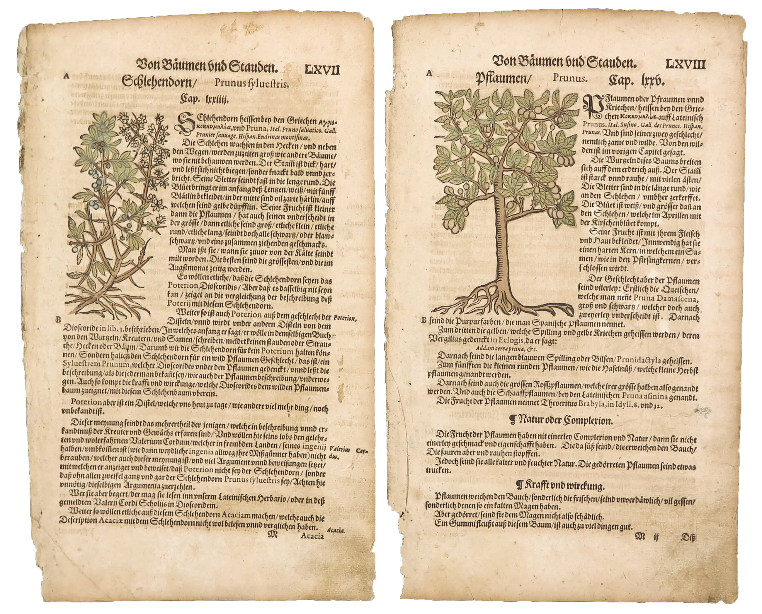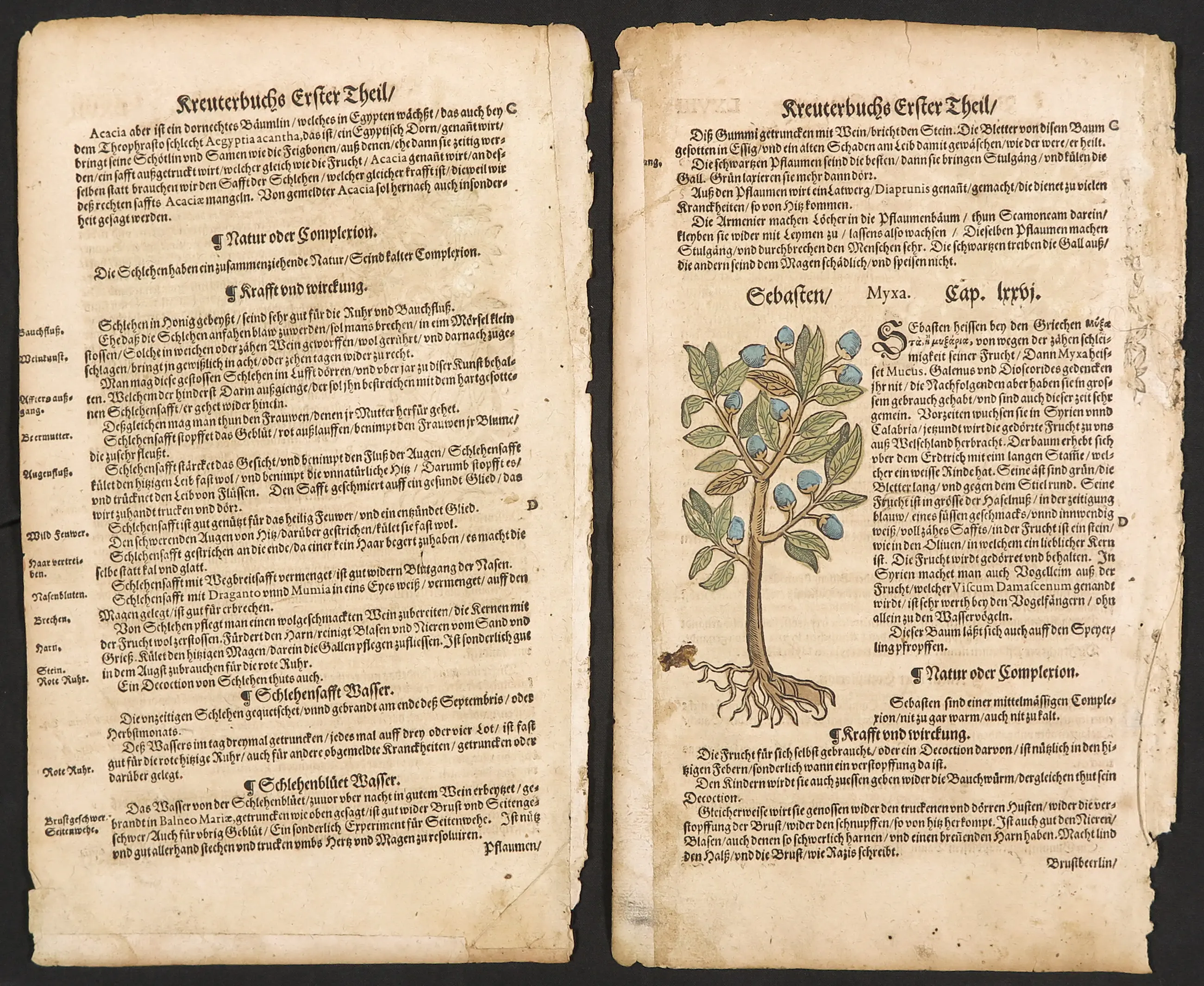 Twee met de hand ingekleurde pagina's uit het Kräuterbuch (ook wel Kruidenboek). Dit boek is tot stand gekomen door de interesse van Lonitzer in kruiden en botanie.