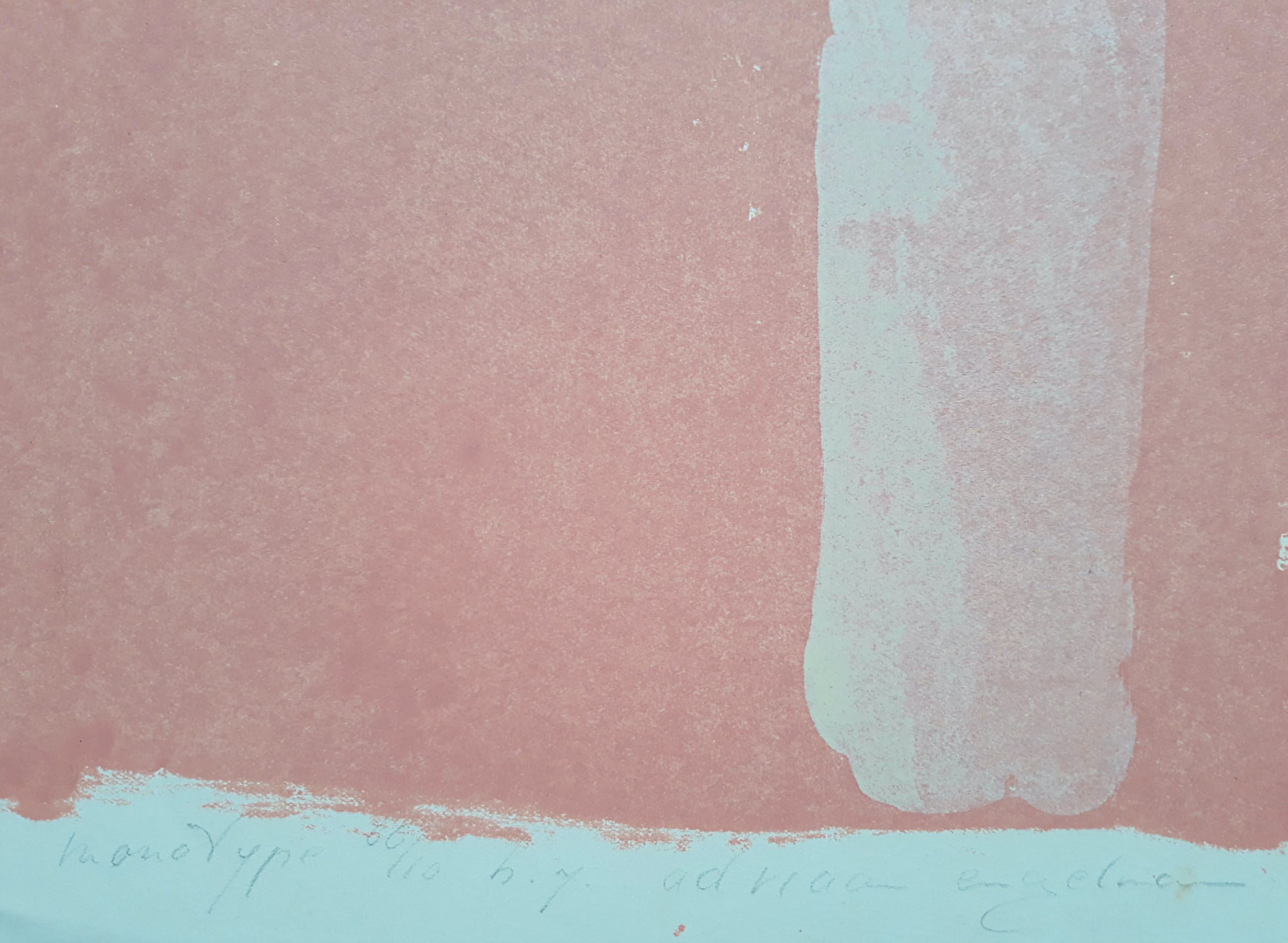 Krachtig abstract werk van (toen nog) Adriaan Engelman. Monotype op dik papier, aan de bovenkant gemonteerd op een onderblad, met potlood gesigneerd en gedateerd linksonder (66/10 = oktober 1966). In zeer goede conditie. Afkomstig uit de nalatenschap van de kunstena(a)r(es).