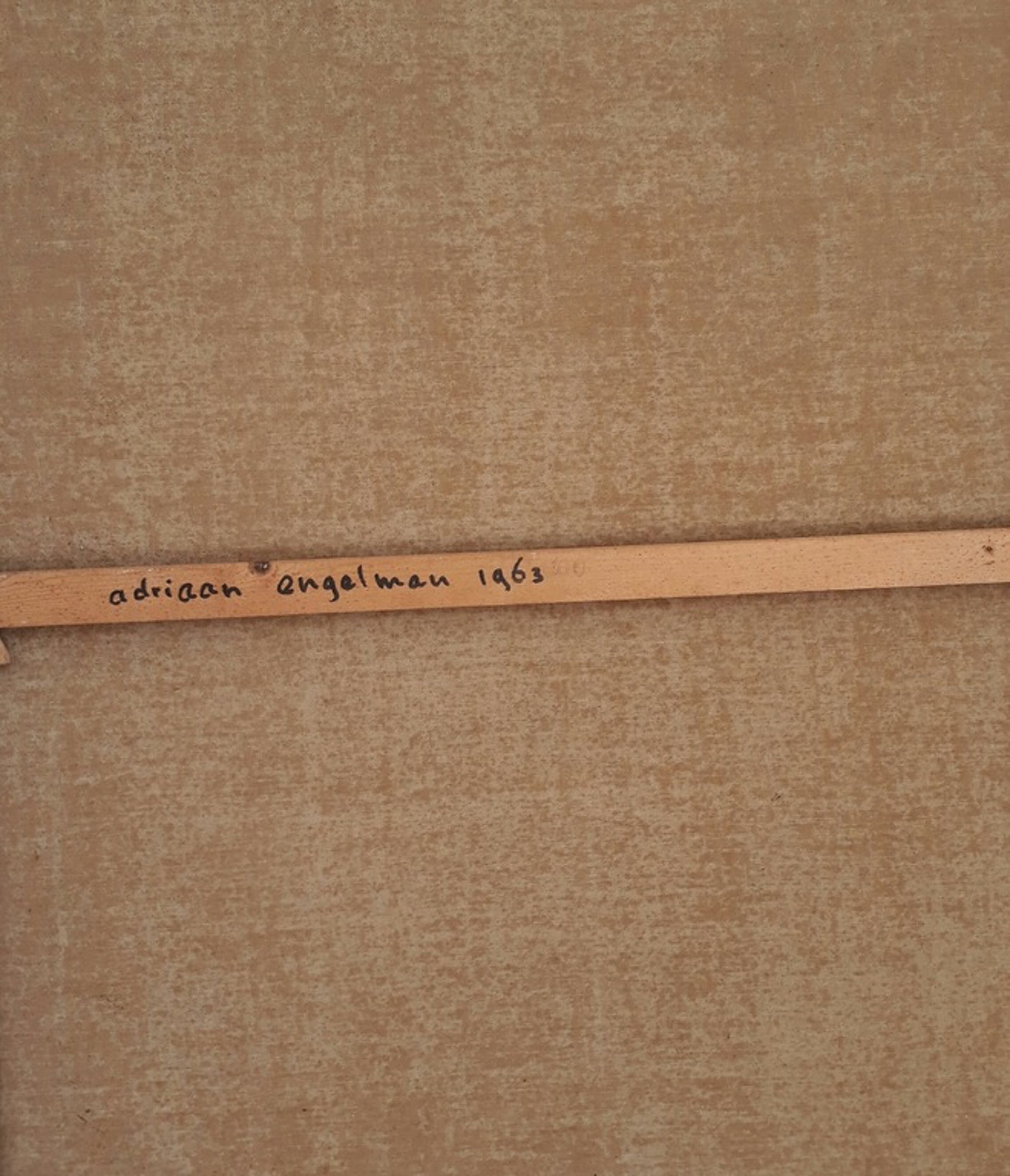 Aantrekkelijk en groot werk van Adine, toentertijd (1963) nog Adriaan - zonder lijst. Goede staat, in hoek iets bruinig doorkomend doek, niet storend ( denk ik )