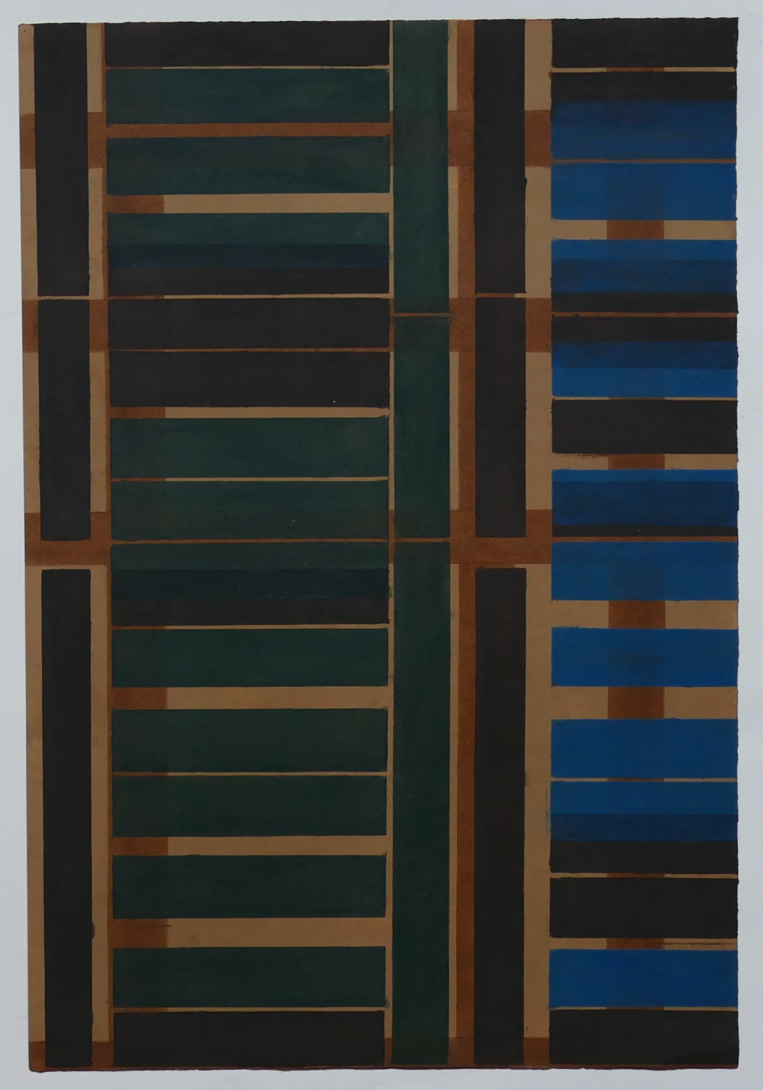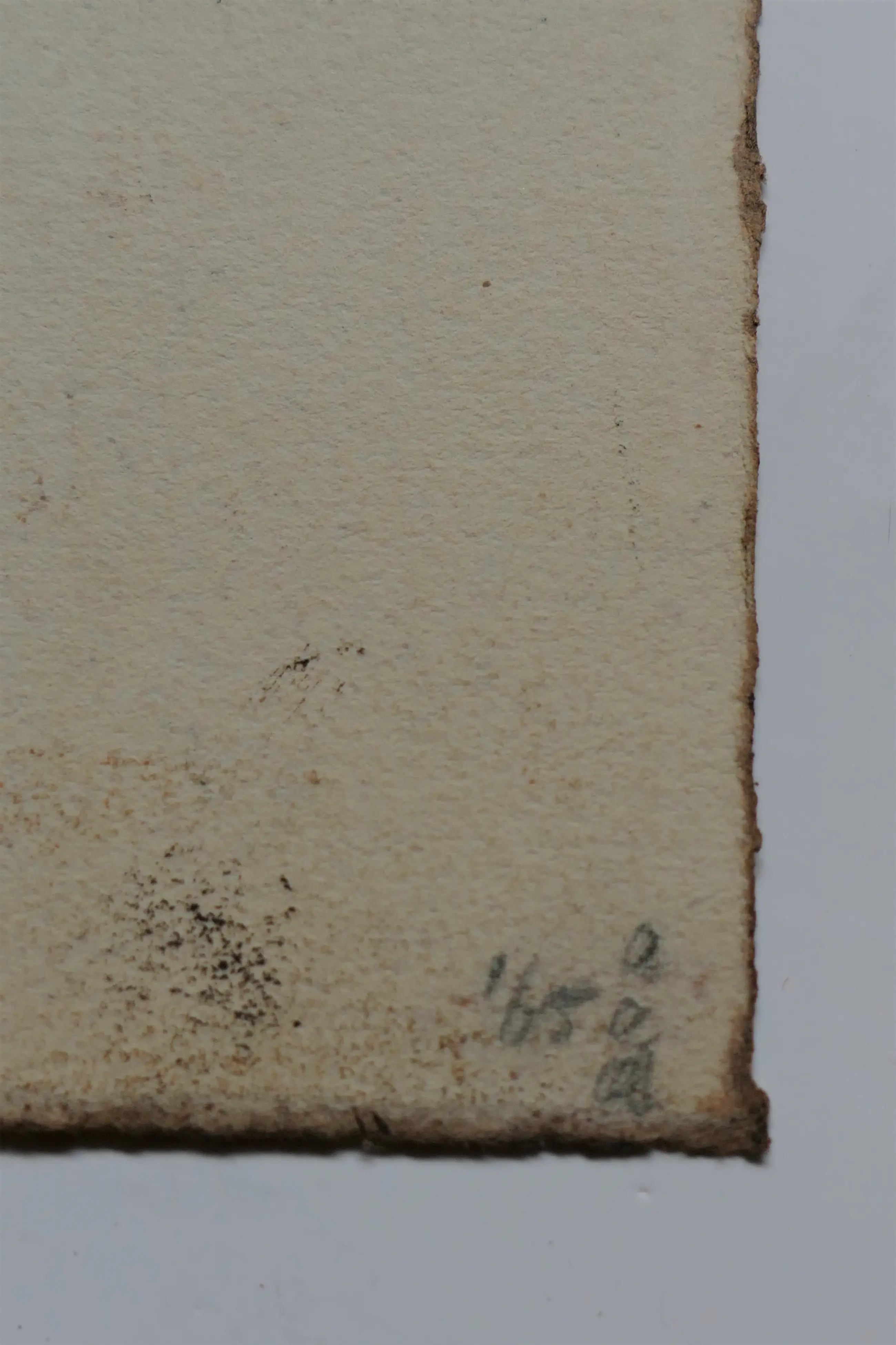 1965. Sjabloondruk. Anders dan bij de Monotype techniek maakte Engelman gebruik van de zg. sjabloondruk techniek : in meerder lagen aangebrachte waterverf. Inverso in potlood : ' 65 aad.