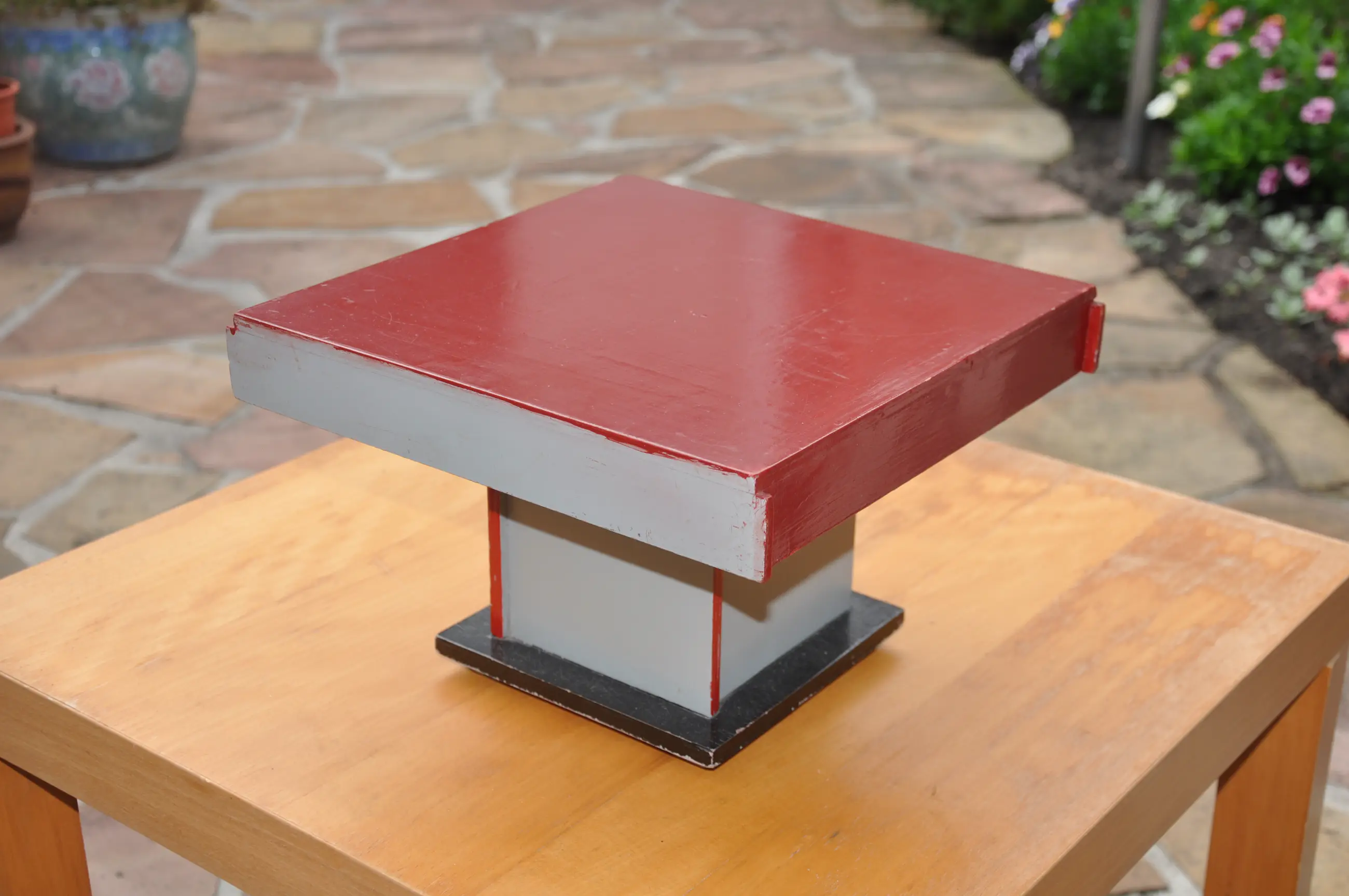 Dit poppenmeubel is ontworpen door Ko Verzuu en in de jaren dertig van de vorige eeuw gemaakt in speelgoedfabriek ADO. Dit tafeltje is waarschijnlijk van medio jaren 30, het komt van mijn moeder of haar nicht, die allebei rond 1930 waren geboren. Het met potlood geschreven nummer is 33 of 35.