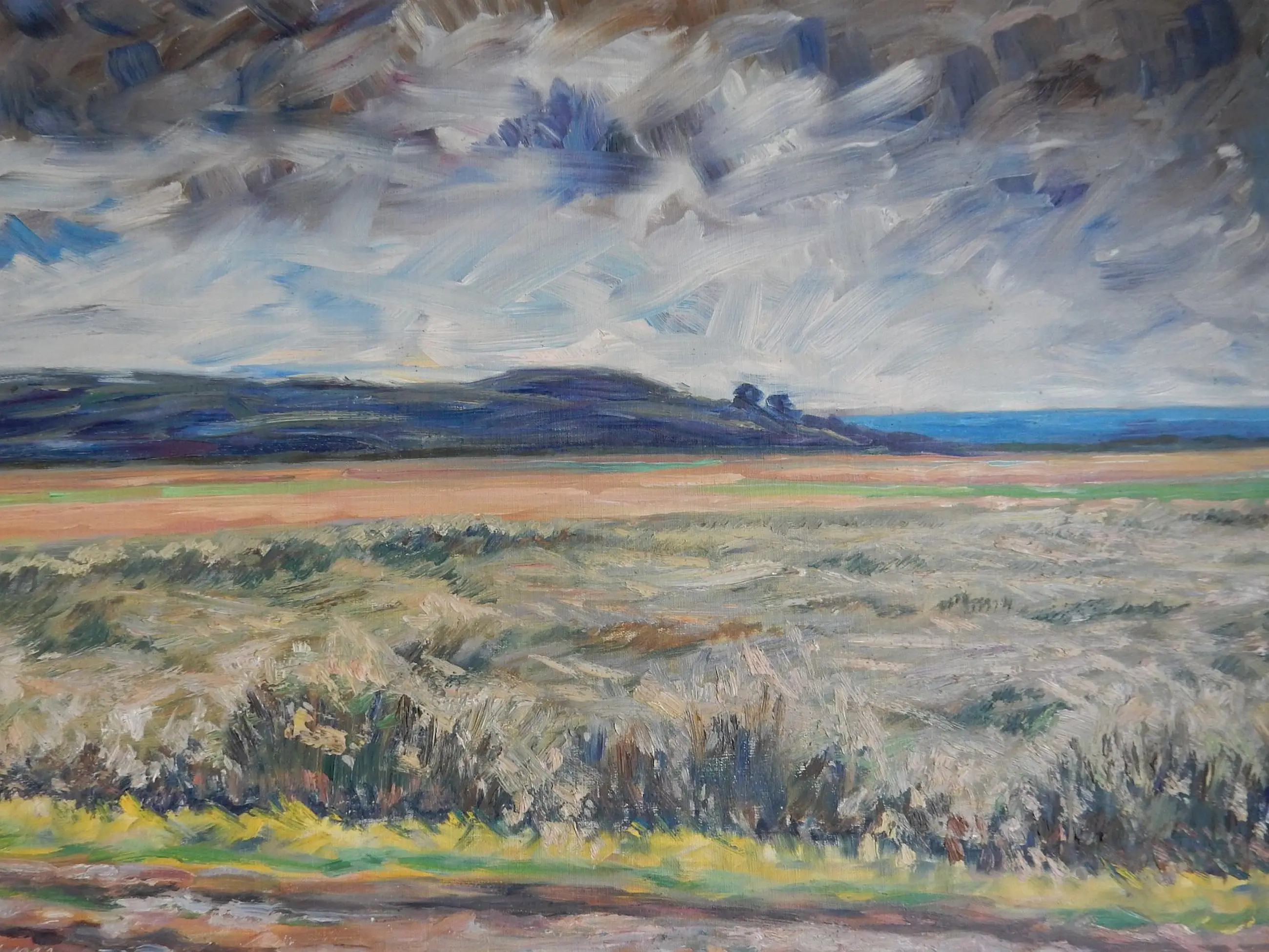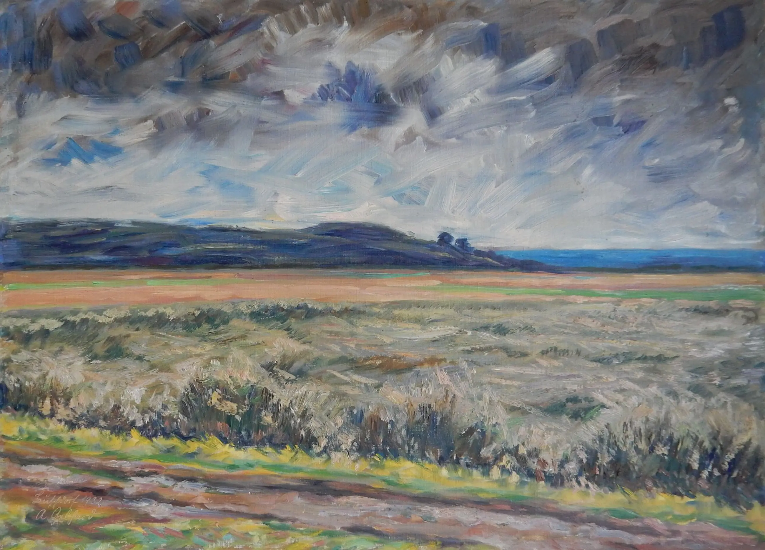 Dit is een afbeelding van een landschap gevormd door velden, op de achtergrond is een aaneenschakeling van heuvels en een waterlichaam te zien; het blijft open of het nu een meer is of zelfs de zee. De donker getinte lucht geeft het beeld een dramatisch tintje, alsof er onweer op komst is.