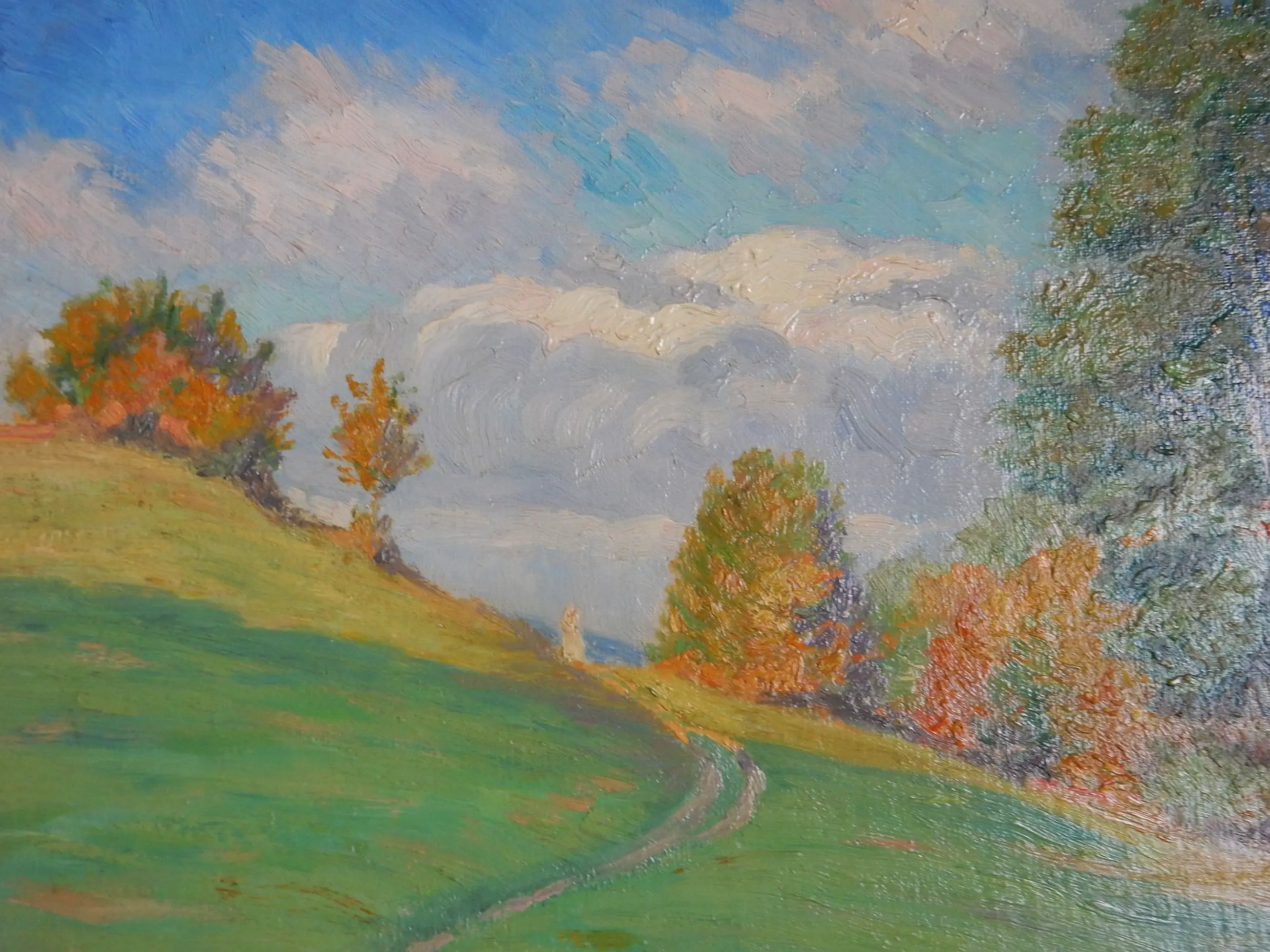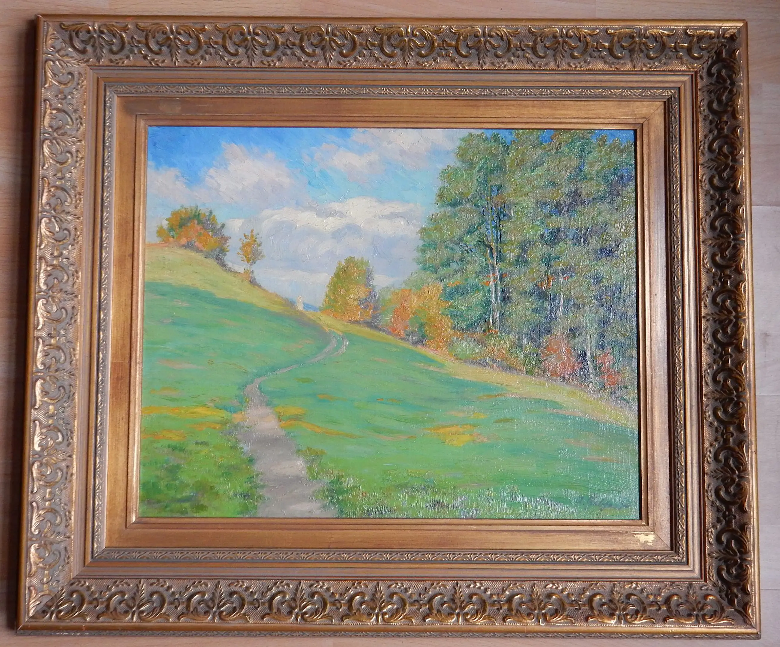 Vroeger werden veel kunstenaars vanuit de stad naar de natuur getrokken op zoek naar artistieke inspiratie. Vanaf Bonn, waar de kunstenaar Adolf Gebhard lange tijd heeft gewoond, is het niet ver naar het middelgebergte van de Eifel. Vooral Schleiden heeft veel bezienswaardigheden te bieden, naast de culturele en historische, vooral de bossen rond de stad. Het olieverfschilderij toont het tafereel van een dame die midden in de late zomer langs een pad loopt, wat gemakkelijk te herkennen is gezien de felle kleuren. De uitbundig vormgegeven gouden houten lijst is in goede staat en zou alleen al een driecijferig eurobedrag kosten.