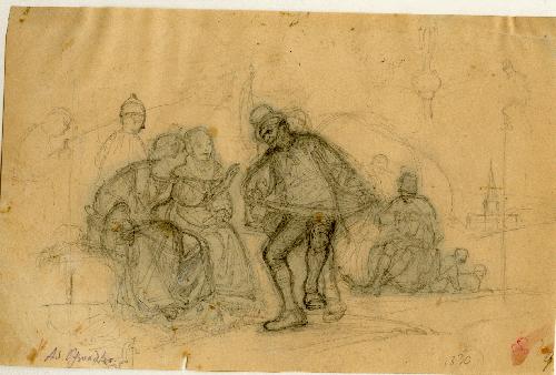 Bleistiftskizze 15,7 mal 24,3 cm.Signiert und datiert Ad.Schrödter 1830.Etwas fleckig und kleiner Ausriß.Mit zwei kl.Papierstreifen rückseitig auf Karton befestigt.Rückseitig Sammlerstempel FH (nicht bei Lugt).Bei Bassenge erworben.Privatverkauf.Fragen bitte vorab klären.Kein Untergebot.versand 8 Euro.
