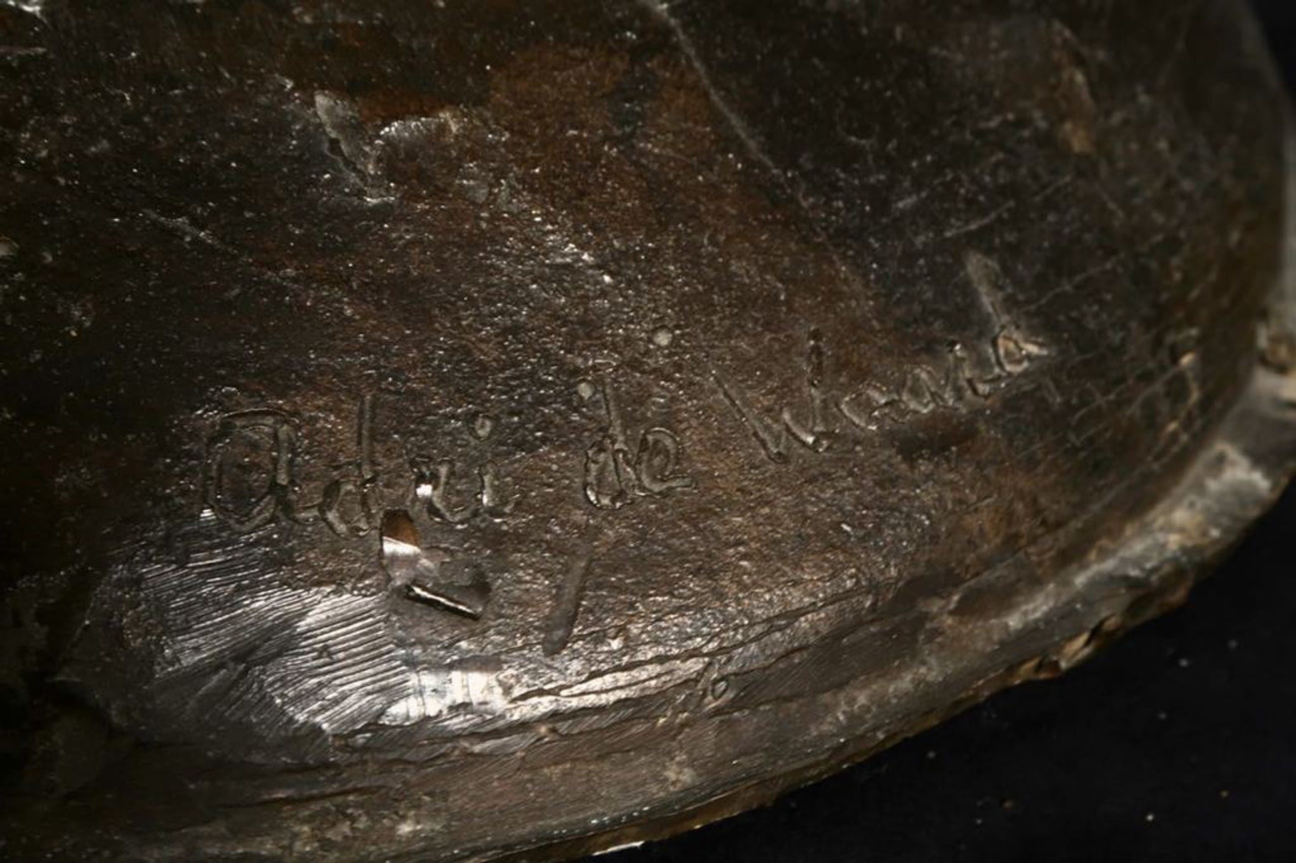 Gesigneerd: Ja, ingekerfd in het beeld (zie foto)