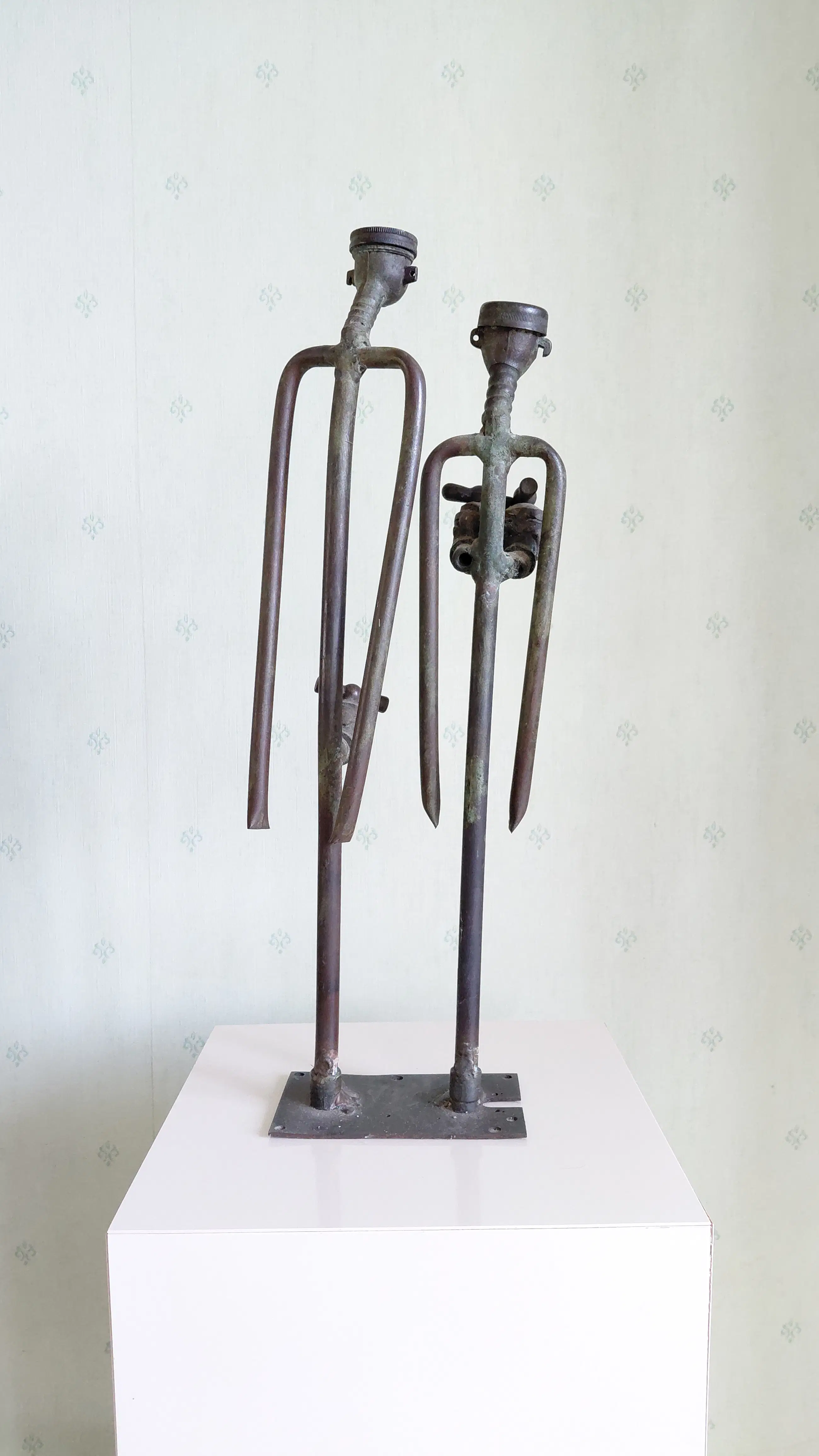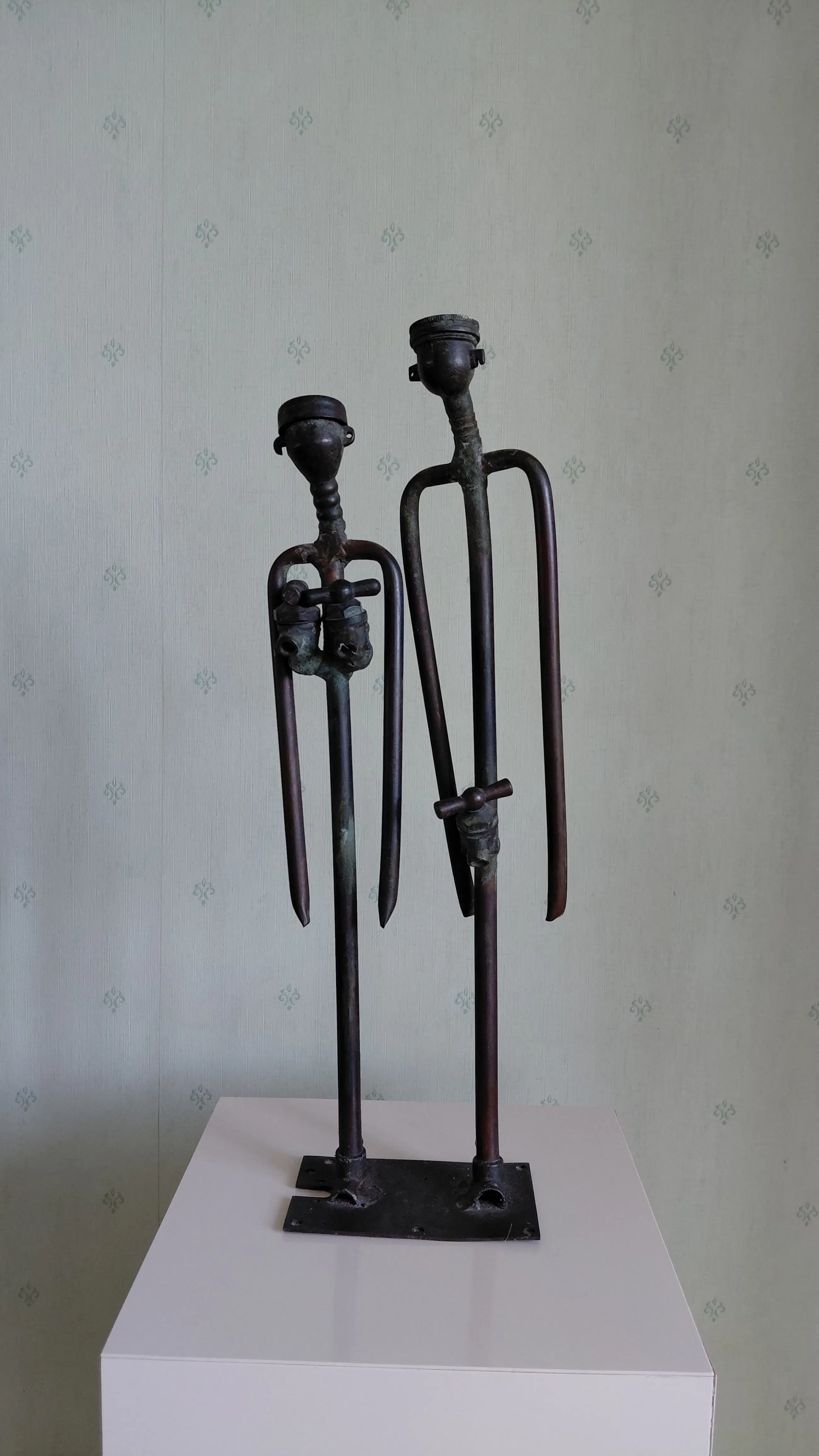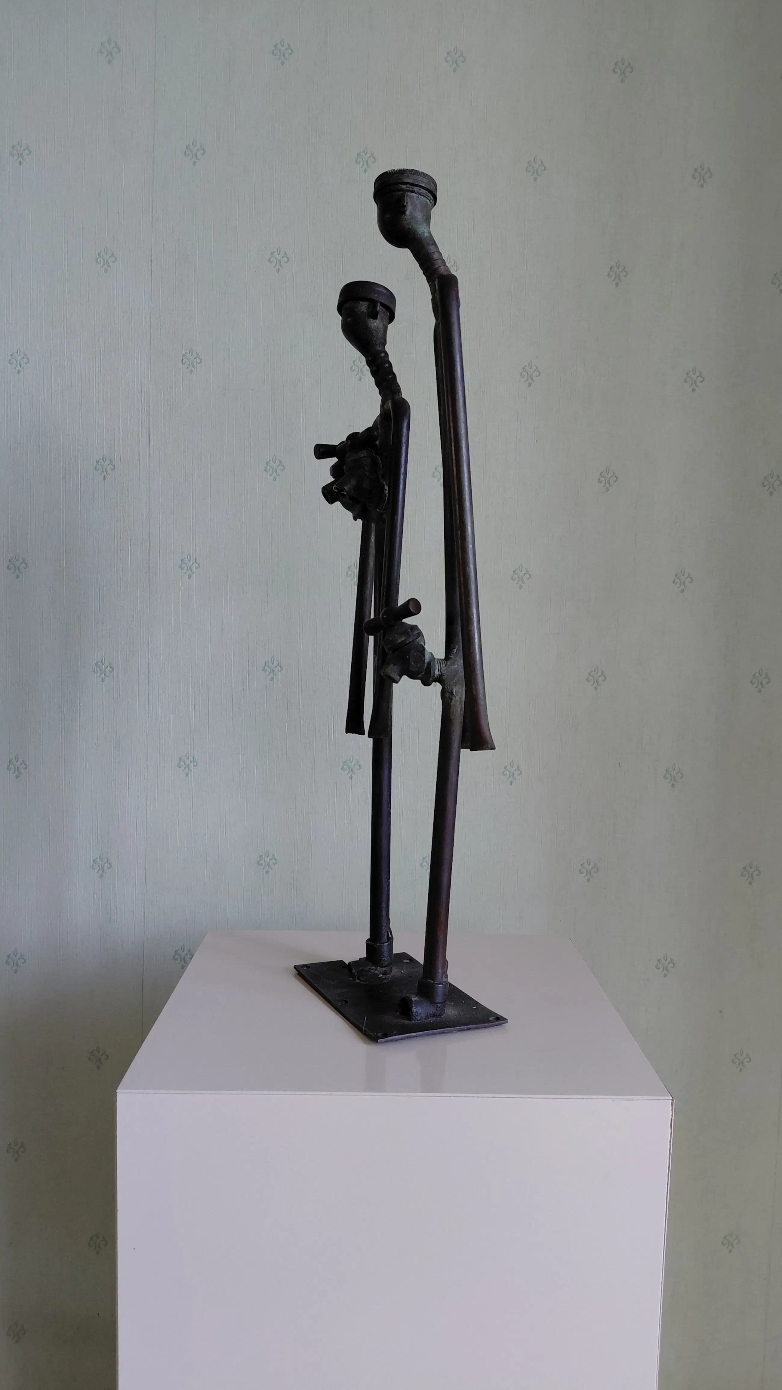Verbronsd beeld van 2 figuren met kranen op kenmerkende plaatsen. Het beeld is ongesigneerd, maar rechtstreeks van de Adri de Waard verkregen.