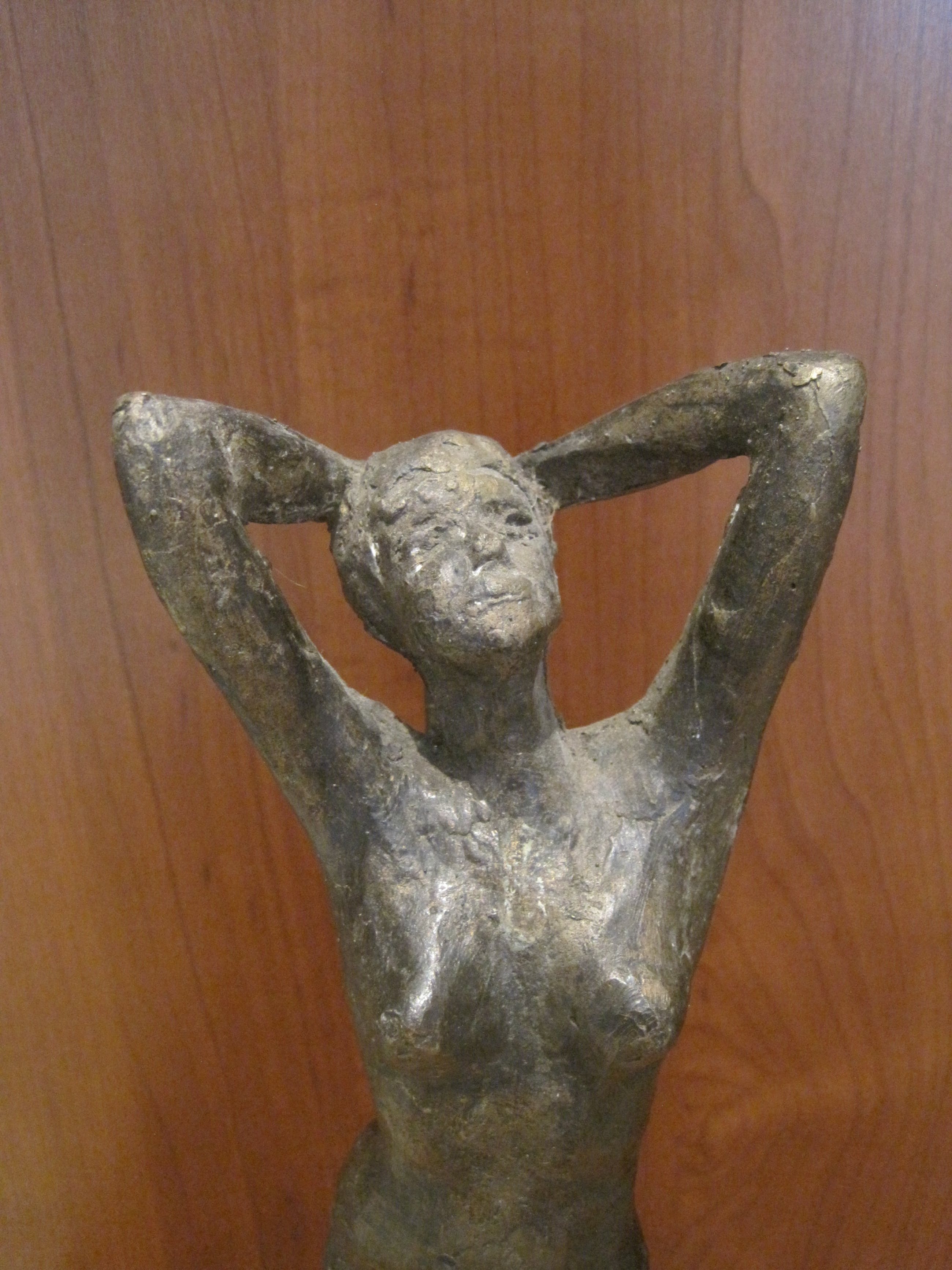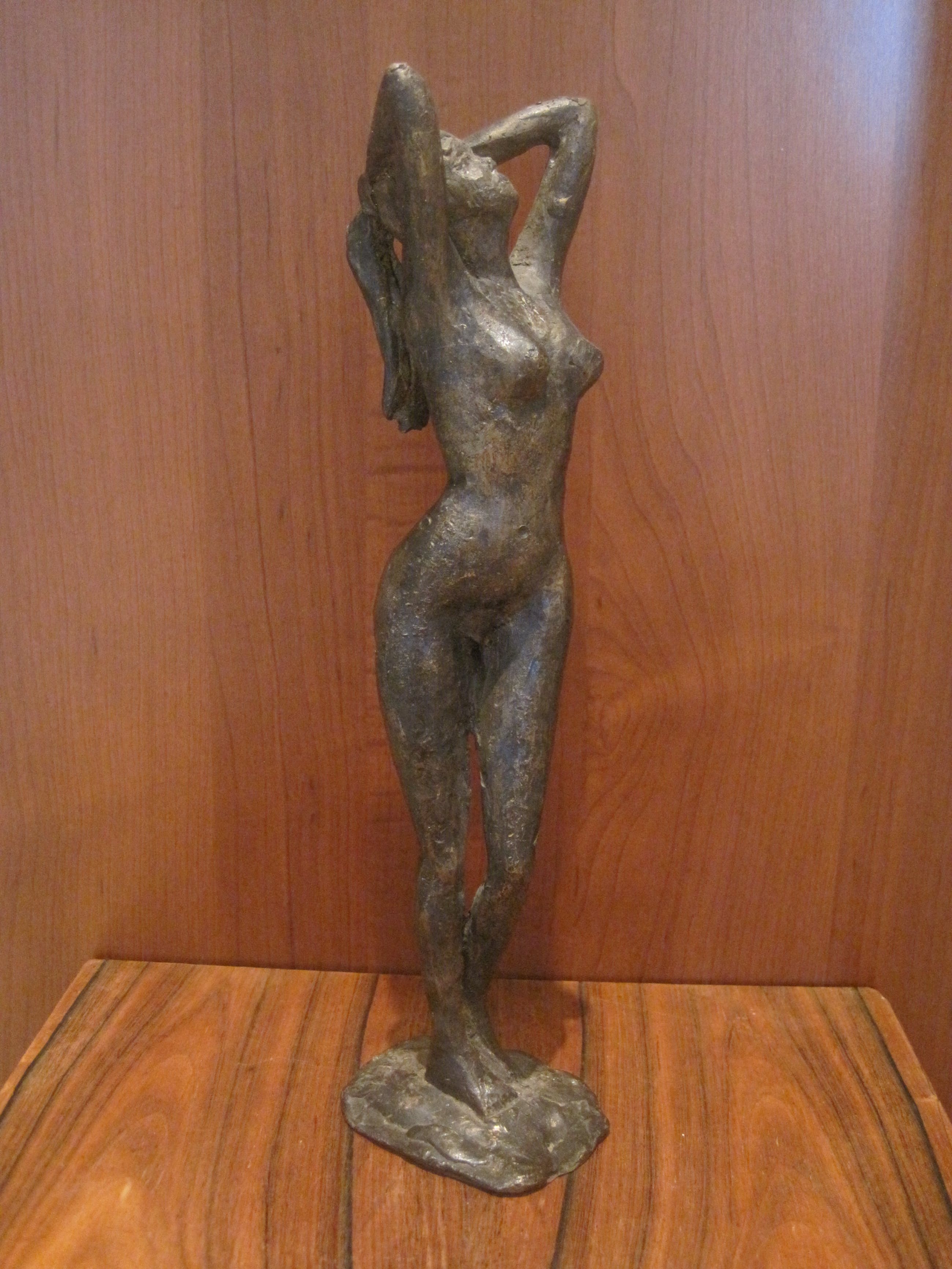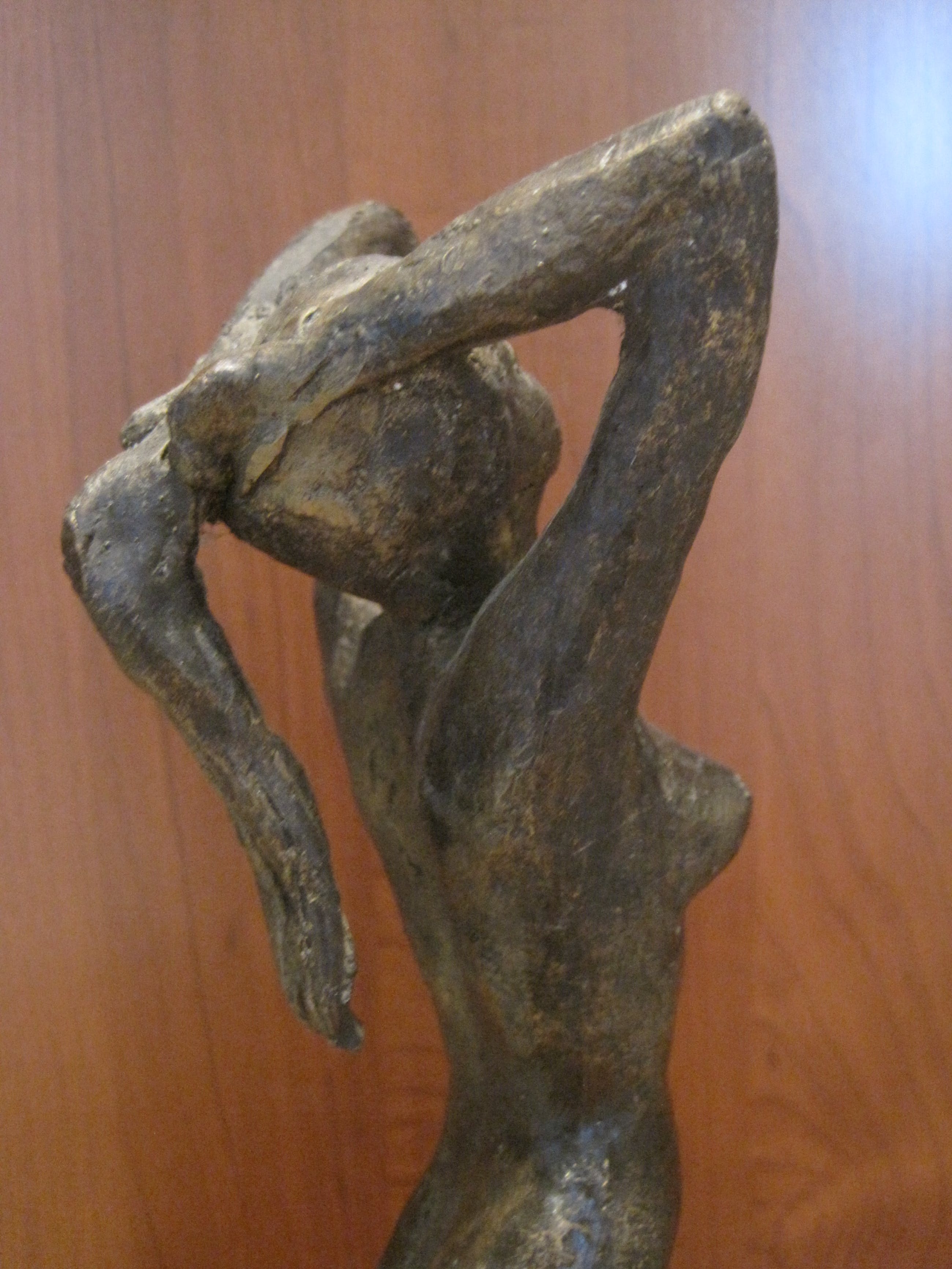 Een massief bronzen beeld van de beeldhouwer Adri de Waard. Een jonge vrouw met een mooie paardenstaart.