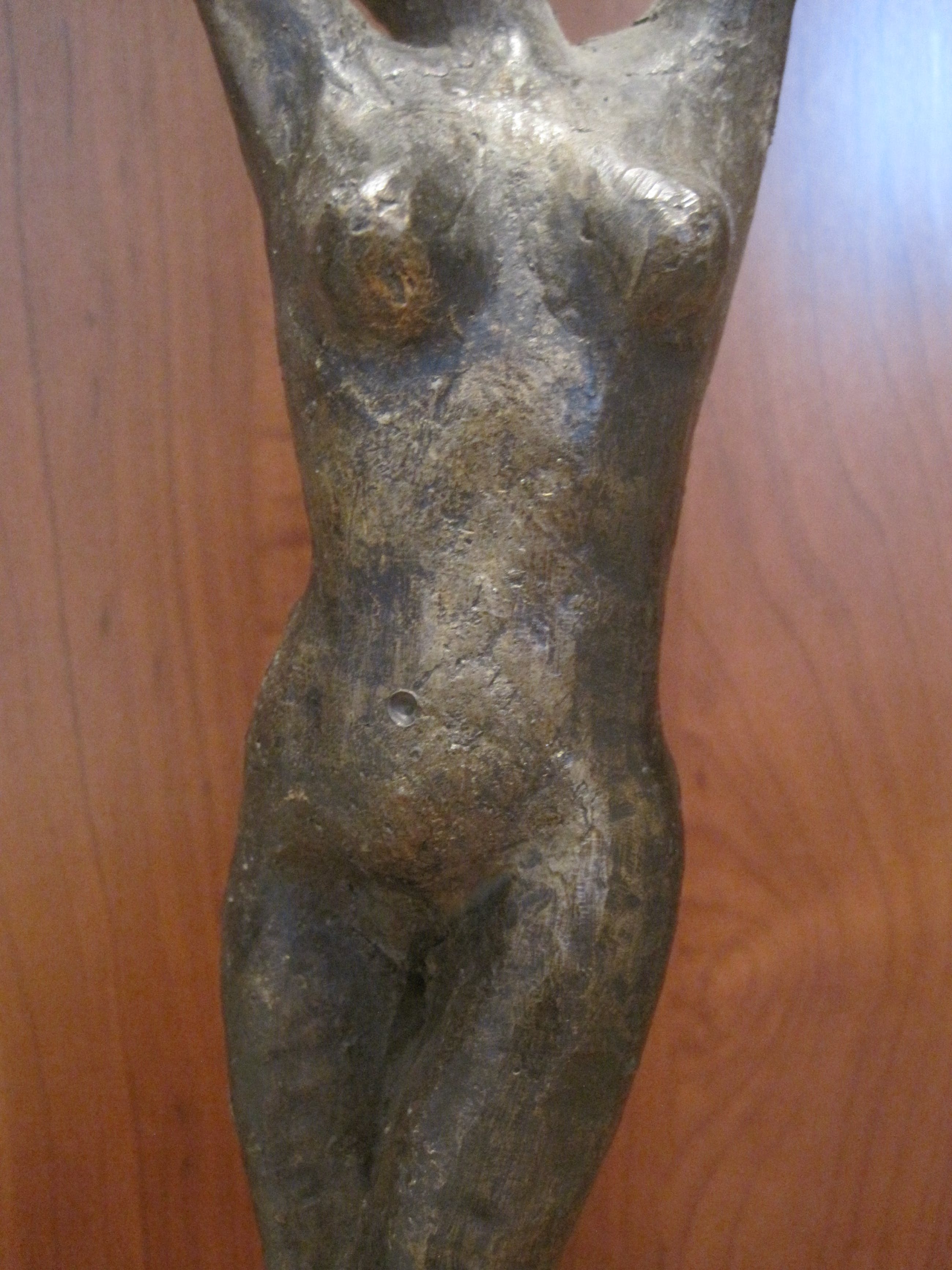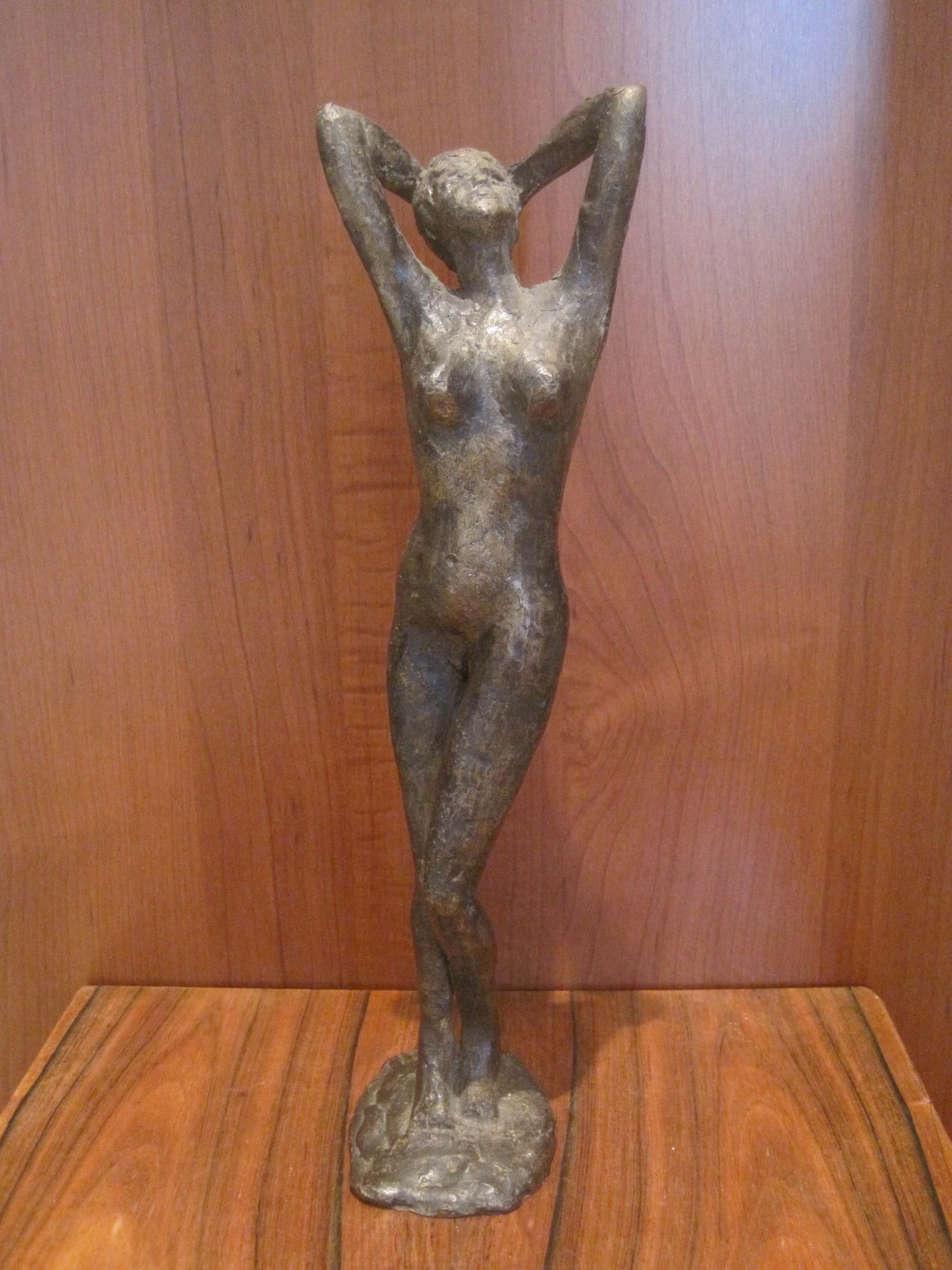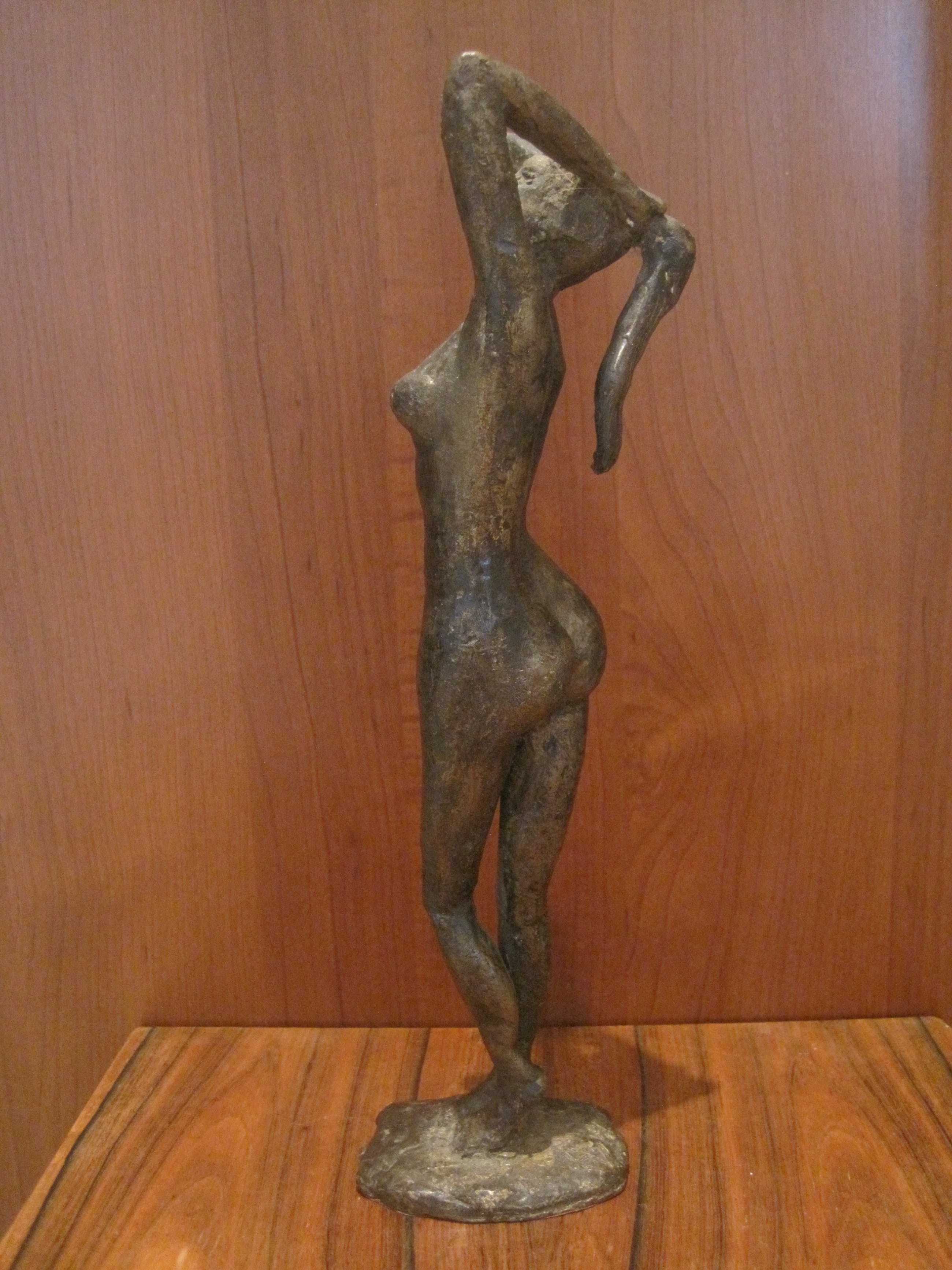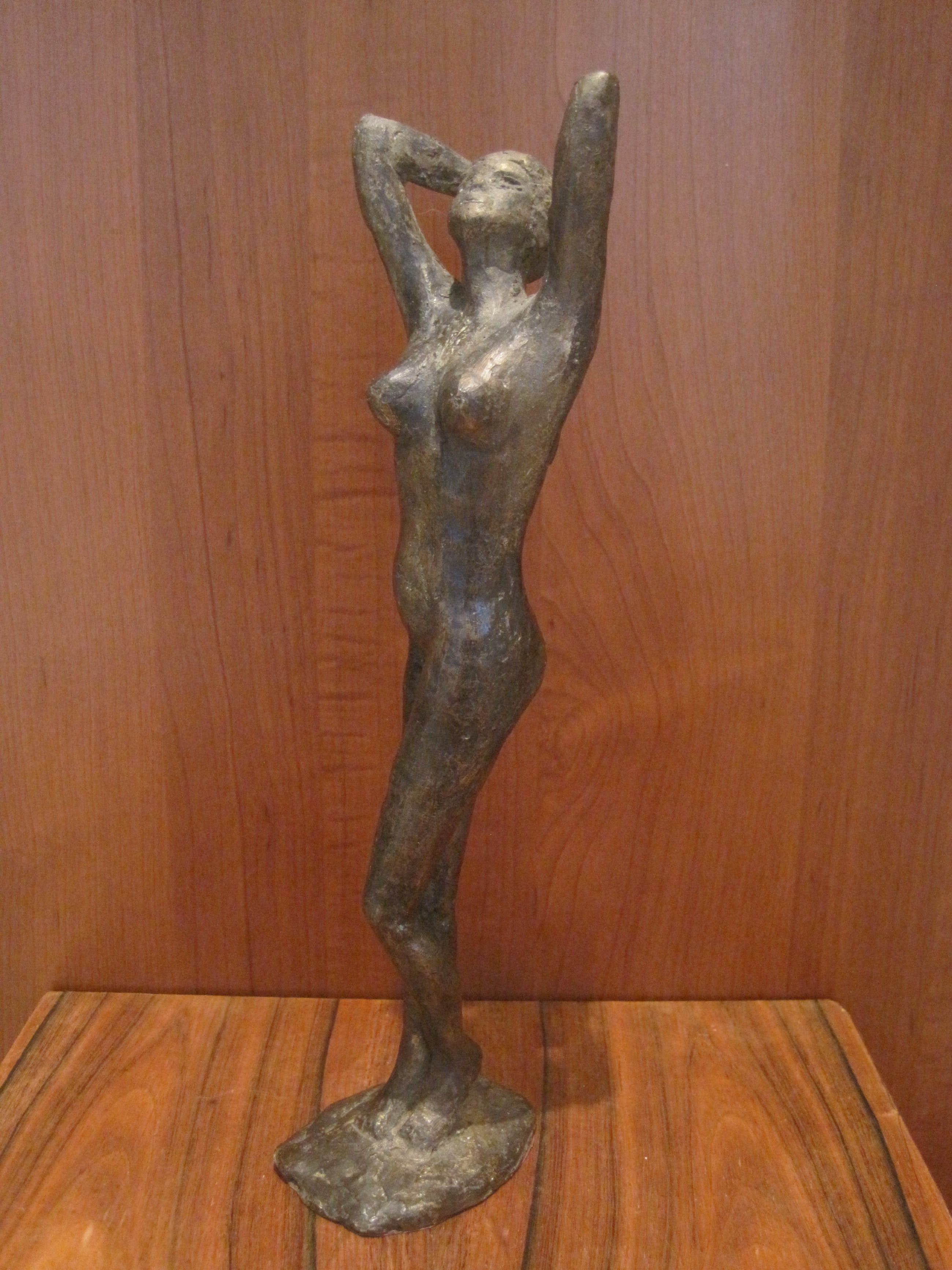 Een massief bronzen beeld van de beeldhouwer Adri de Waard. Een jonge vrouw met een mooie paardenstaart.