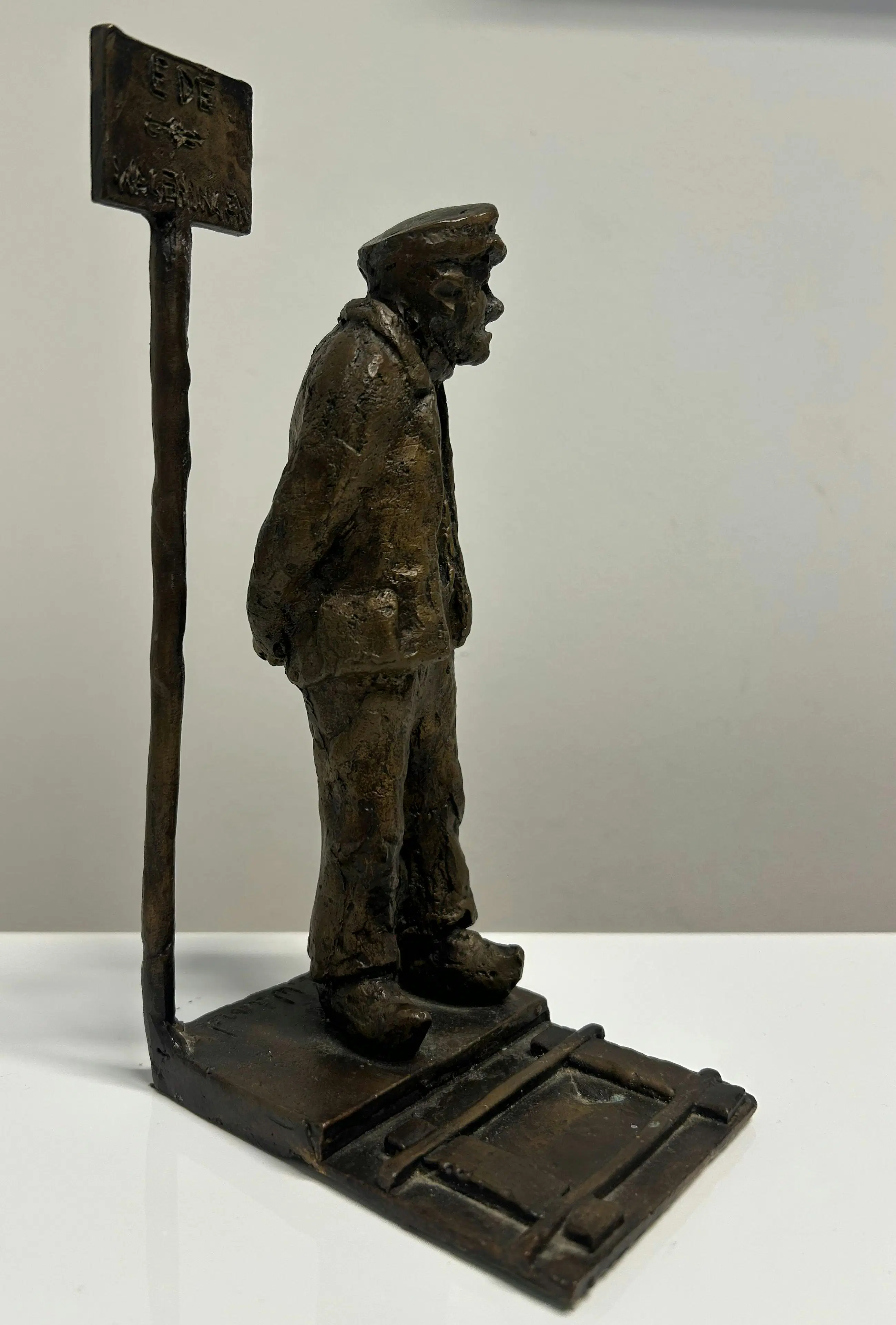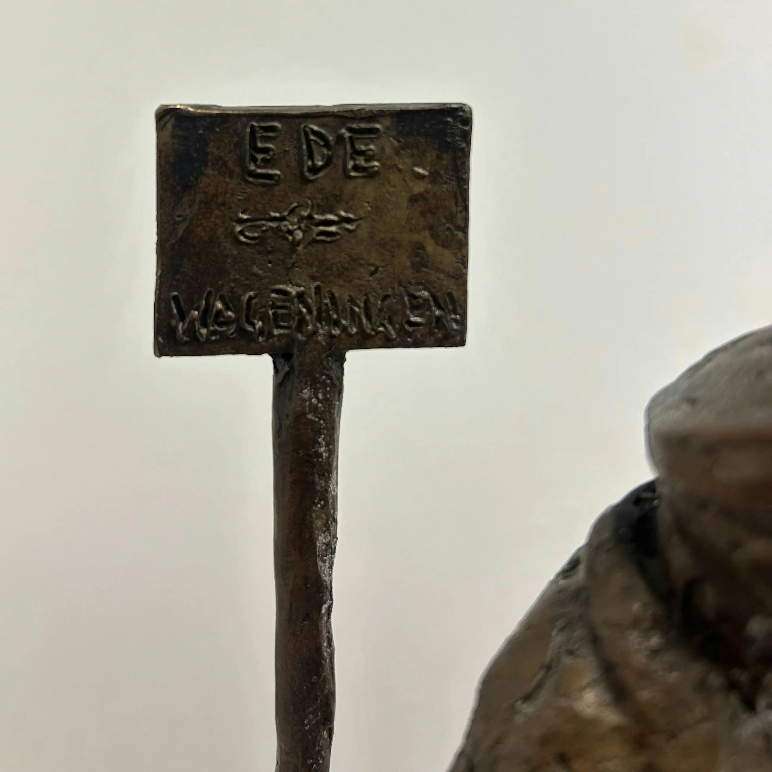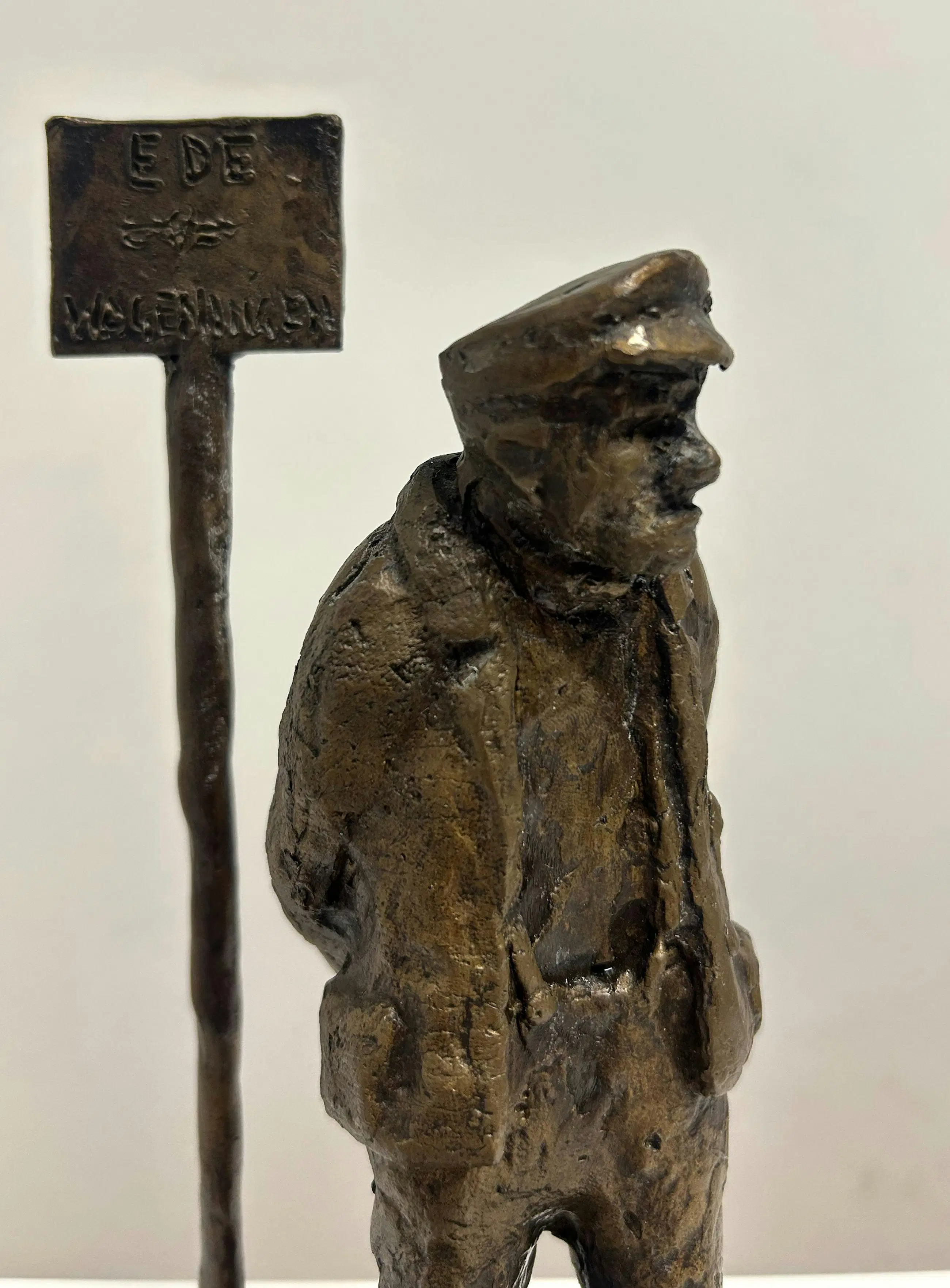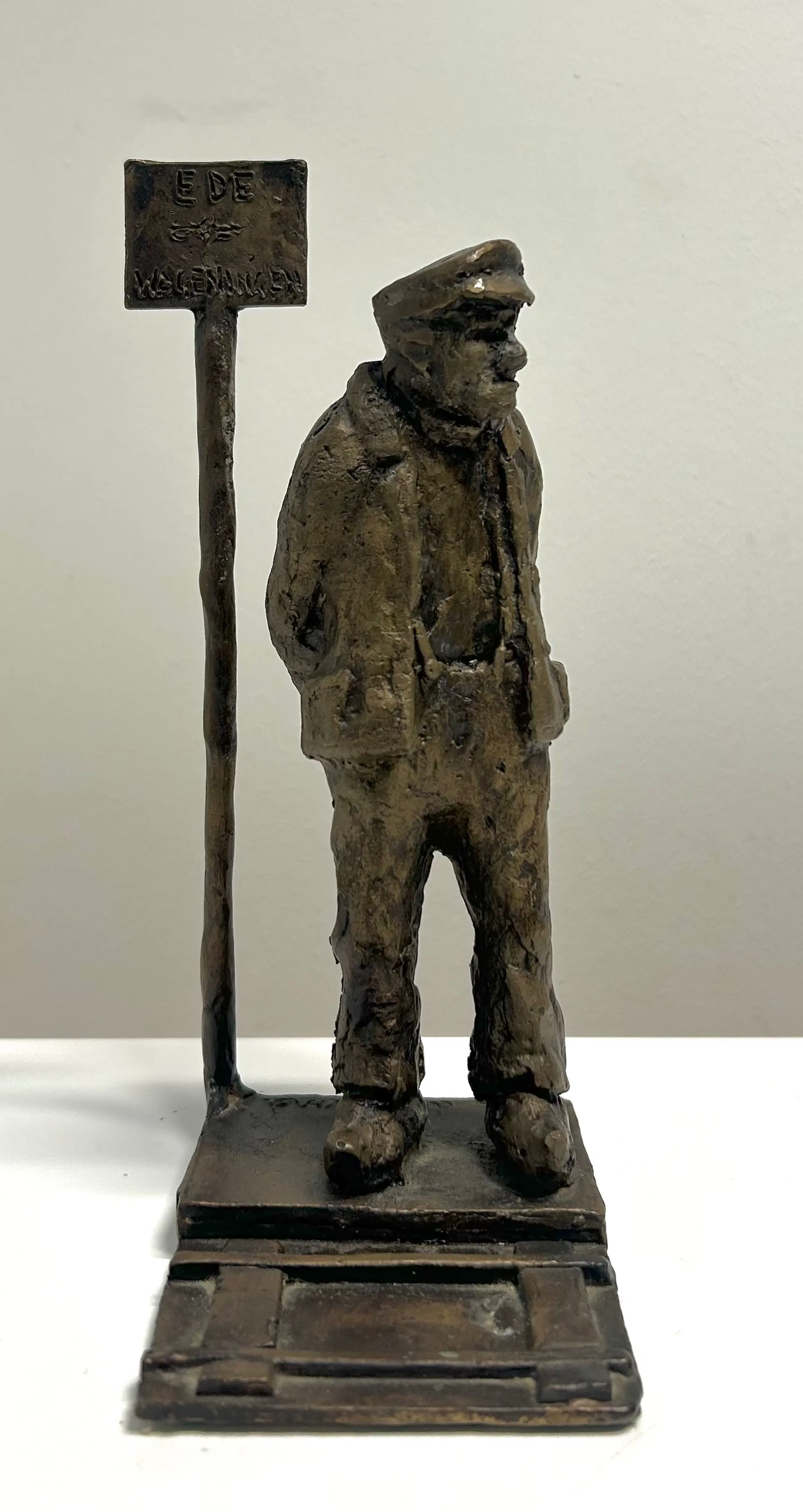 Beeldje van Adri de Waard – wachtende man bij station Ede-Wageningen Mooi en goed bewaard beeldje van een wachtende man bij station Ede-Wageningen (zie het bordje op het werk). Het beeld verkeert in nette staat en toont een lichte verkleuring op de linkerelleboog (zie foto), wat minimaal is en past bij de leeftijd van het object. Voor de rest is het een prachtig en decoratief werk, ideaal voor verzamelaars en liefhebbers van figuratieve kunst. Een mooi stuk dat goed tot zijn recht komt in iedere collectie.